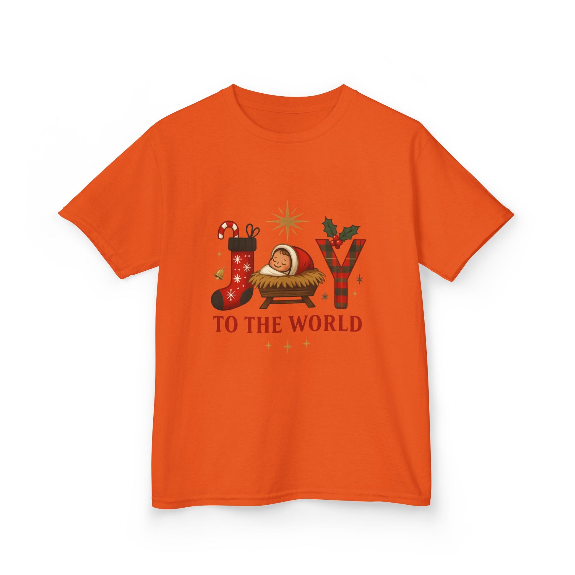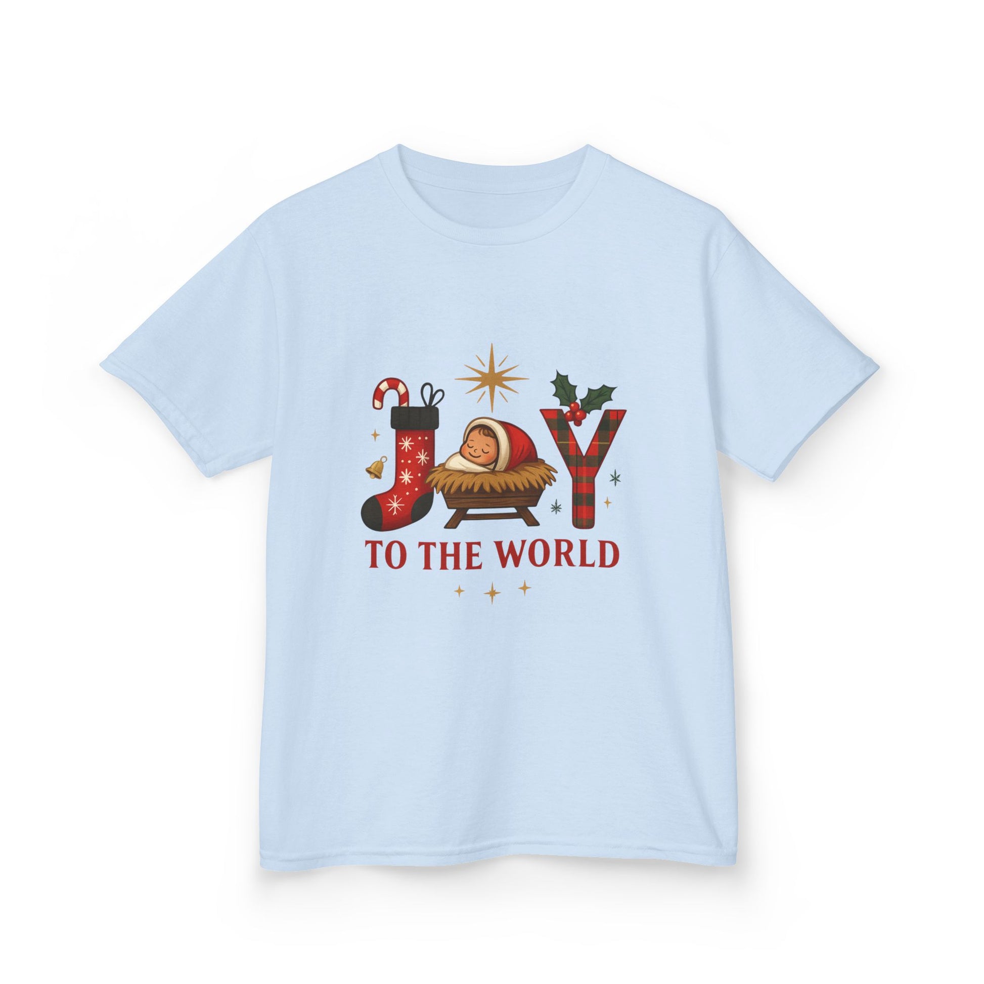 Spread Christmas cheer with this adorable holiday tee! Featuring a festive design with "JOY TO THE WORLD" spelled out with a stocking, Baby Jesus in a manger, and plaid letter Y. Soft, comfortable, and perfect for your little one to wear during the holiday season. This fun graphic tee makes a great Christmas gift!