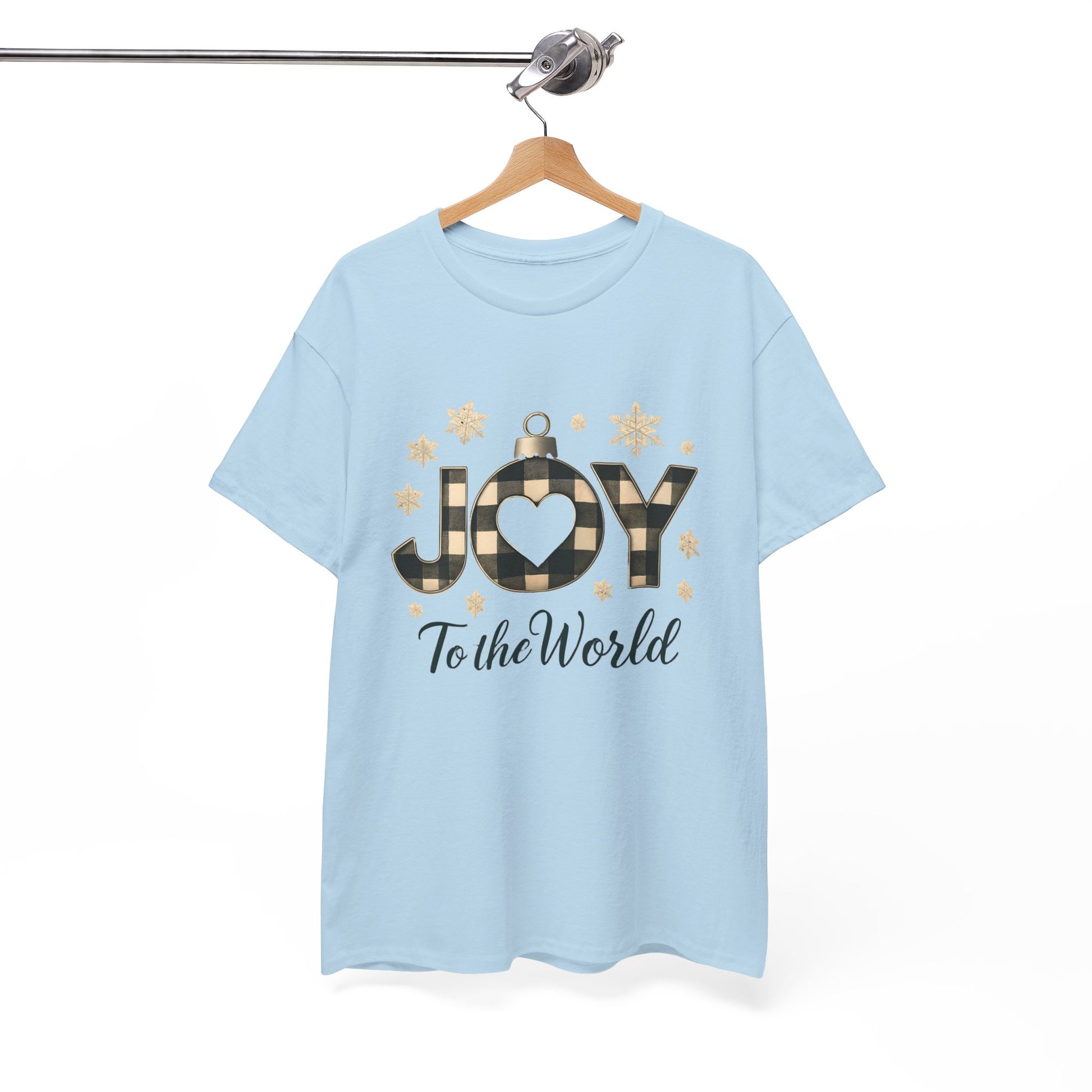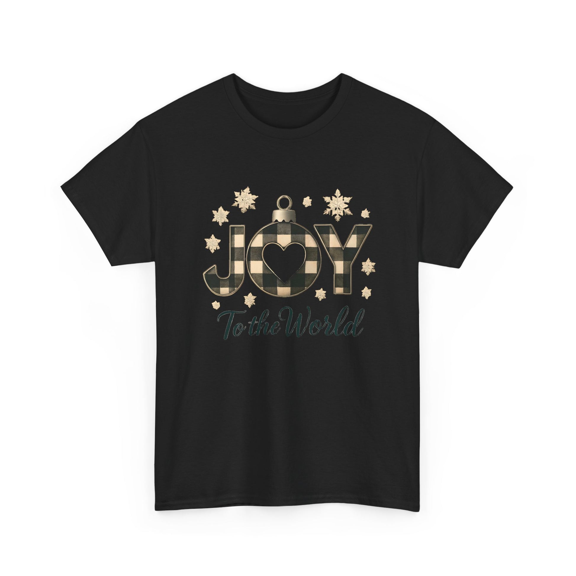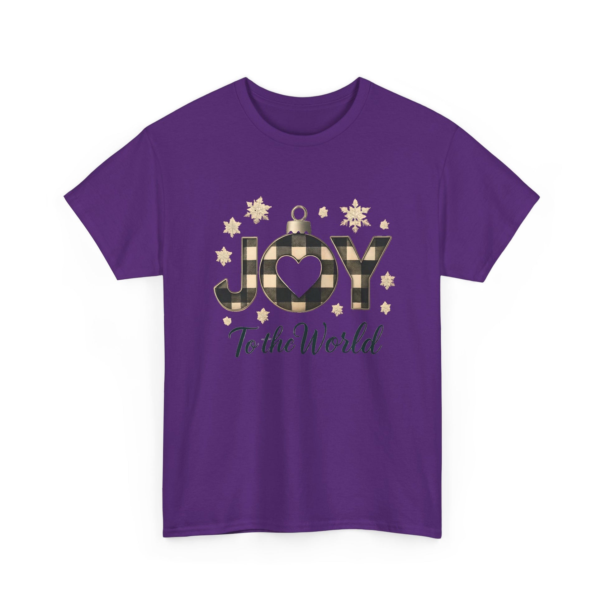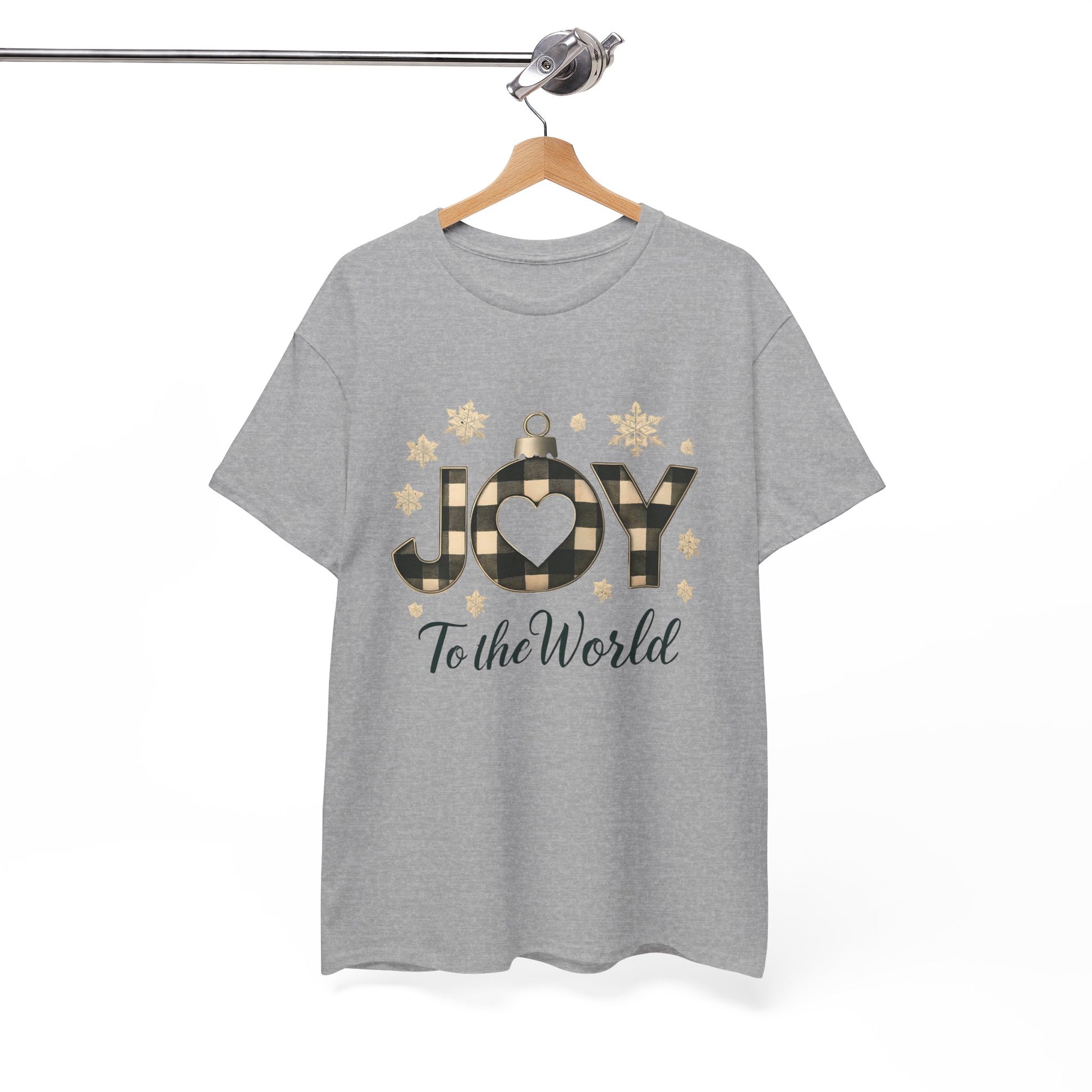 Spread holiday cheer and hope with this inspirational tee! Featuring a festive "JOY" design with an ornament-style "O," buffalo check accents, and snowflakes, this shirt embodies the spirit of giving and support. Below, elegant script spells "To the World", perfect for the season.