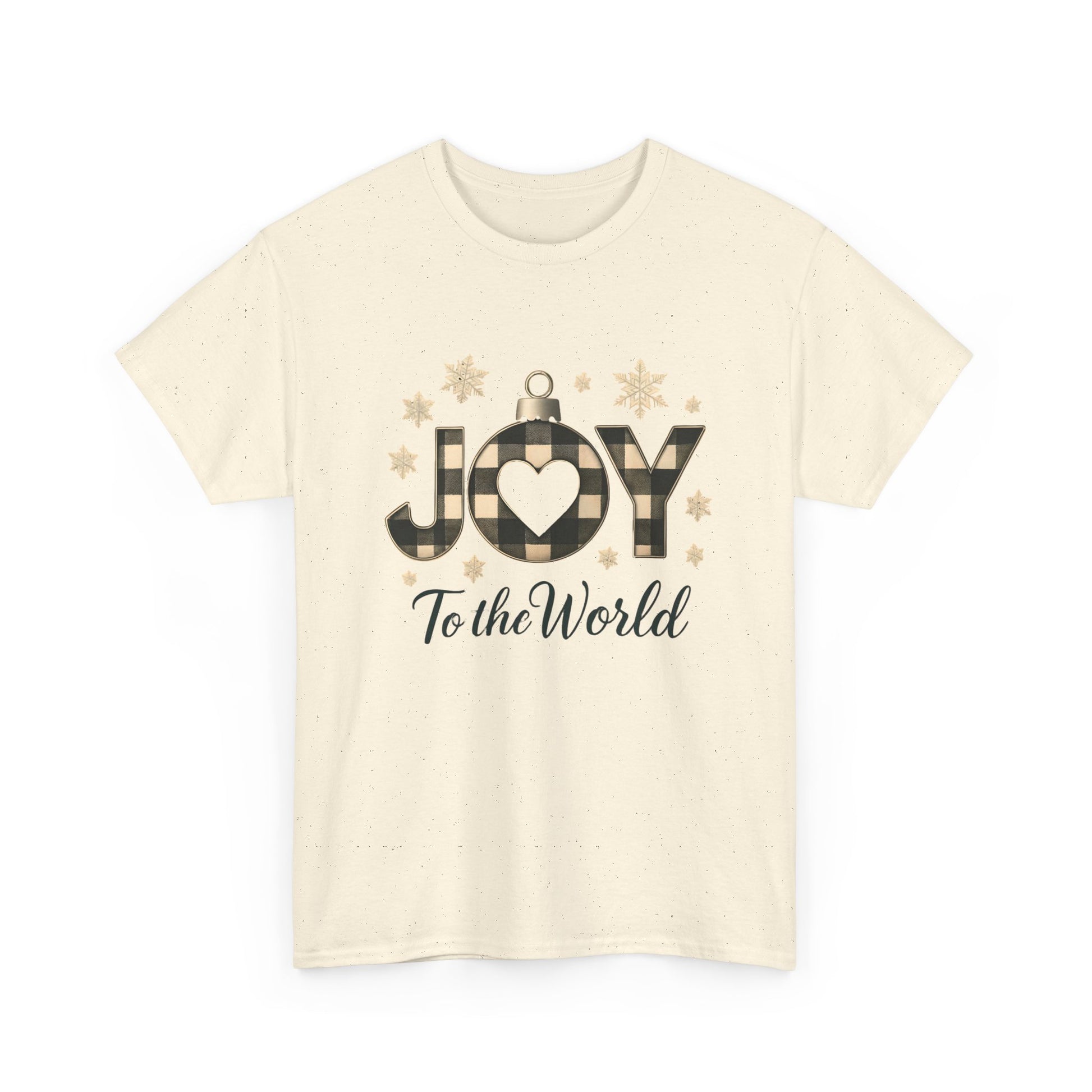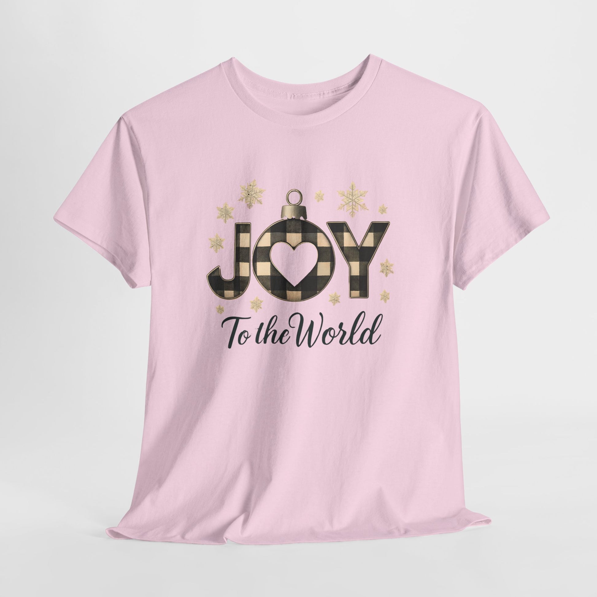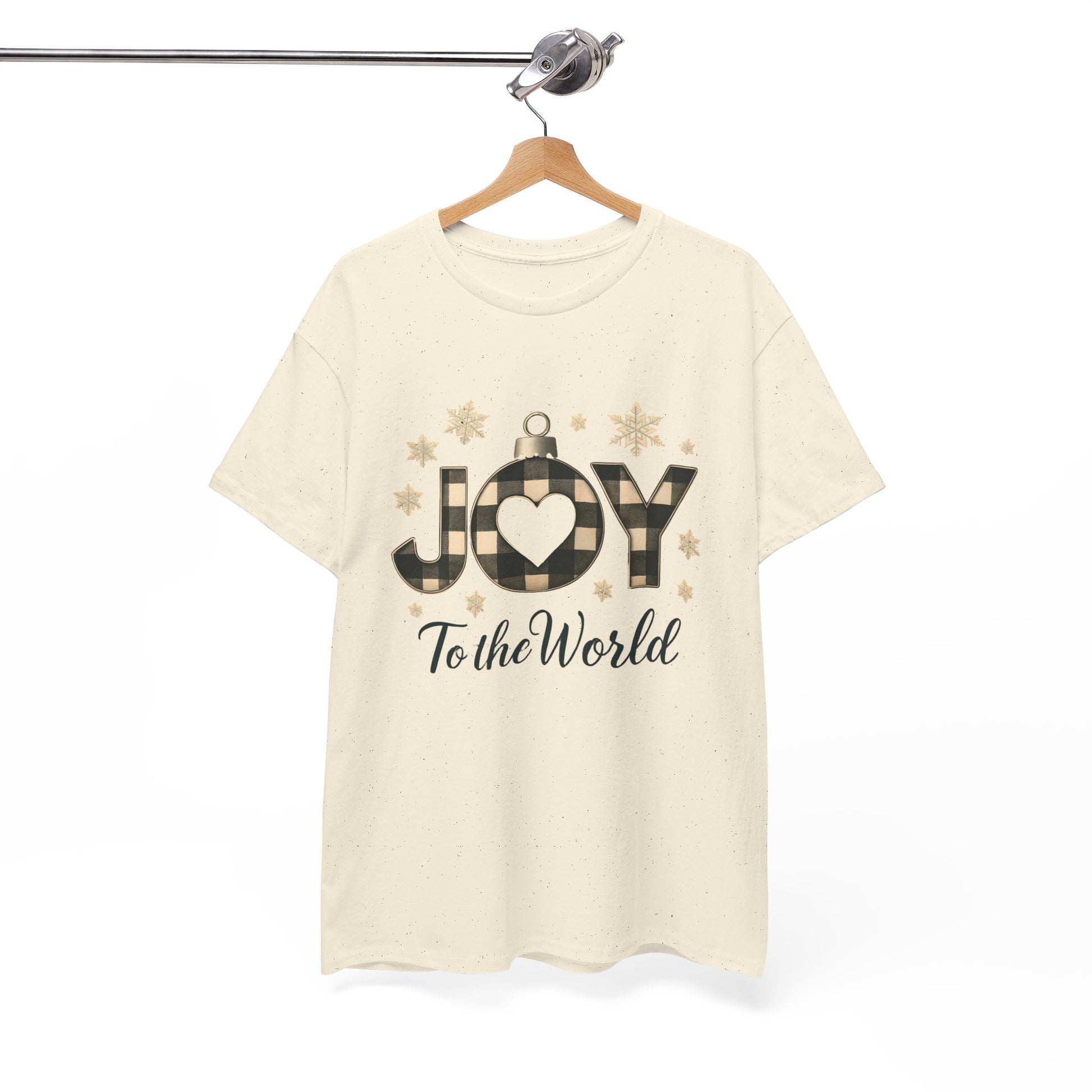 Spread holiday cheer and hope with this inspirational tee! Featuring a festive "JOY" design with an ornament-style "O," buffalo check accents, and snowflakes, this shirt embodies the spirit of giving and support. Below, elegant script spells "To the World", perfect for the season.