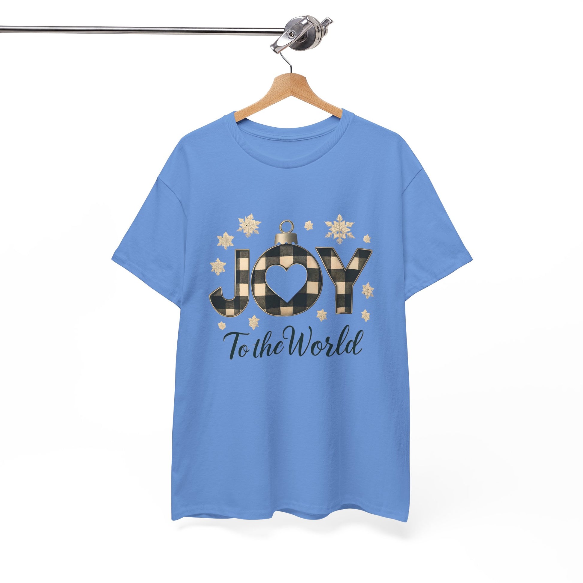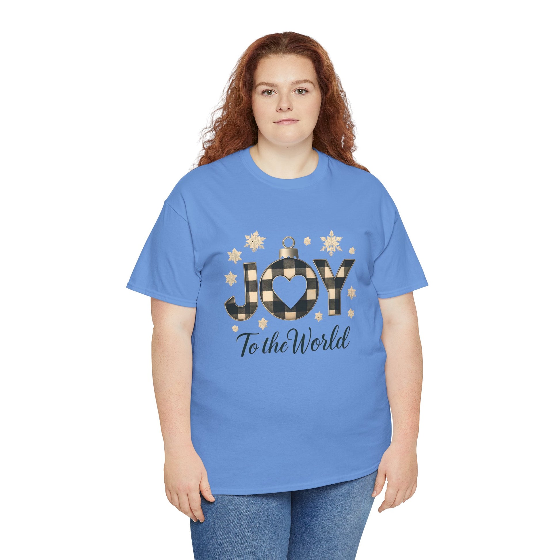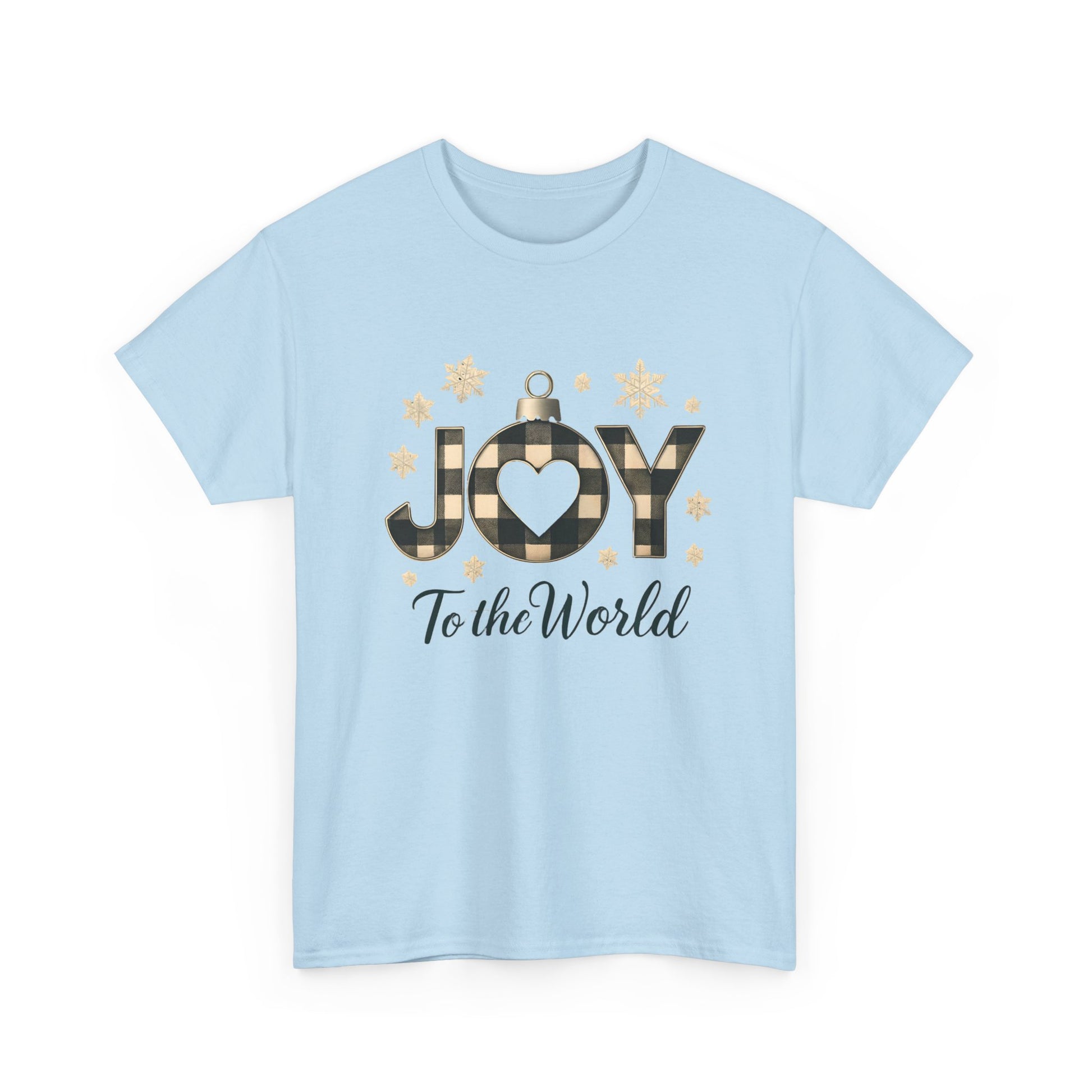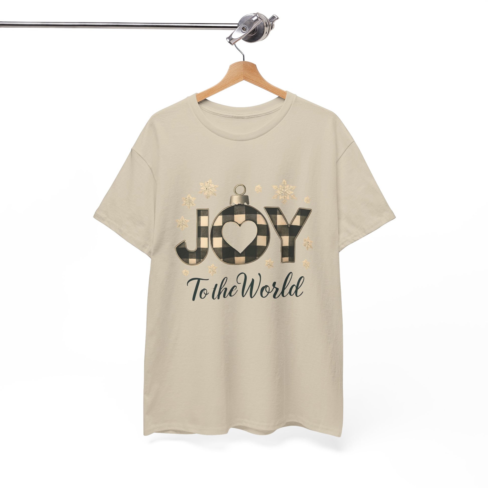 Spread holiday cheer and hope with this inspirational tee! Featuring a festive "JOY" design with an ornament-style "O," buffalo check accents, and snowflakes, this shirt embodies the spirit of giving and support. Below, elegant script spells "To the World", perfect for the season.