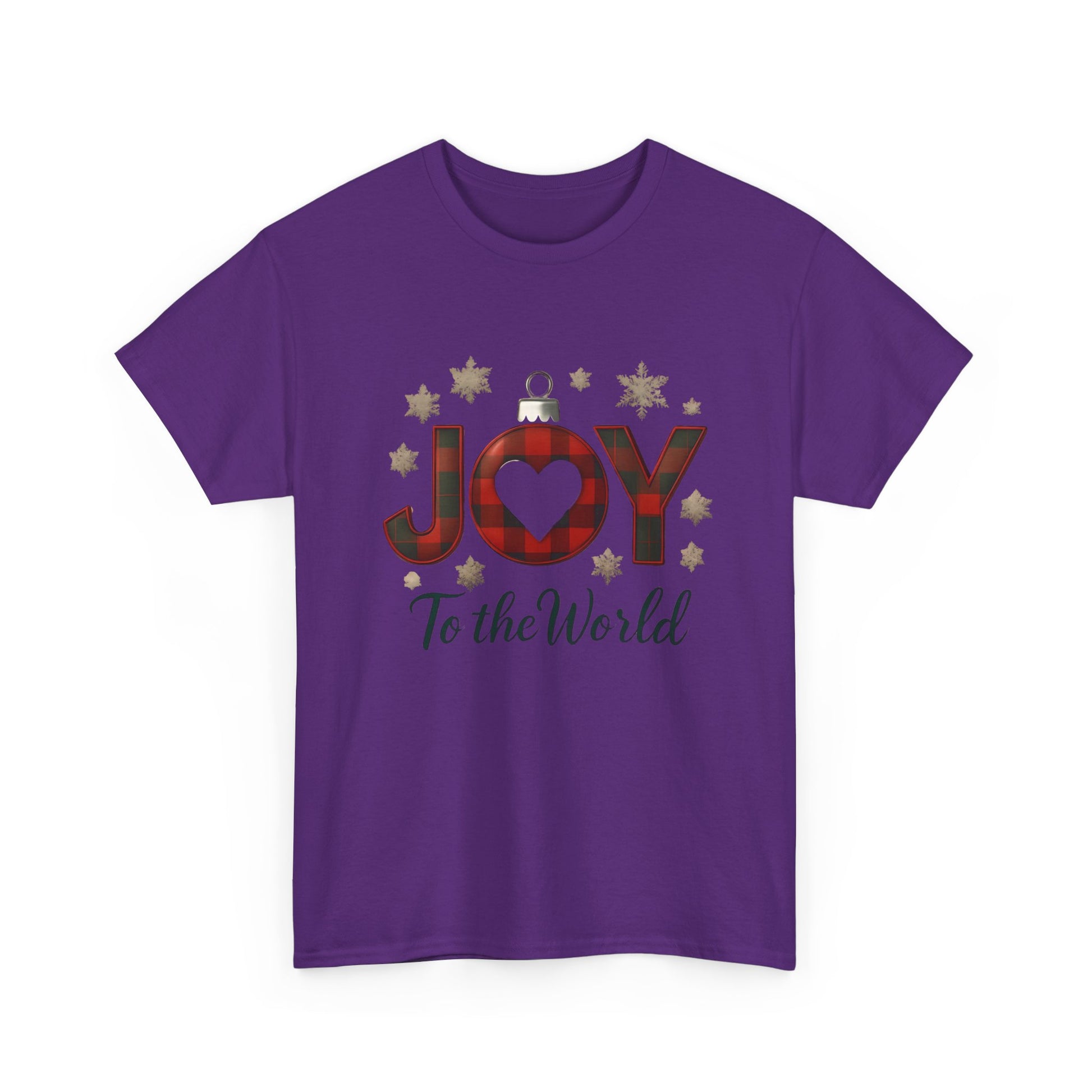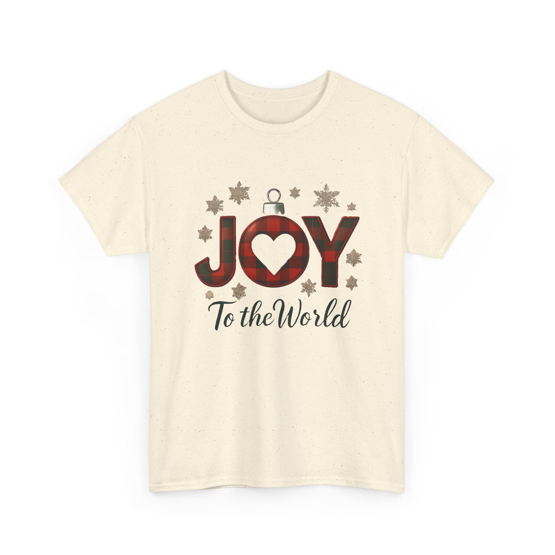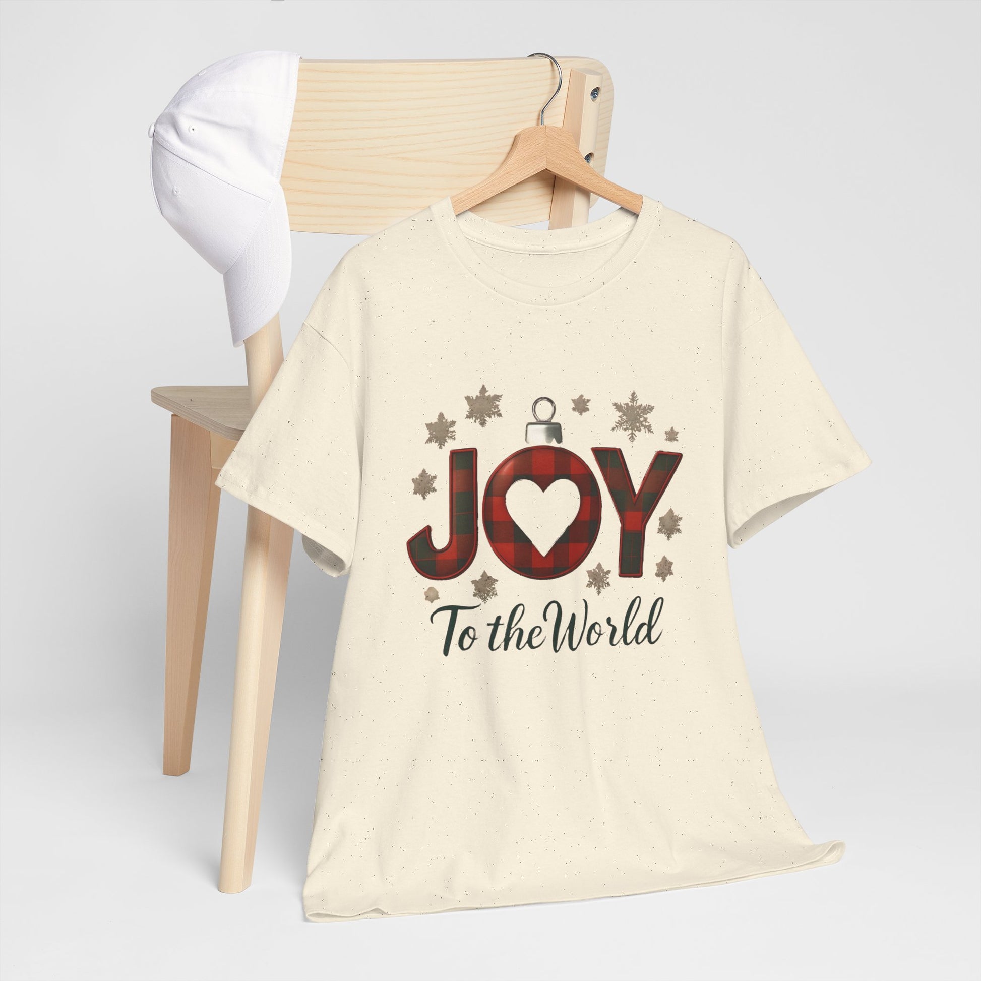 Spread joy and support with our 'Joy to the World' tee! This festive design features a buffalo plaid 'JOY' with a heart-shaped ornament 'O', and flowing 'To the World' script. Gold snowflakes dance around the design, creating a warm, vintage vibe. Perfect for gifts, this empowering tee shares hope, love, and support.