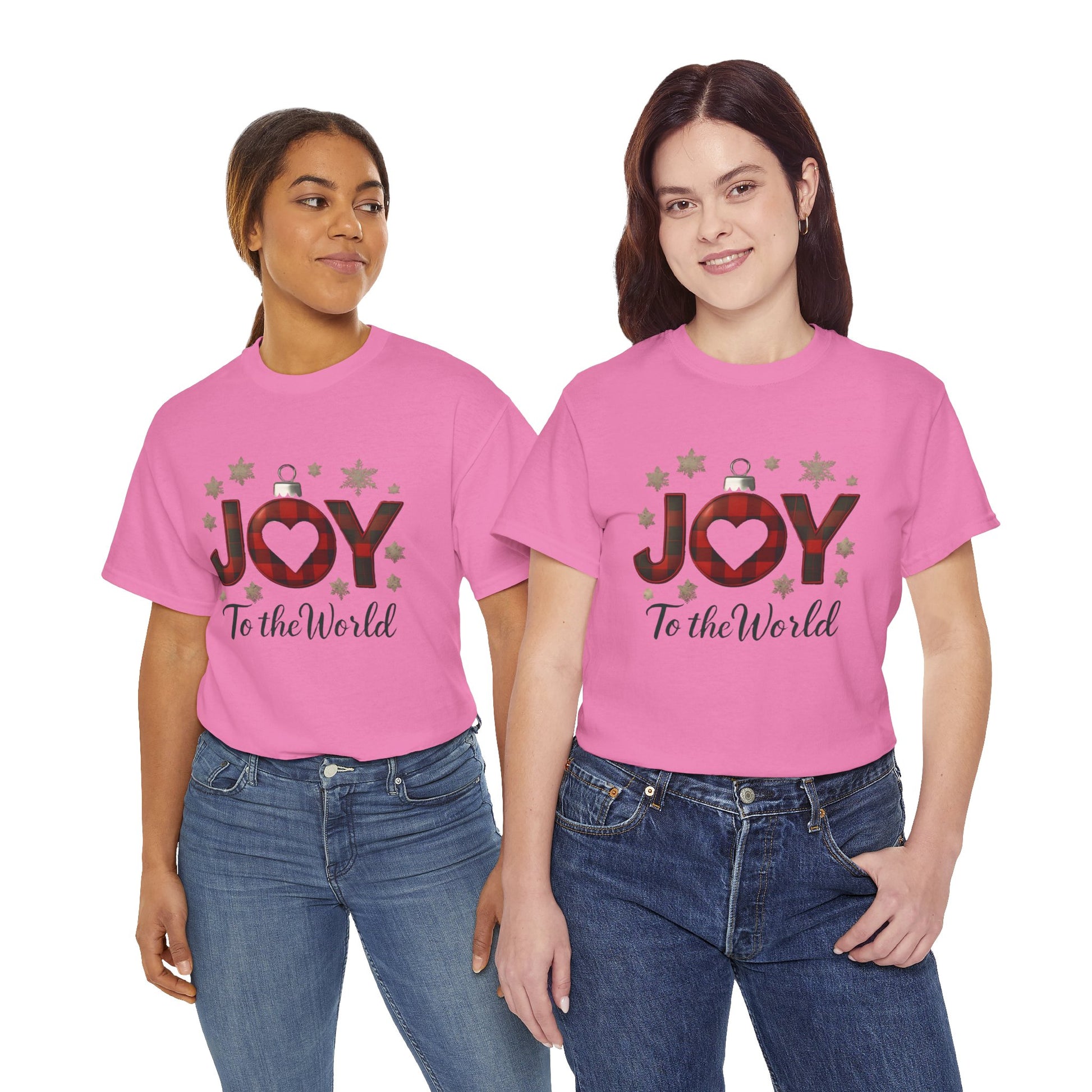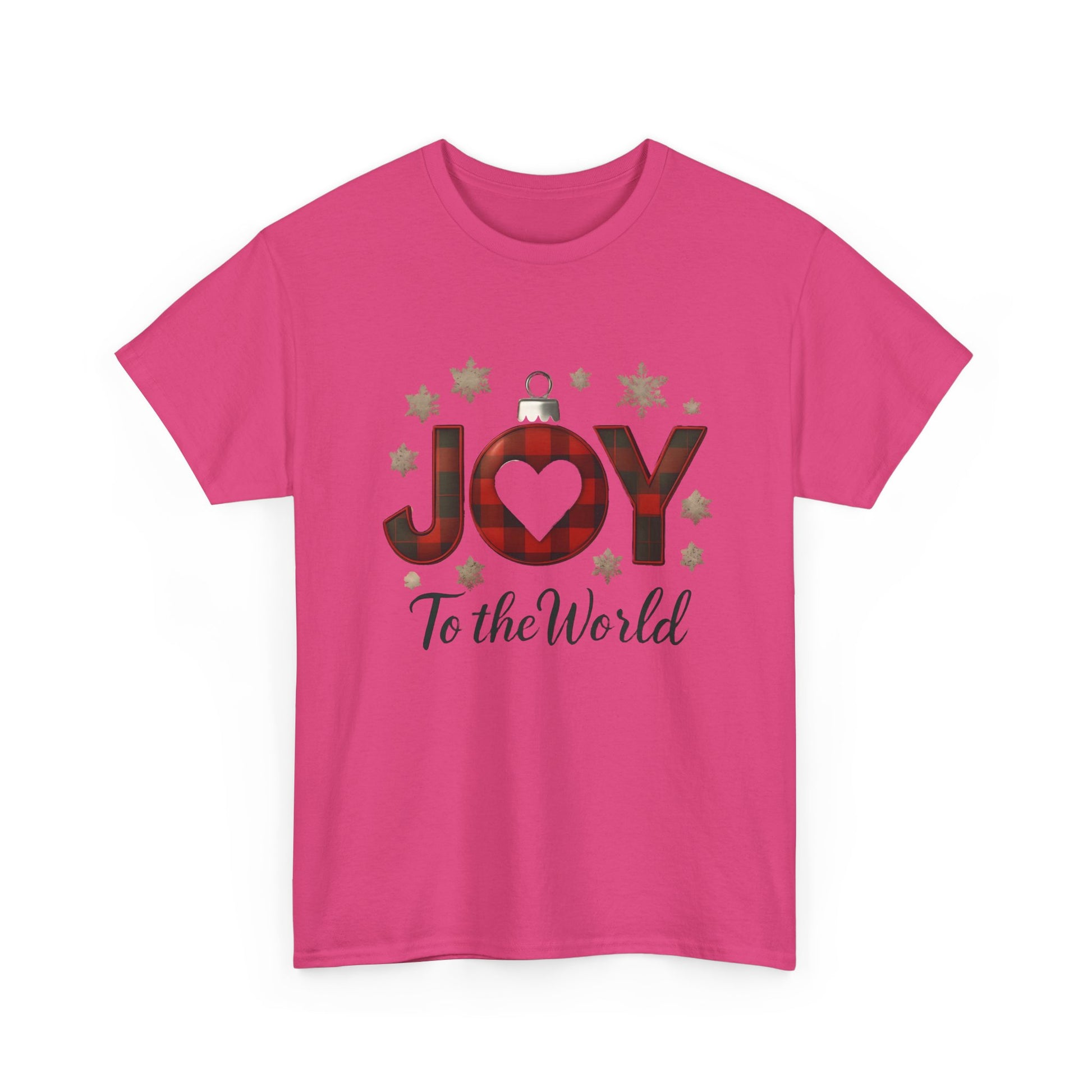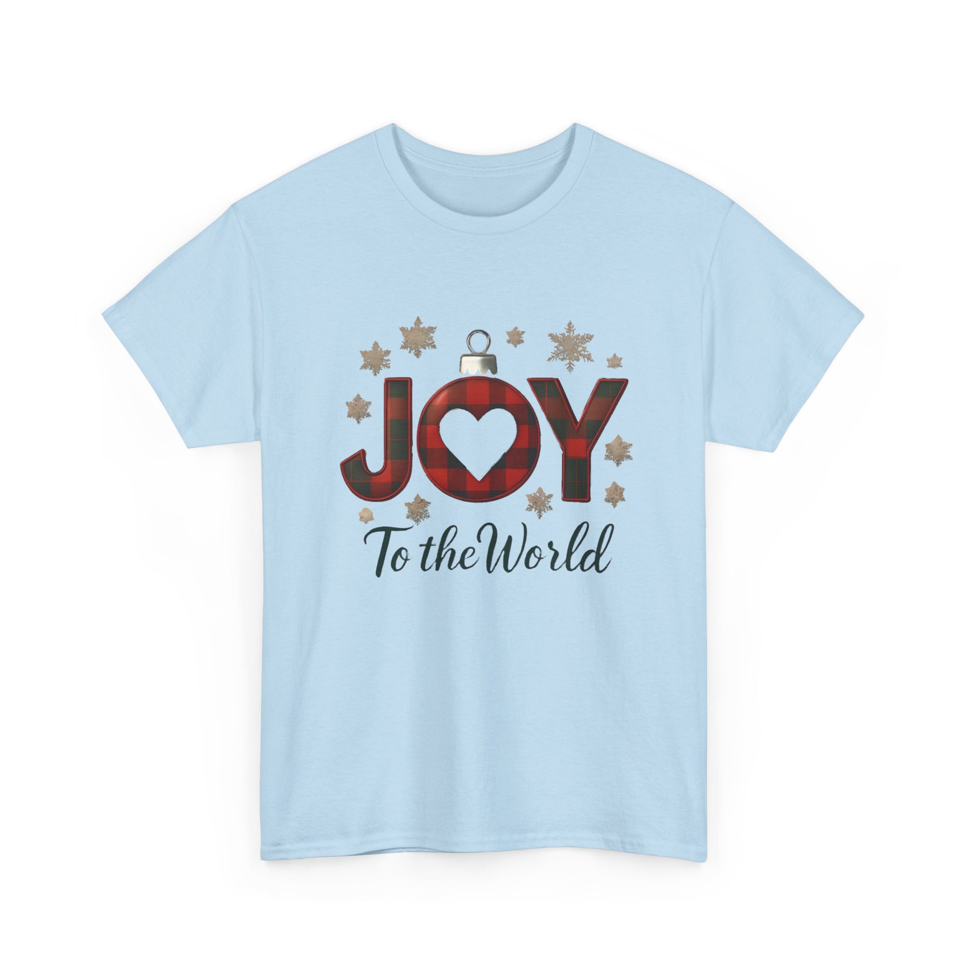 Spread joy and support with our 'Joy to the World' tee! This festive design features a buffalo plaid 'JOY' with a heart-shaped ornament 'O', and flowing 'To the World' script. Gold snowflakes dance around the design, creating a warm, vintage vibe. Perfect for gifts, this empowering tee shares hope, love, and support.