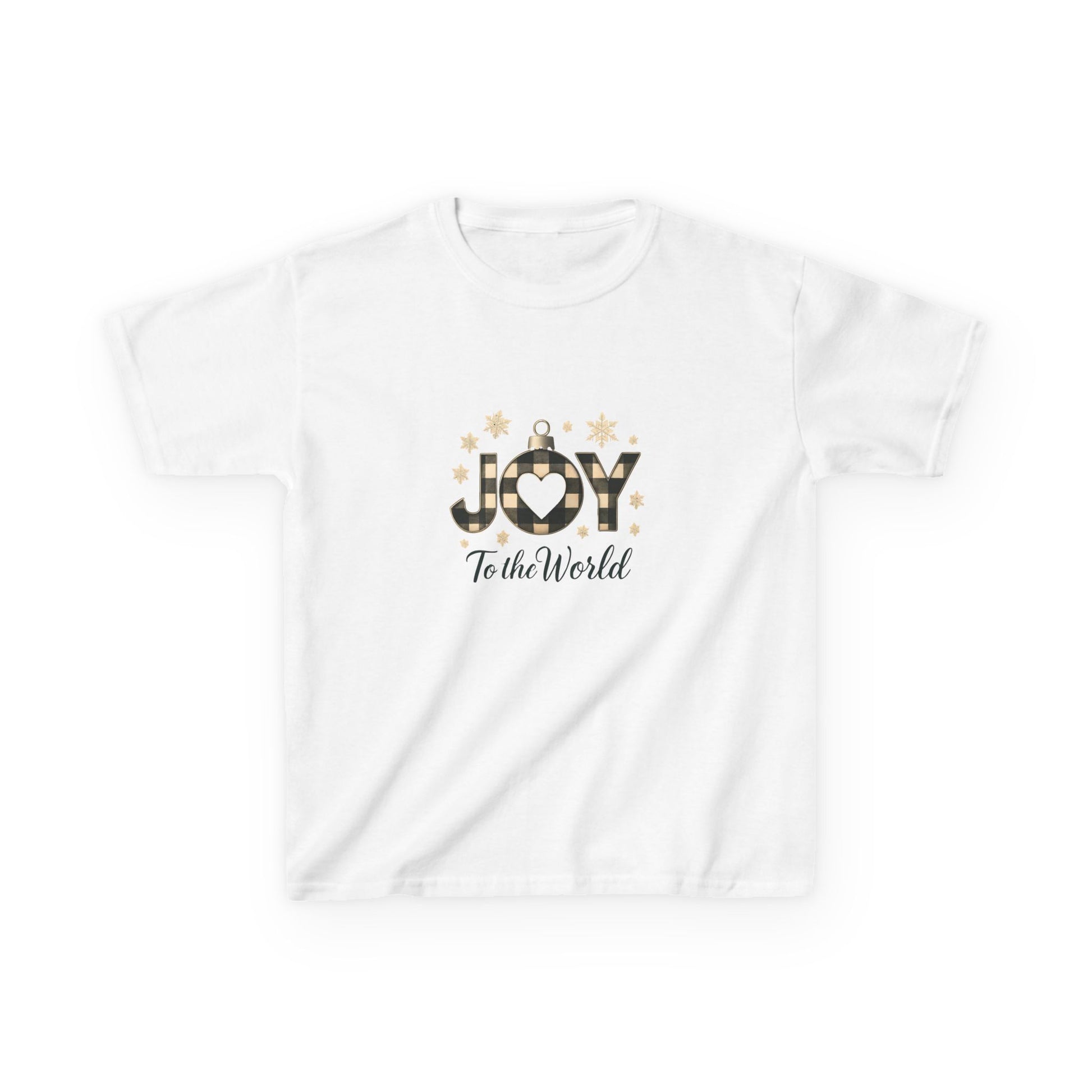 Spread holiday cheer with this adorable Christmas tee! Featuring a festive 'JOY' design, with the 'J' and 'Y' in buffalo check and the 'O' as a Christmas ornament complete with a heart cutout. 'To the World' is written in an elegant cursive, all set on a soft, off-white background with gold snowflakes. Perfect for kids who love dinosaurs and the holiday season, this shirt is a great gift or party outfit! Crafted for comfort and style.