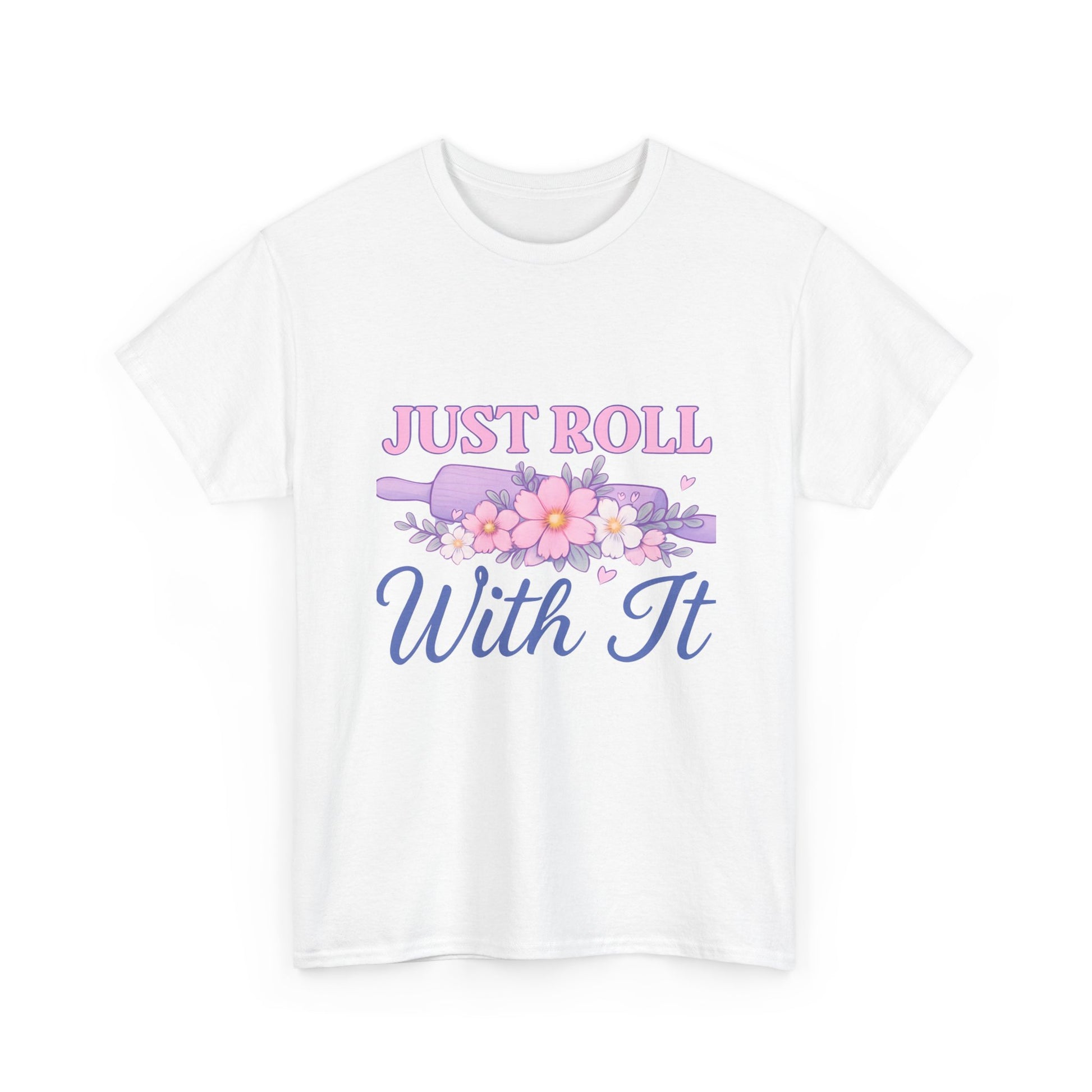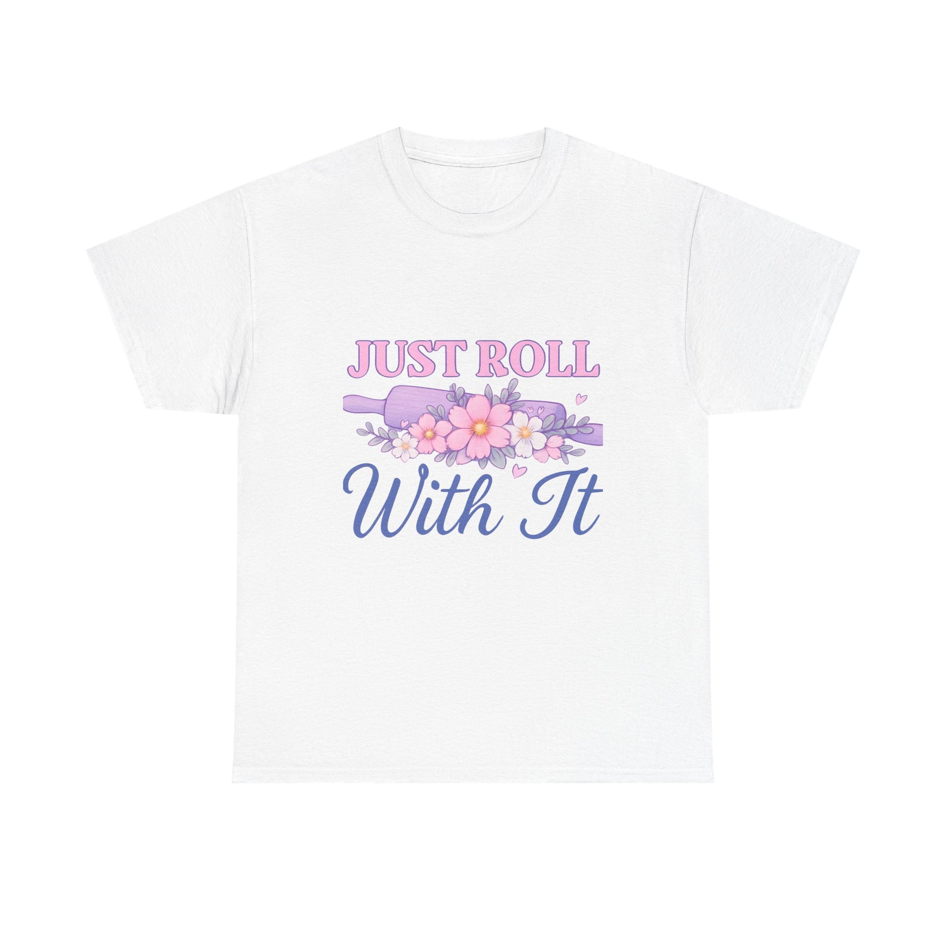 'Just Roll With It' tee features a whimsical design of a floral-adorned rolling pin, encouraging resilience. Made with soft, comfortable fabric, this unisex tee is perfect for your favorite baker. A thoughtful gift for yourself or a loved one.