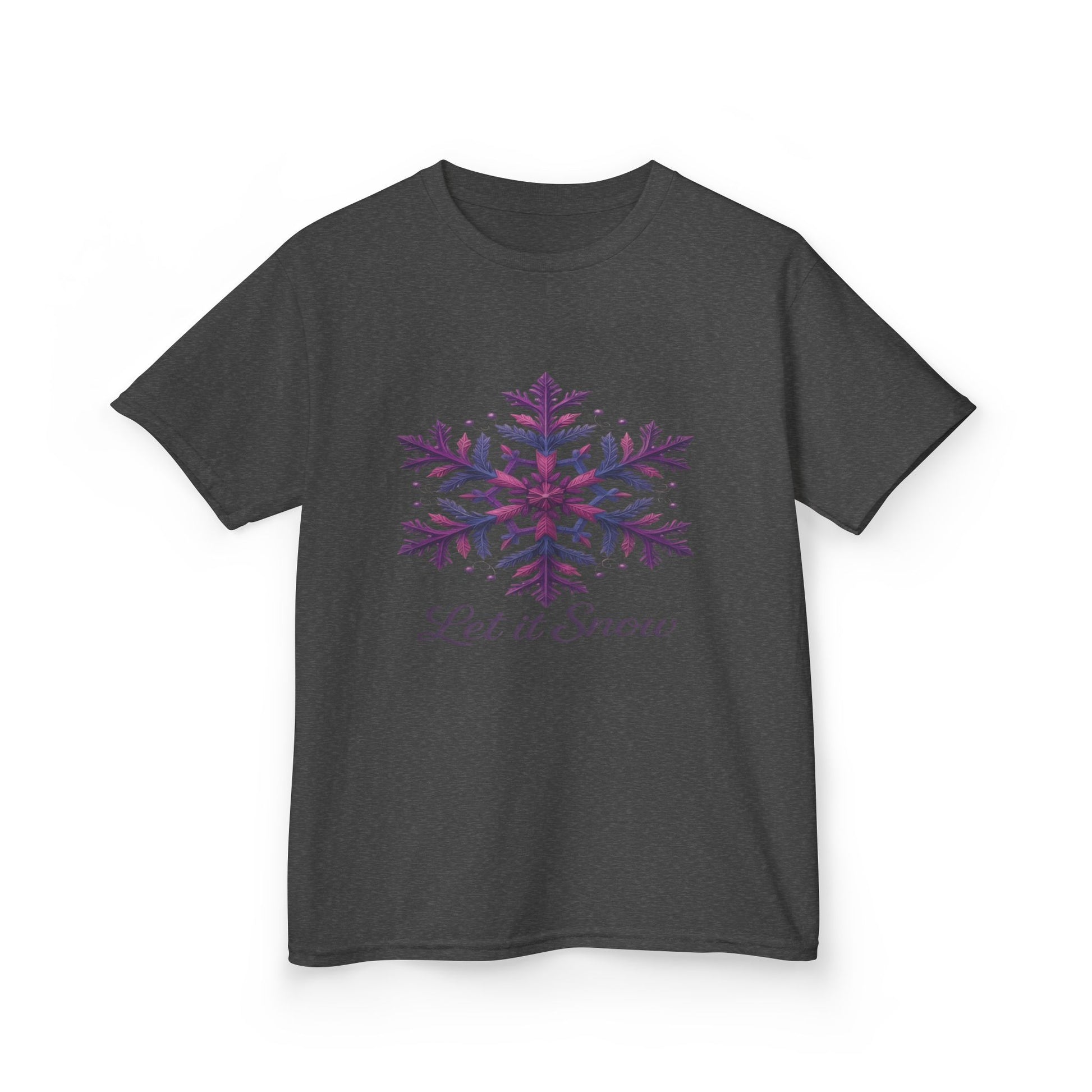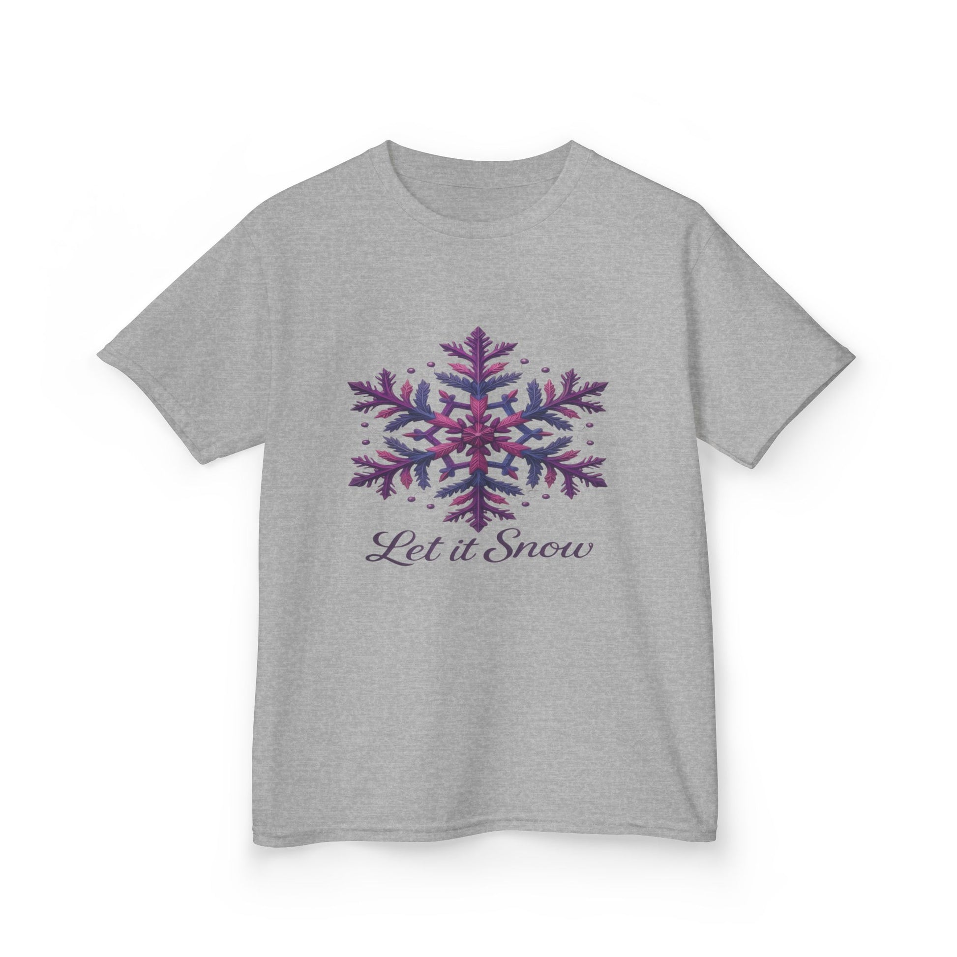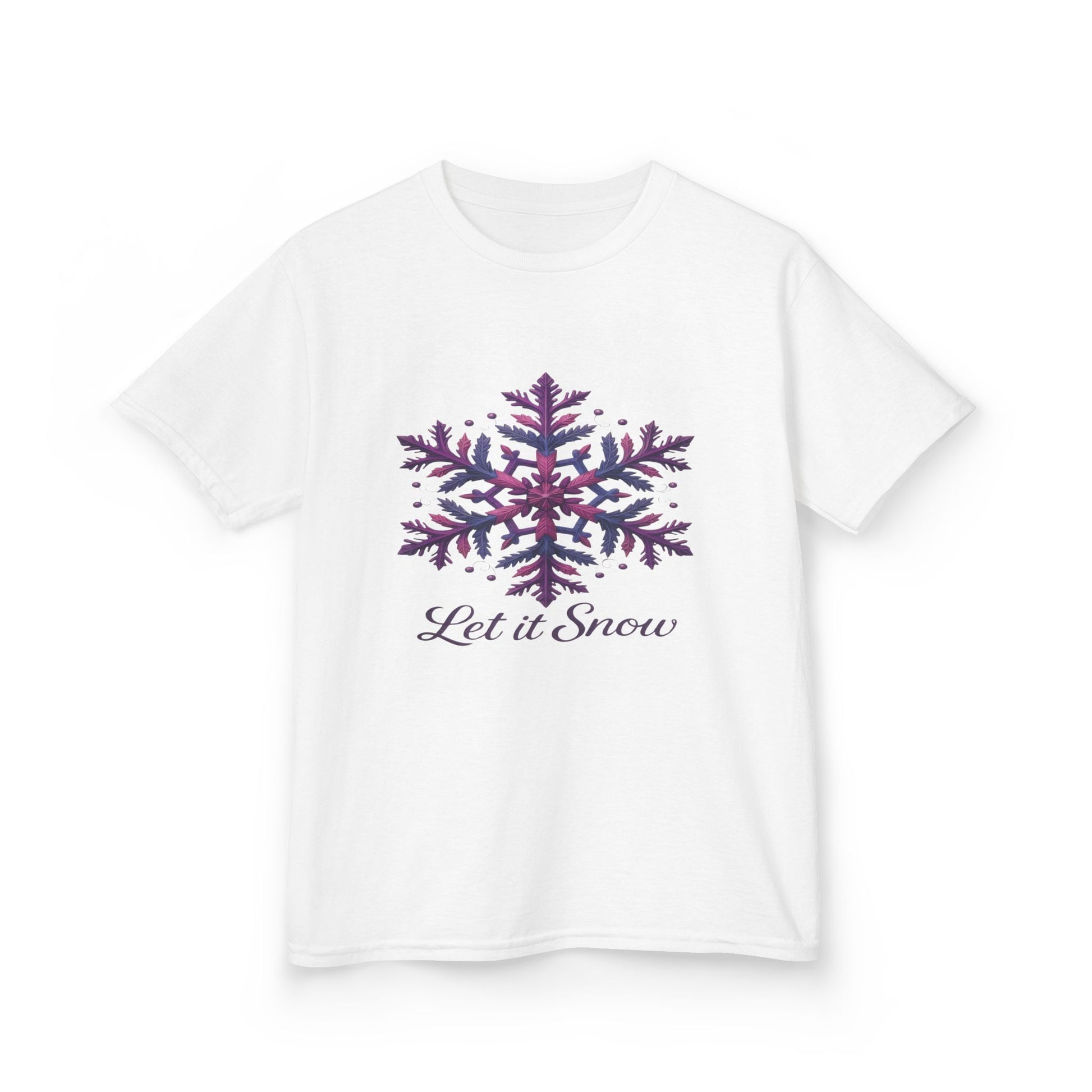 Celebrate the winter season with this adorable 'Let it Snow' dinosaur tee! Featuring a whimsical, stylized snowflake design with a cute dinosaur twist, this shirt is perfect for holiday parties and cozy winter days. The soft, comfortable fabric ensures all-day wear, and the charming graphic is sure to delight. Ideal as a Christmas gift or a fun addition to any child's winter wardrobe, it combines festive cheer with playful style. The elegant cursive script completes the look, making this tee a timeless holiday favorite.