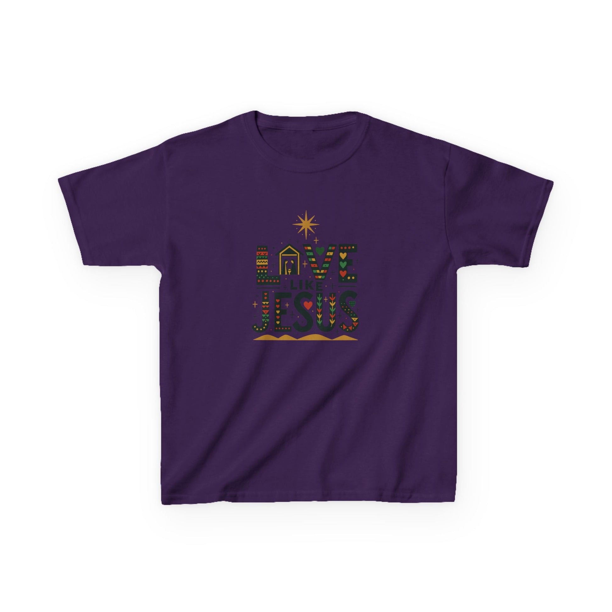 Spread holiday cheer with this festive t-shirt! Featuring the message "LIVE LIKE JESUS" in a bold, folk-art style, this tee incorporates Nativity scene elements and a vibrant color palette. Perfect for Christmas, this fun dinosaur design combines faith and playful design for kids. Made from soft, comfortable fabric, it's an ideal gift for kids who love dinosaurs and celebrate the season.