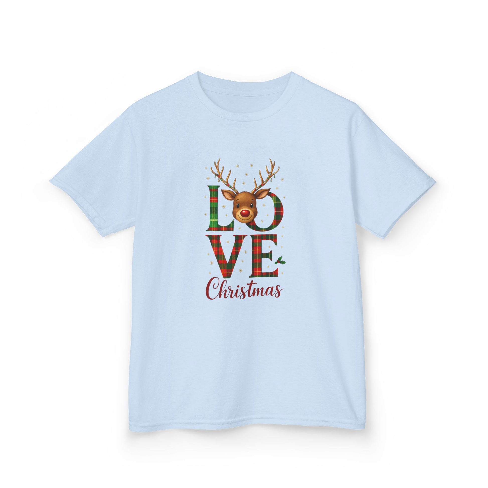 Spread holiday cheer with this adorable 'LOVE Christmas' tee! Featuring a plaid 'LOVE' design with a happy reindeer and the word 'Christmas' in a festive script, this shirt is perfect for your little one. Adorned with gold snowflakes and a sprig of holly, it's sure to bring smiles. Made from soft, comfortable fabric, it's ideal for Christmas parties or everyday wear. This cheerful t-shirt makes a great gift for any child who loves dinosaurs and Christmas! A happy dinosaur head completes the design.