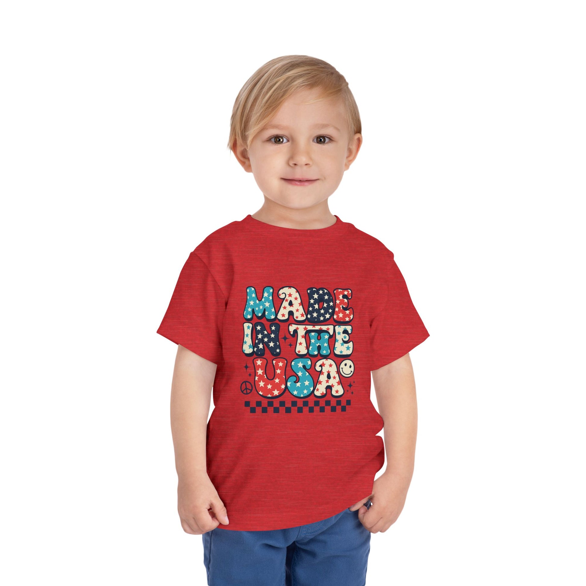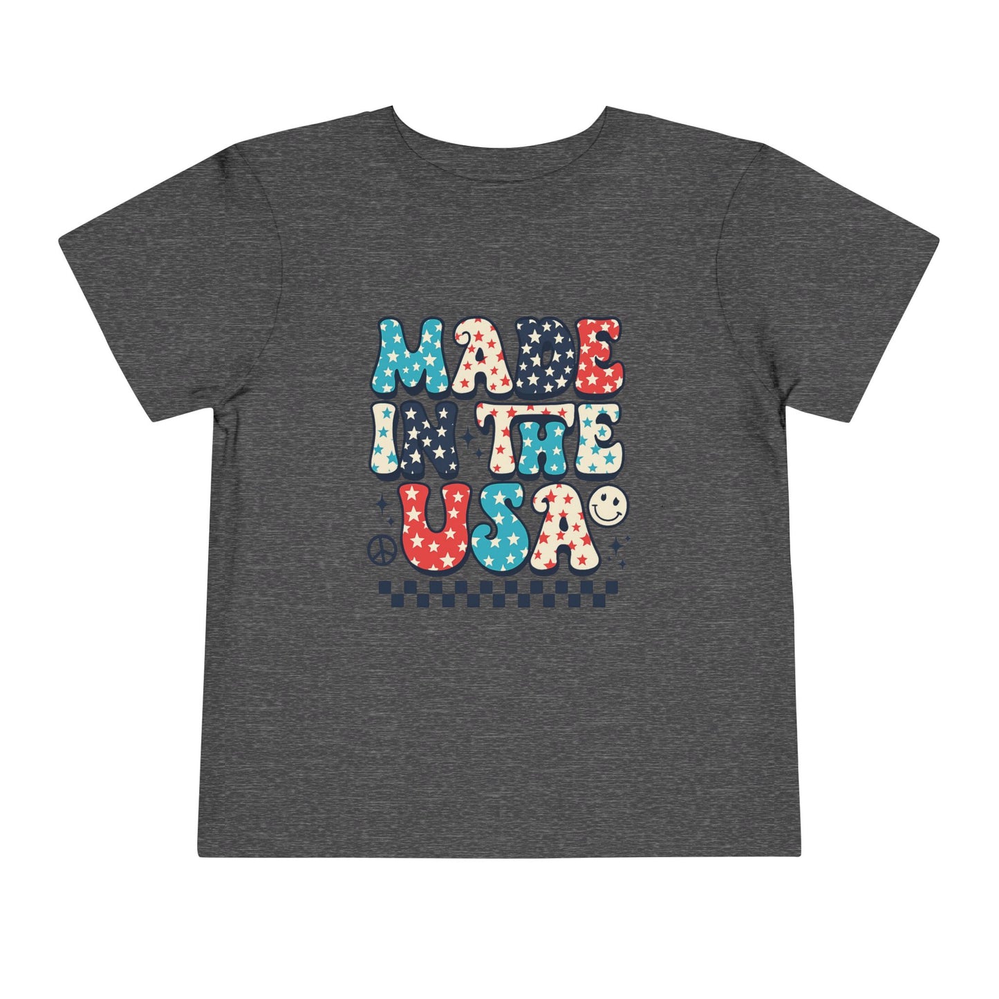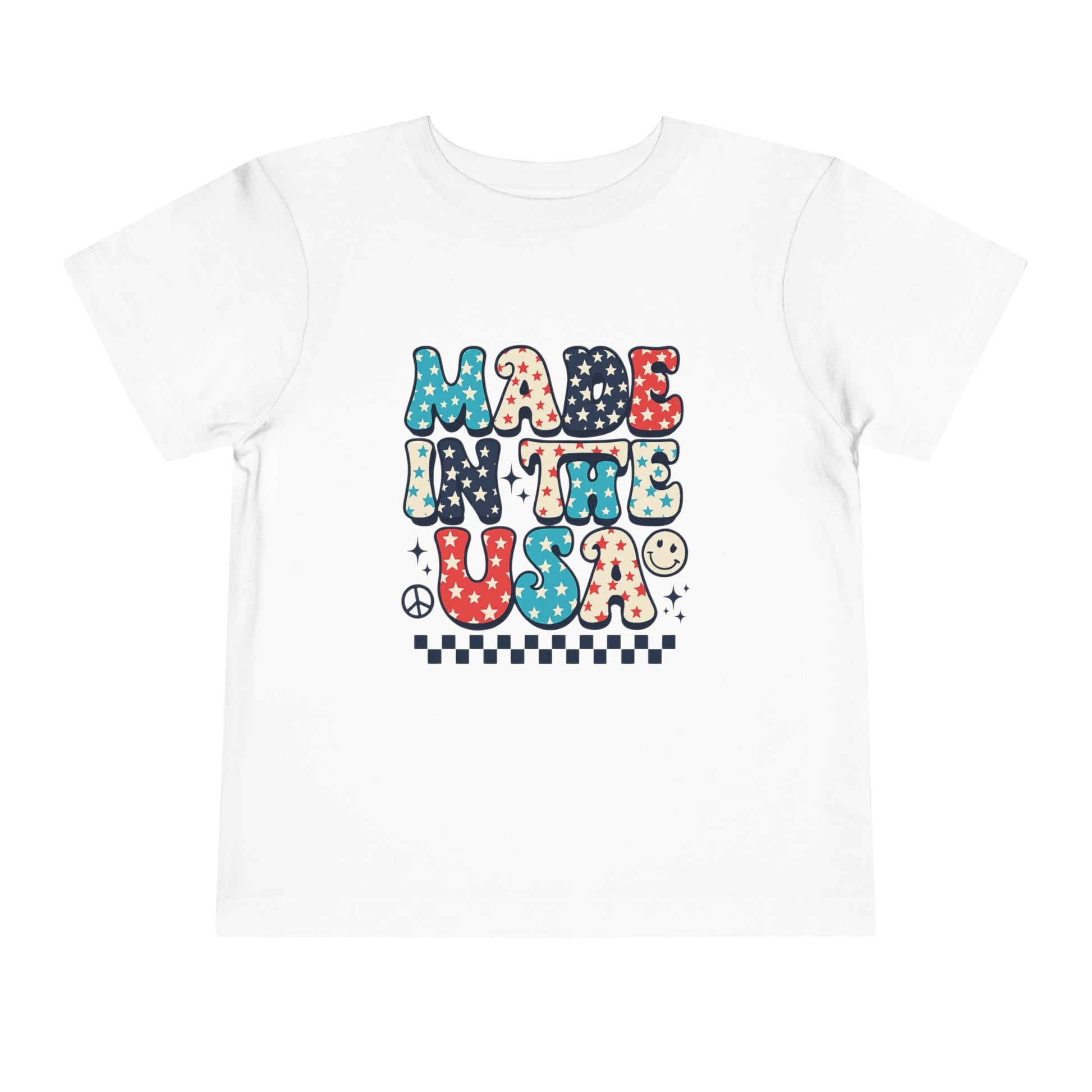This vintage-inspired toddler tee features 'MADE IN THE USA' in a fun star-filled design, alongside a smiley face and peace sign. It gives off a playful and patriotic vibe, perfect for little ones to wear on Independence Day or everyday casual outings. Ideal for parents looking for a cute and comfortable option for their toddlers.