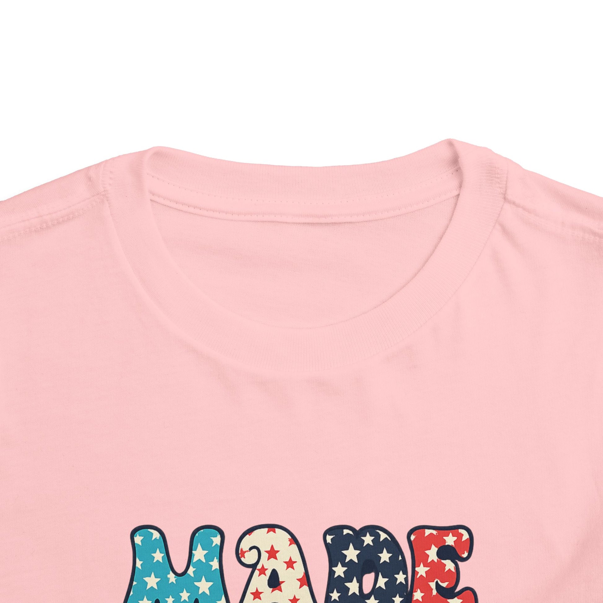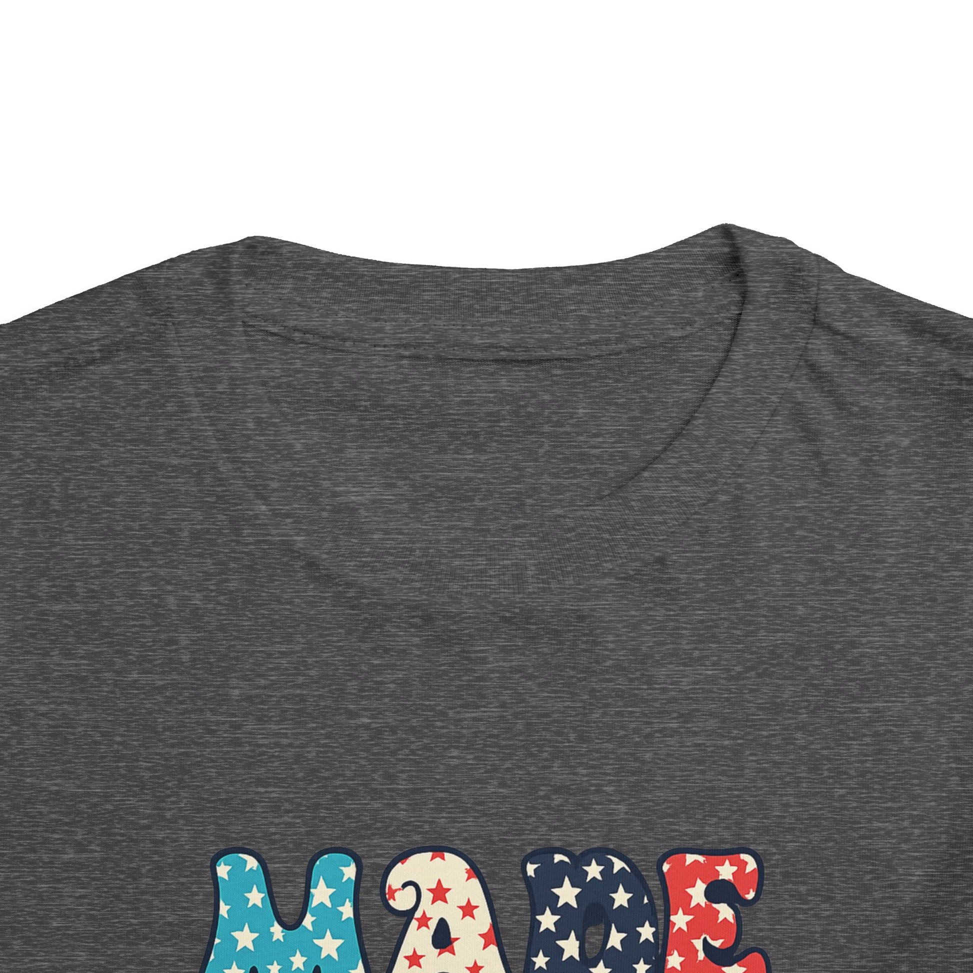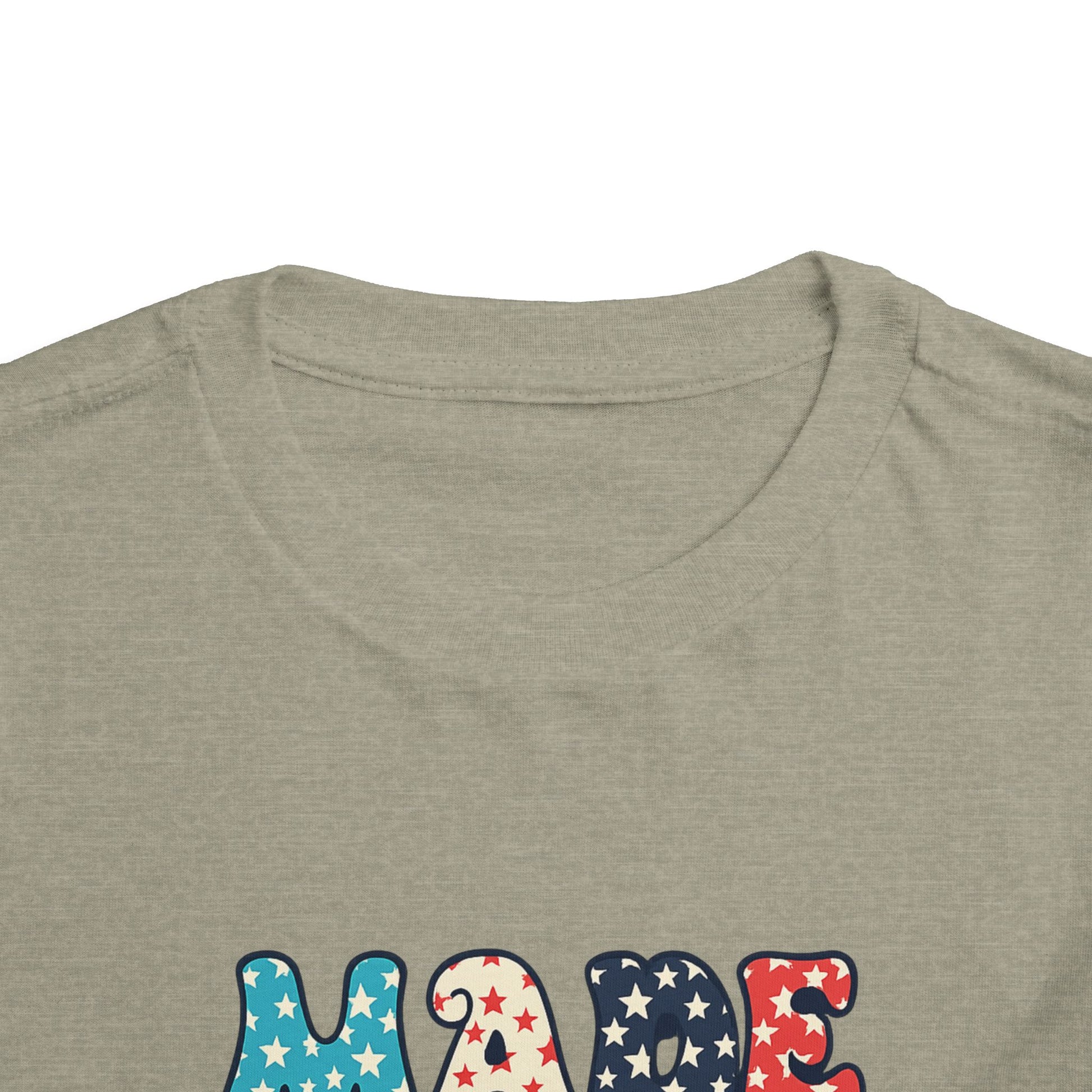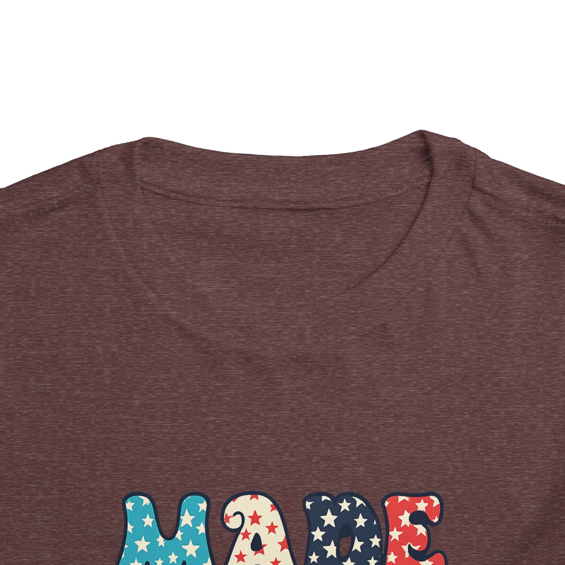 This vintage-inspired toddler tee features 'MADE IN THE USA' in a fun star-filled design, alongside a smiley face and peace sign. It gives off a playful and patriotic vibe, perfect for little ones to wear on Independence Day or everyday casual outings. Ideal for parents looking for a cute and comfortable option for their toddlers.