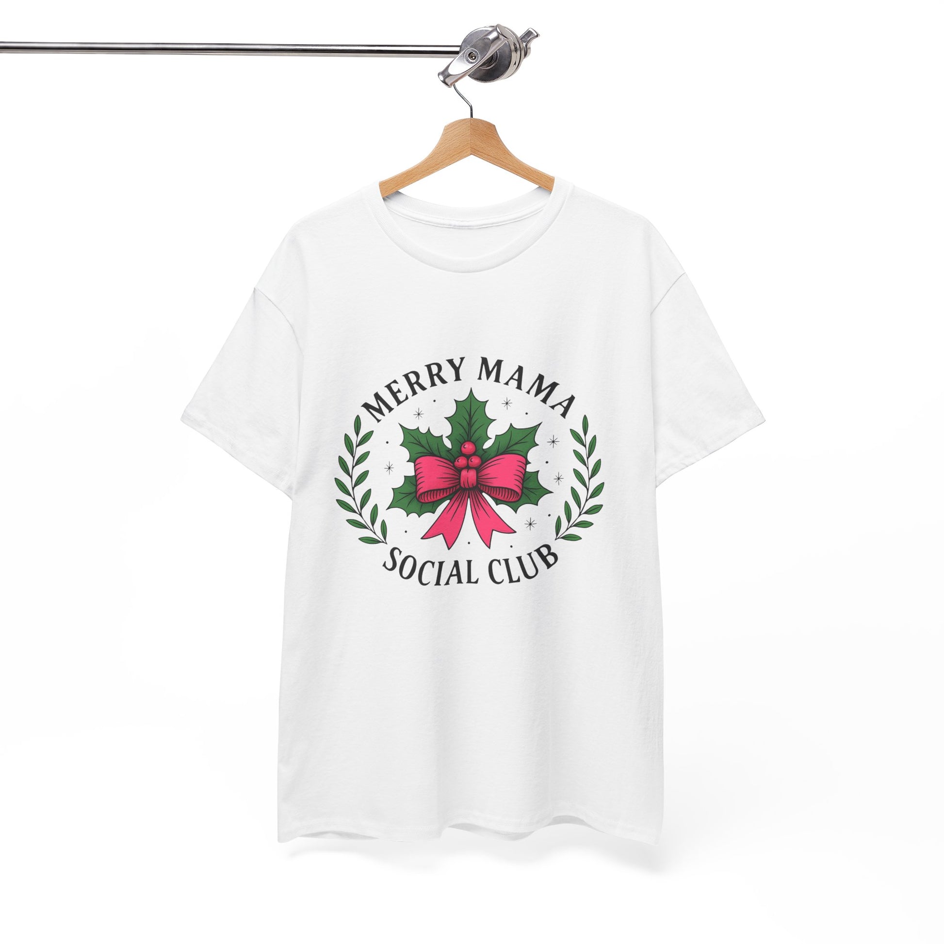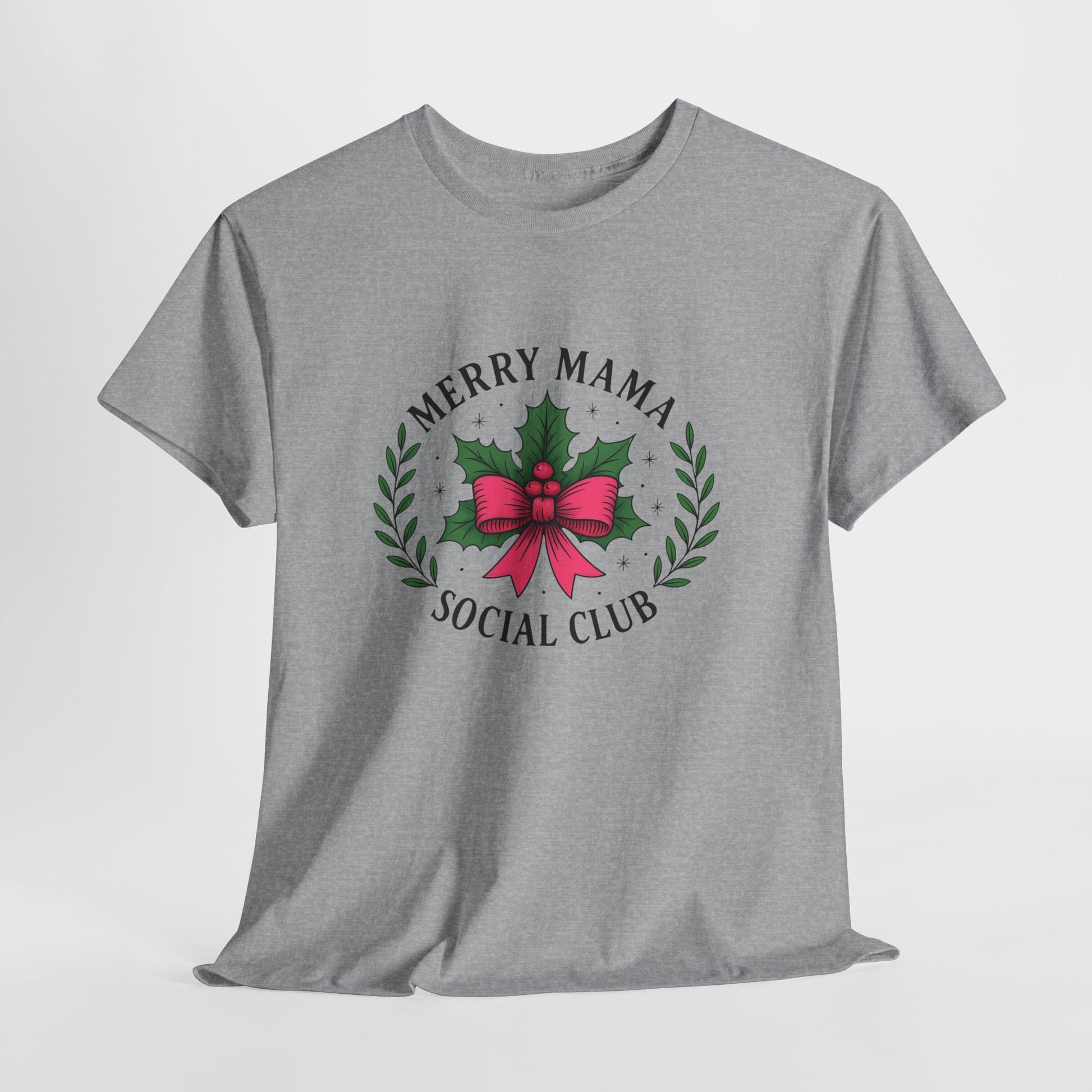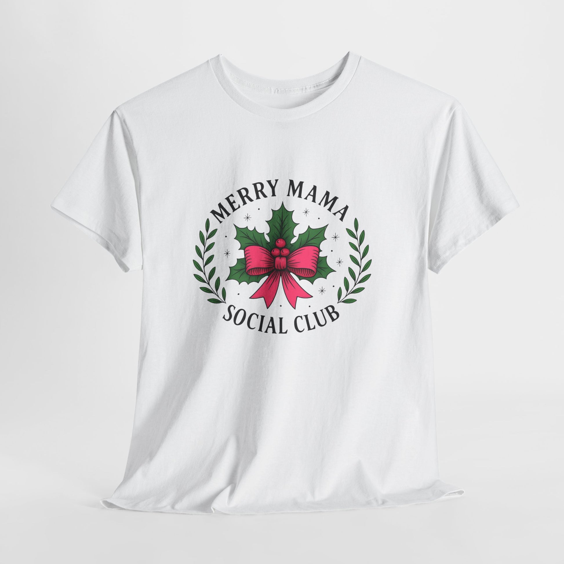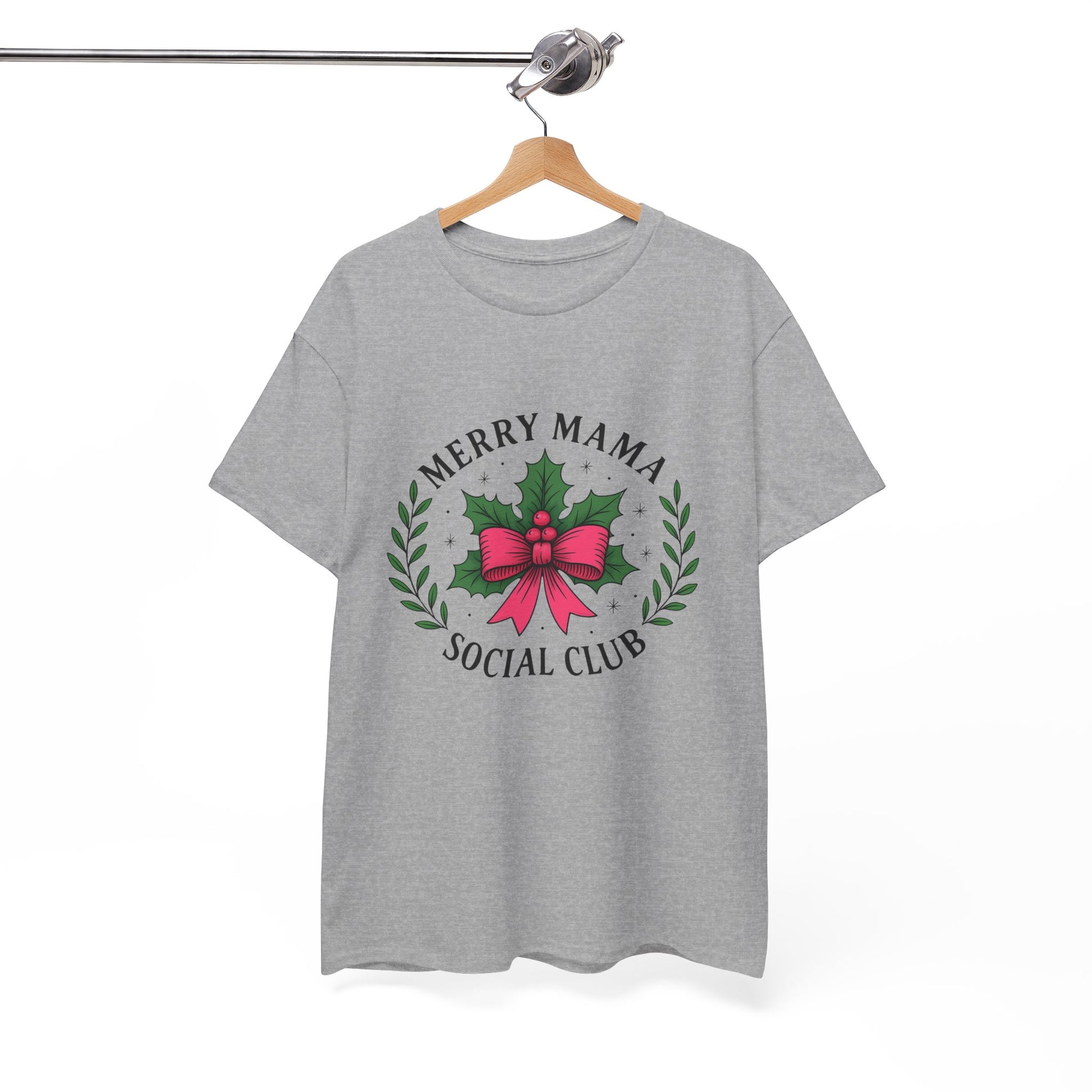 Celebrate the season with our Merry Mama Social Club tee! This festive design features a holly and wreath motif with 'MERRY MAMA SOCIAL CLUB' text, perfect for spreading holiday cheer. The soft, comfortable fabric makes it an ideal gift for any mom or loved one.