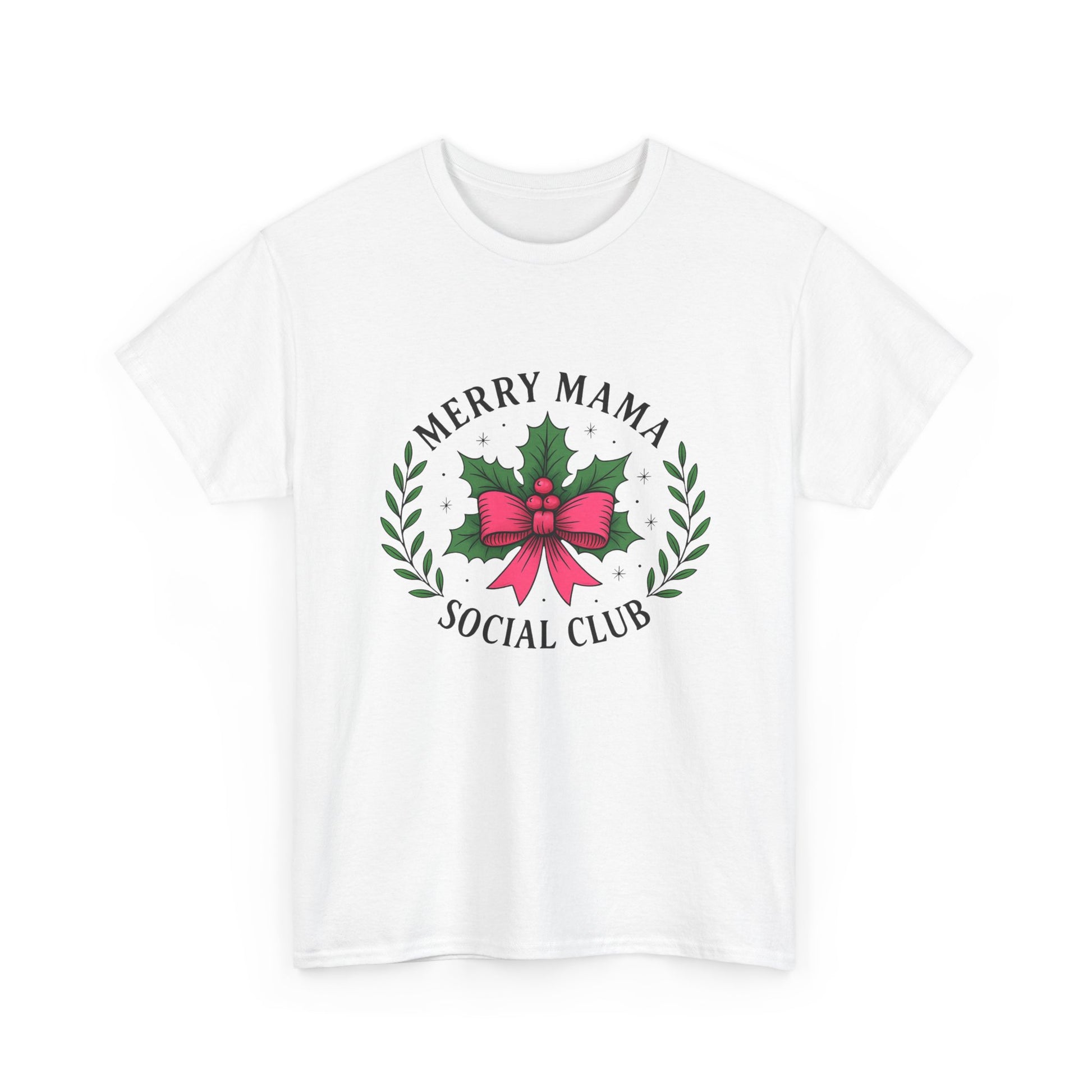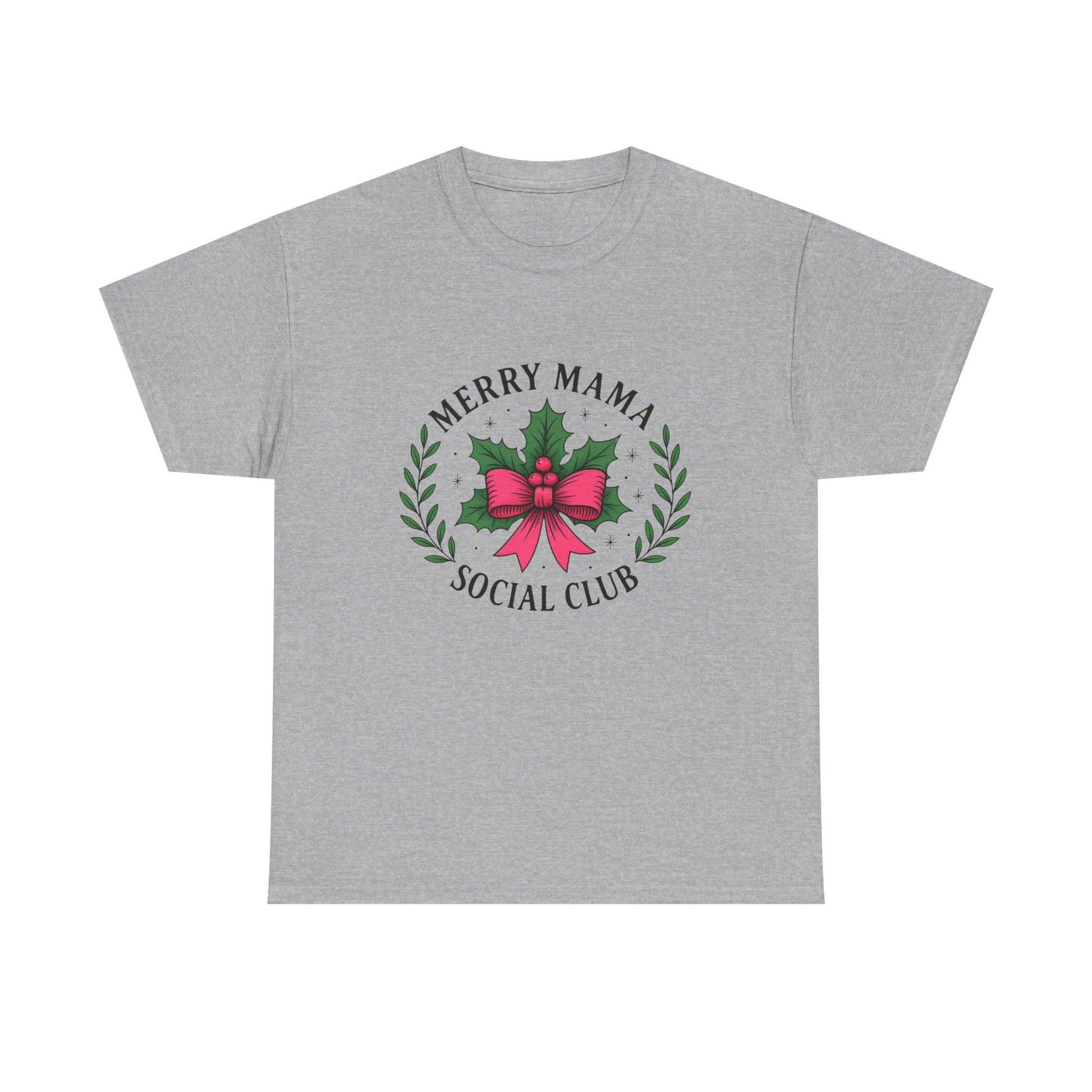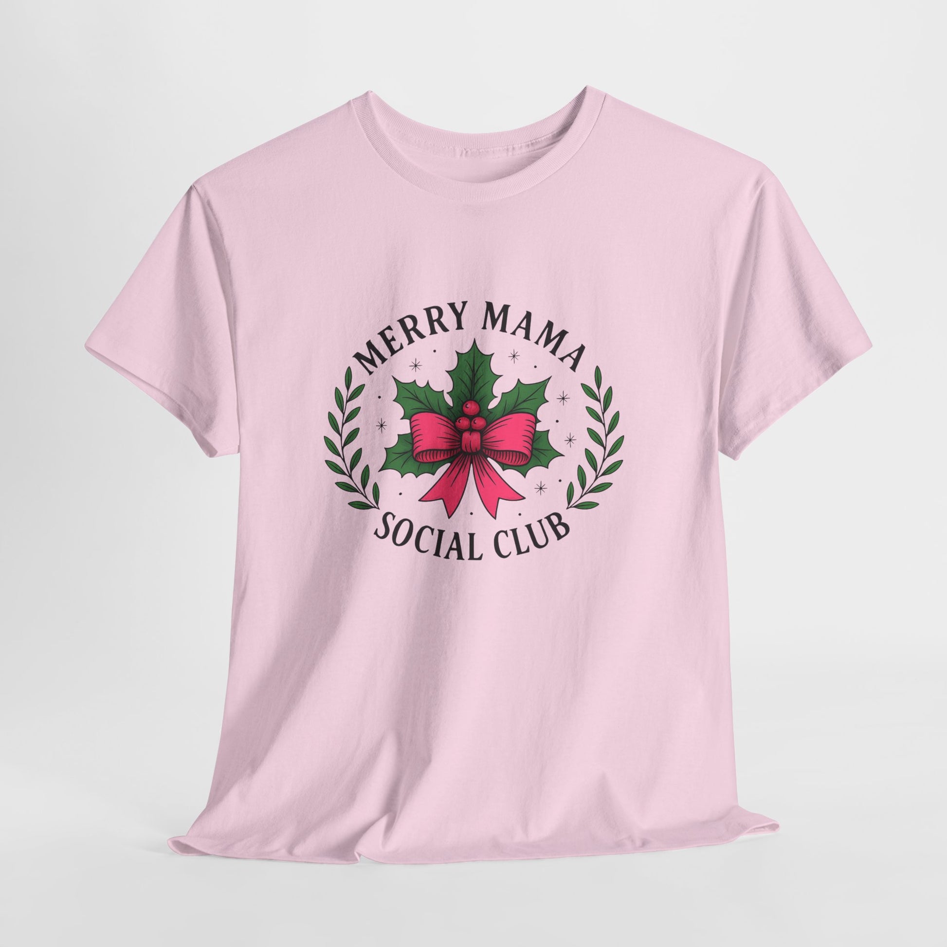 Celebrate the season with our Merry Mama Social Club tee! This festive design features a holly and wreath motif with 'MERRY MAMA SOCIAL CLUB' text, perfect for spreading holiday cheer. The soft, comfortable fabric makes it an ideal gift for any mom or loved one.