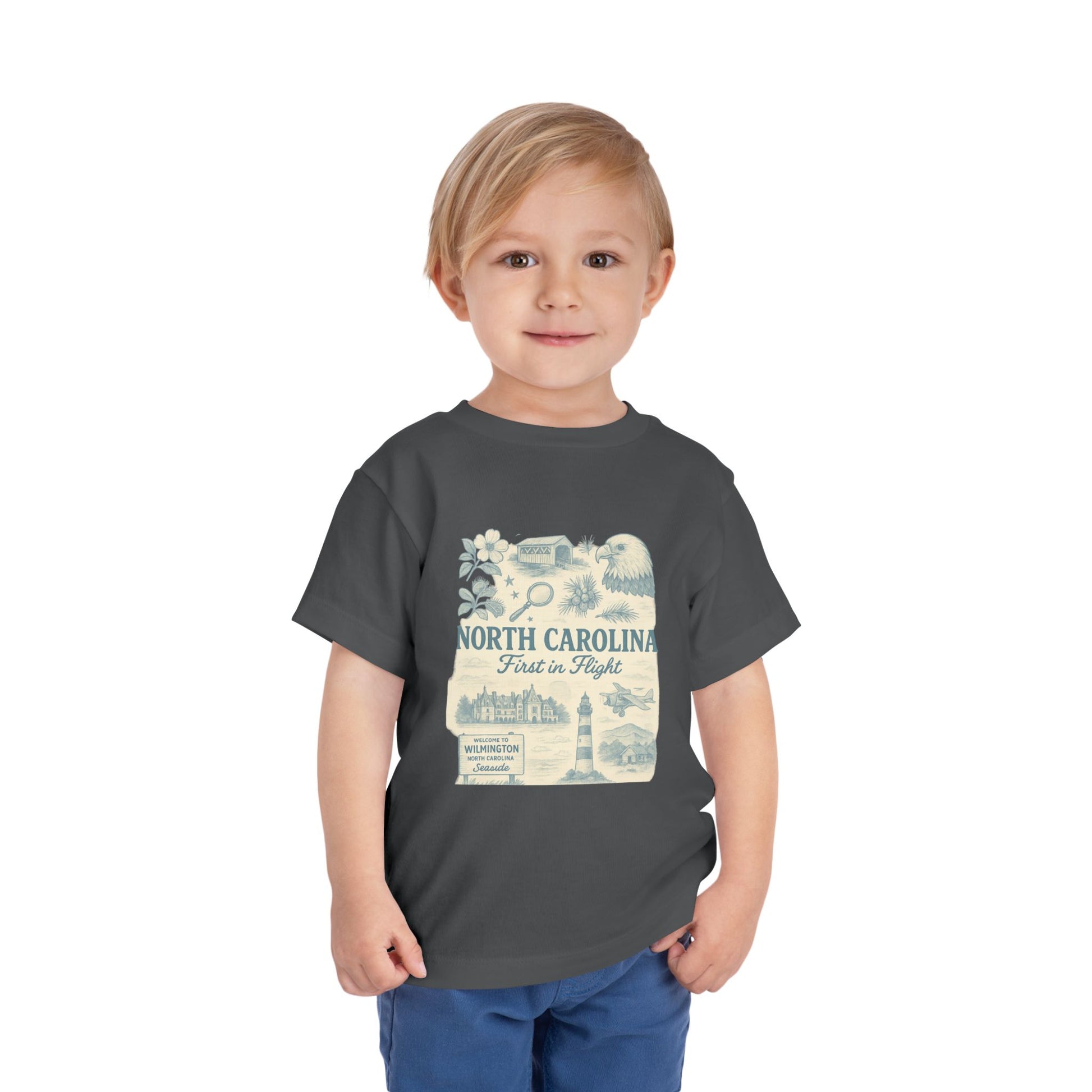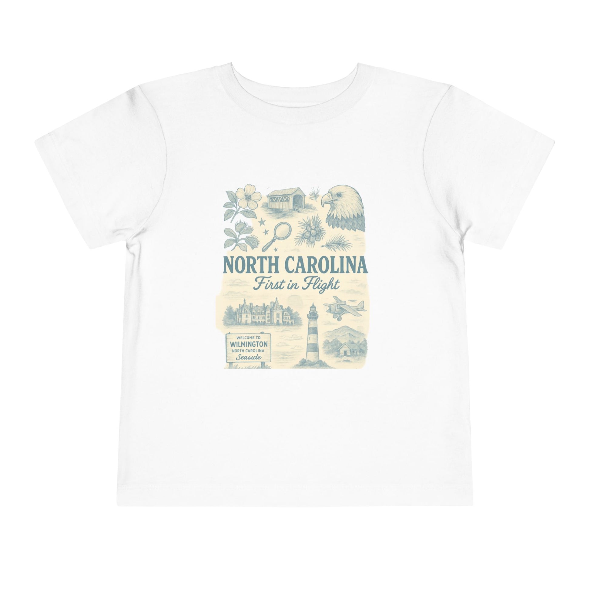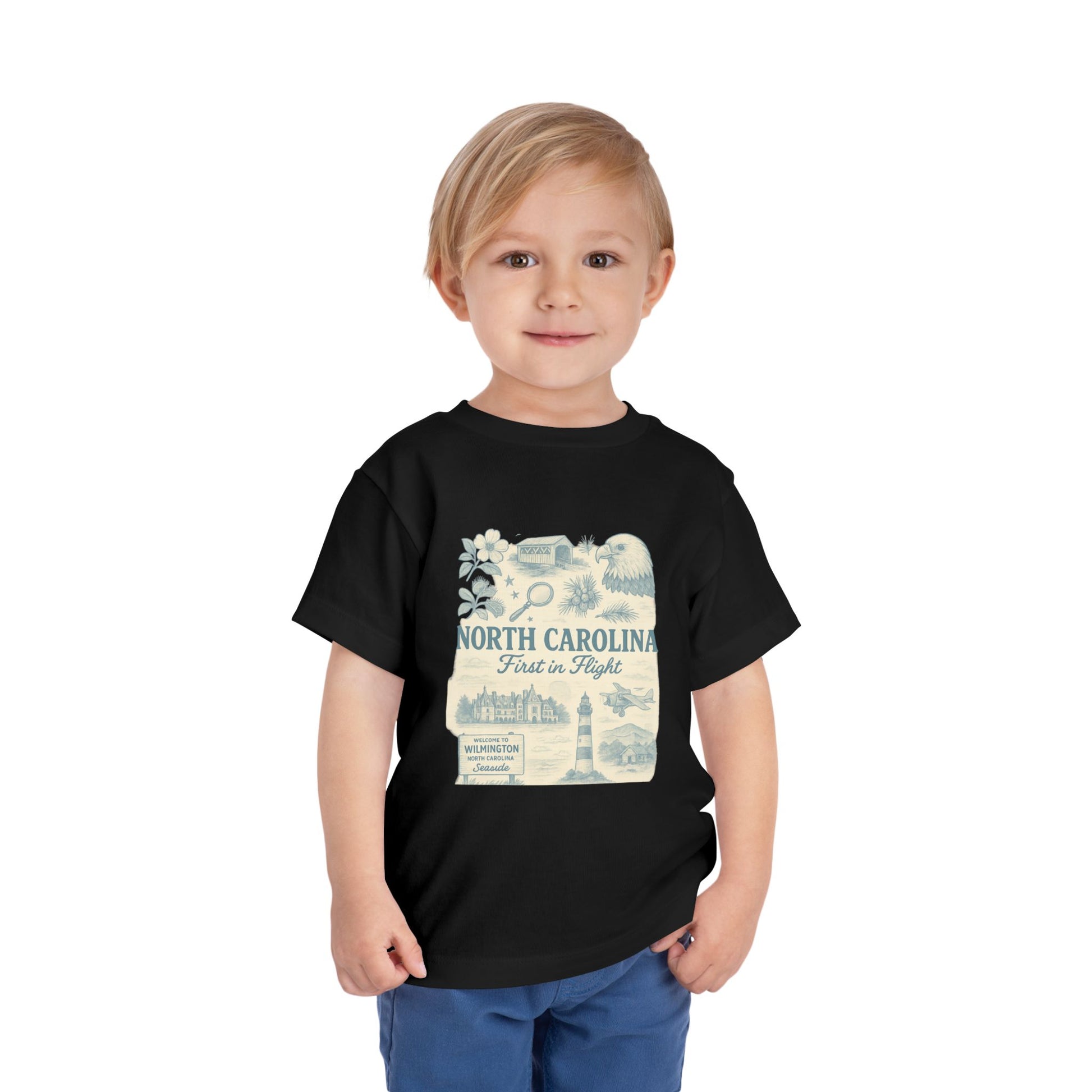 This adorable toddler tee features a vintage-style illustration of NC landmarks and 'First in Flight' design. Perfect for parents looking to share their love of North Carolina with their little ones. Ideal for young children to wear during family outings, vacations, or as a comfortable everyday shirt. Relevant for North Carolina residents, tourists, and aviation enthusiasts. Suitable for birthdays, holidays, family gatherings, and casual outings.