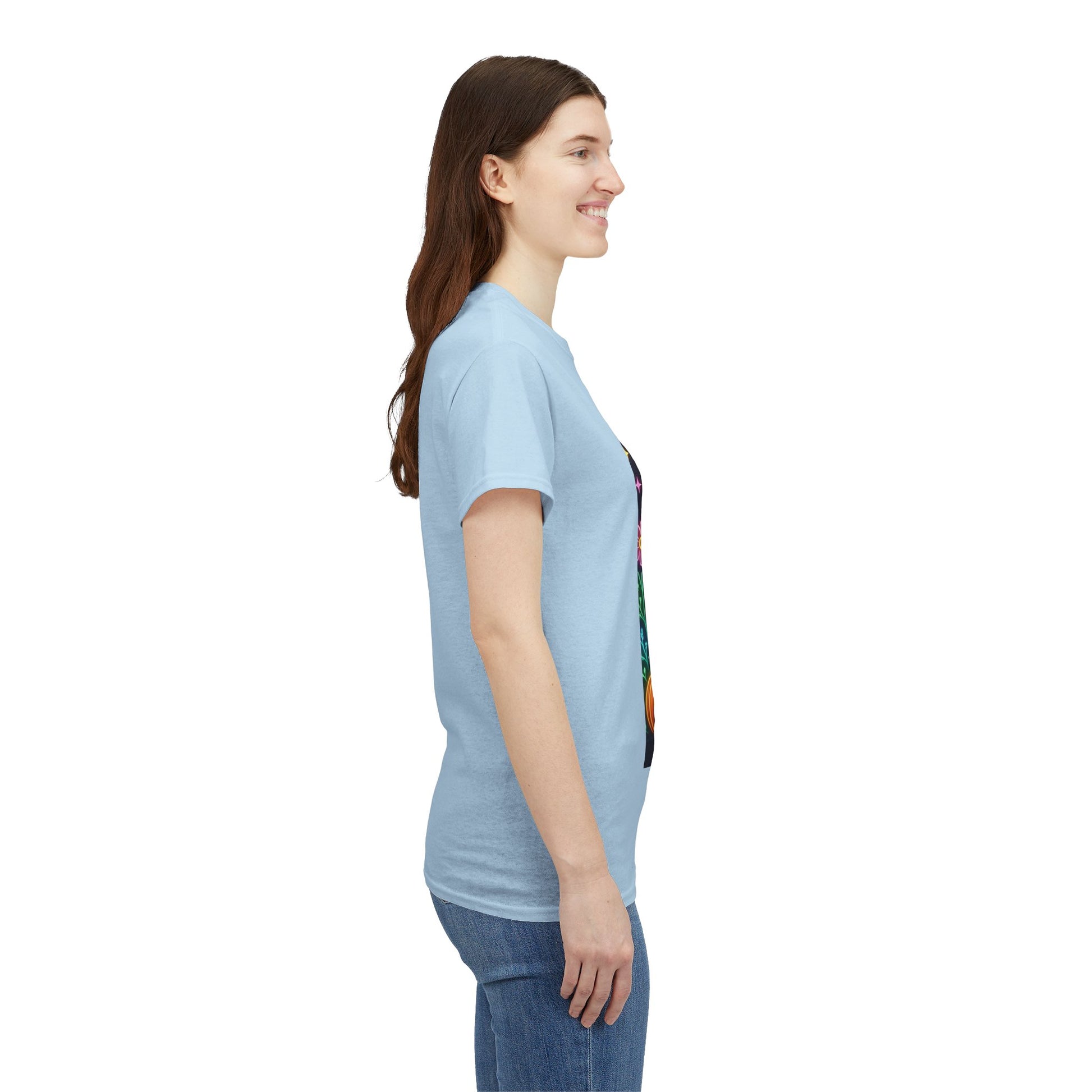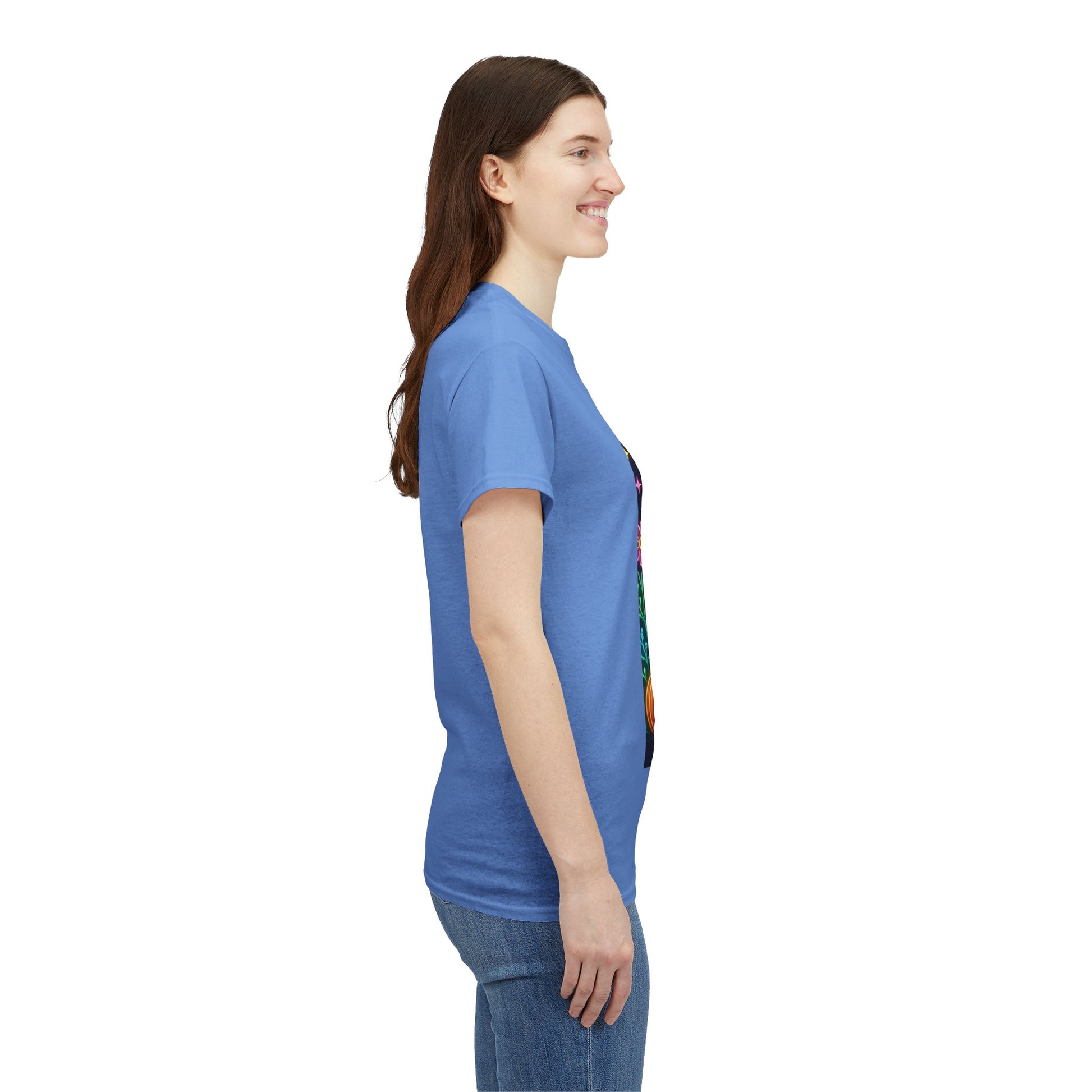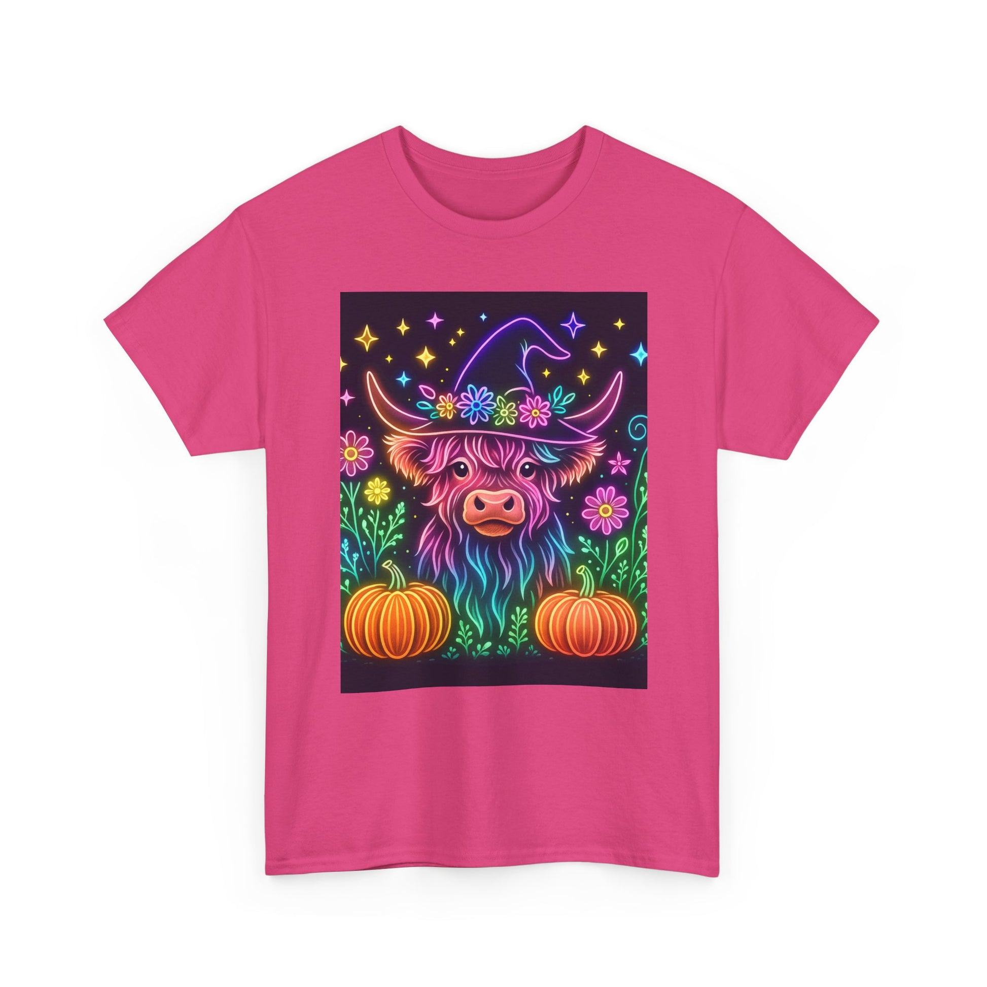 Show your support with this vibrant, neon-style tee! Featuring a whimsical Highland cow in a witch's hat, surrounded by glowing pumpkins and stars, this shirt combines Halloween fun with a powerful message of hope. The design uses a neon color palette, creating a modern, eye-catching aesthetic.