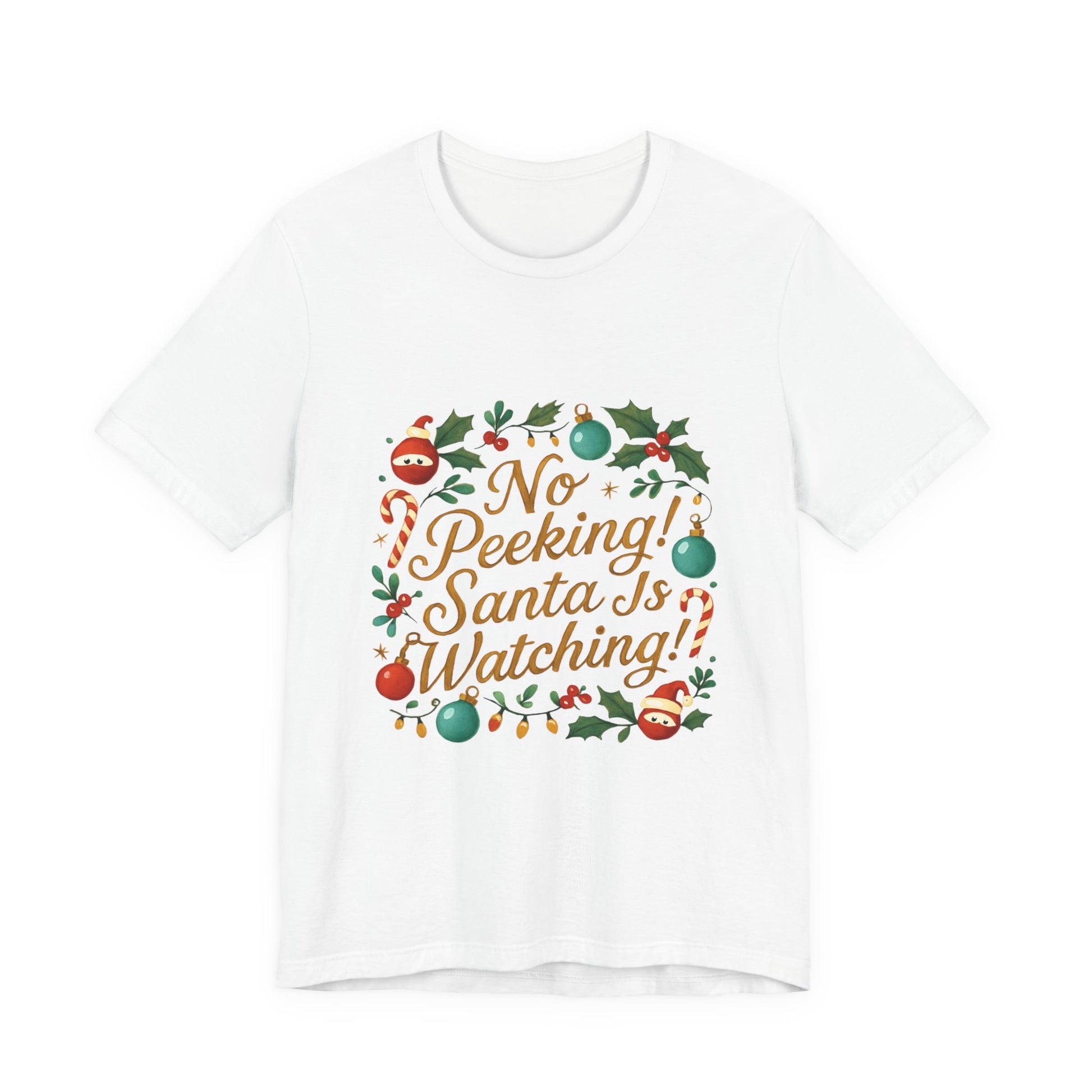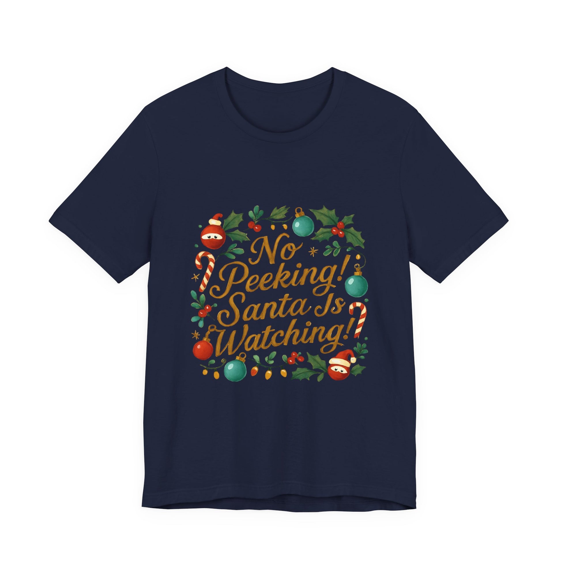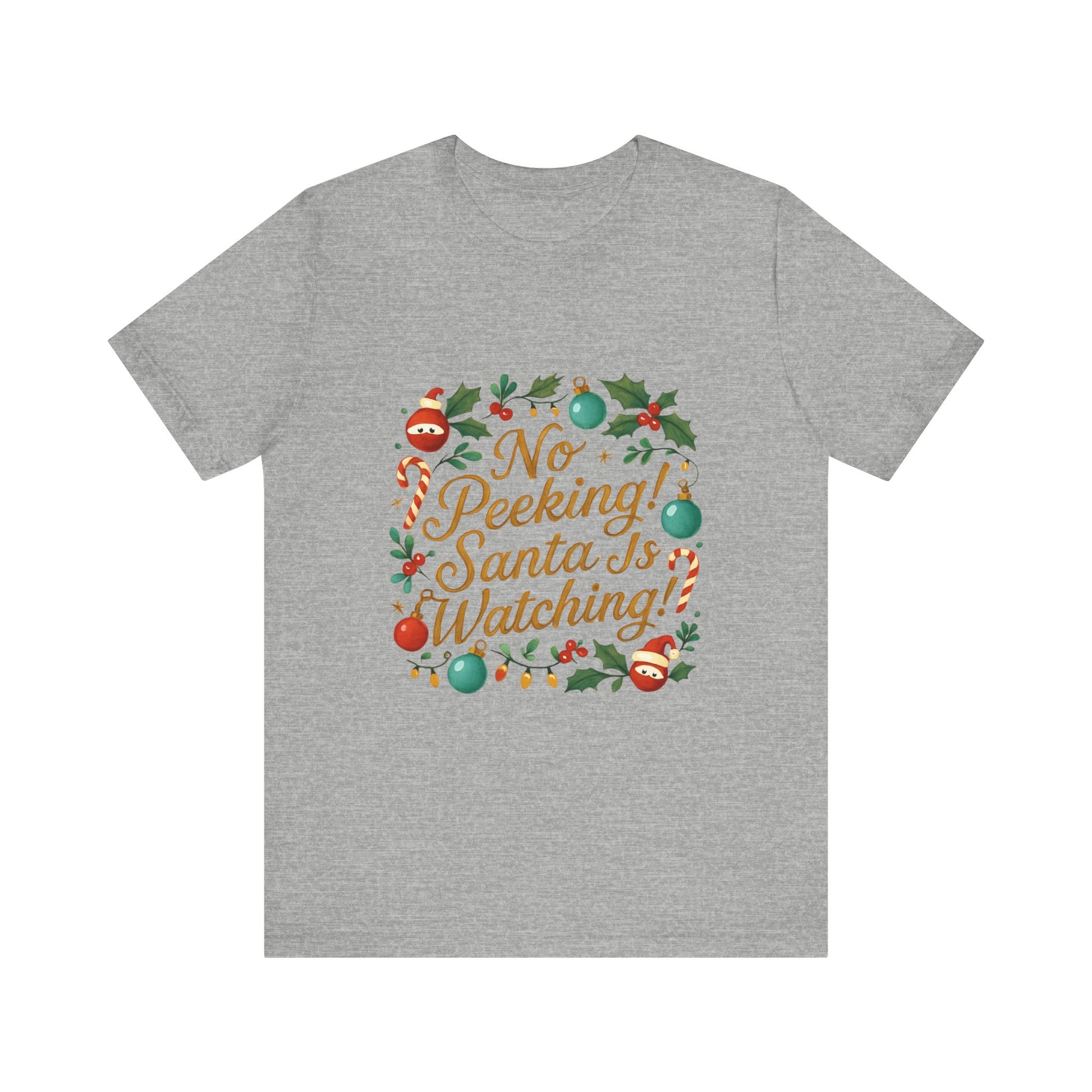 This lightweight crew-neck tee brings a playful nod to holiday traditions with a warm, homey design. Soft Airlume combed and ring-spun cotton makes the shirt breathable and easy to layer under sweaters or over long sleeves. The front graphic — a wreath of ornaments, candy canes, holly and script reading “No Peeking! Santa Is Watching!” — feels cozy and mischievous, the kind of detail that sparks smiles at cookie-baking nights and living-room present hunts. Thoughtful construction (side seams, shoulder tape and a ribbed knit collar) keeps the shape through many wears and washes, while a tear-away label prevents irritation. Responsibly manufactured and REACH certified, this tee fits into relaxed, festive wardrobes without fuss.