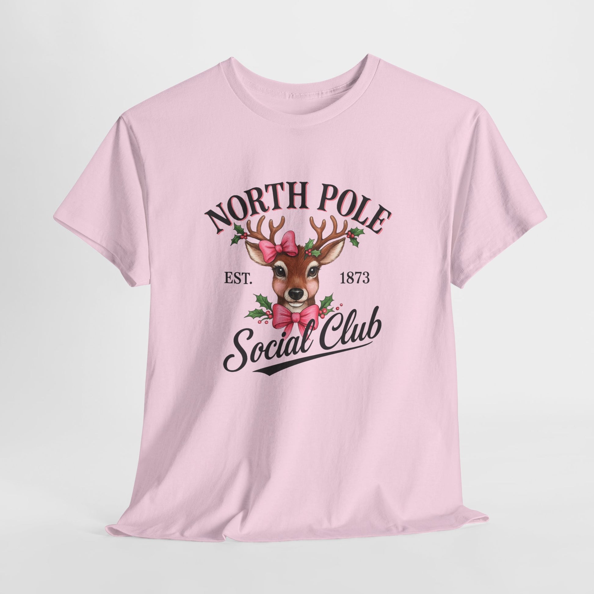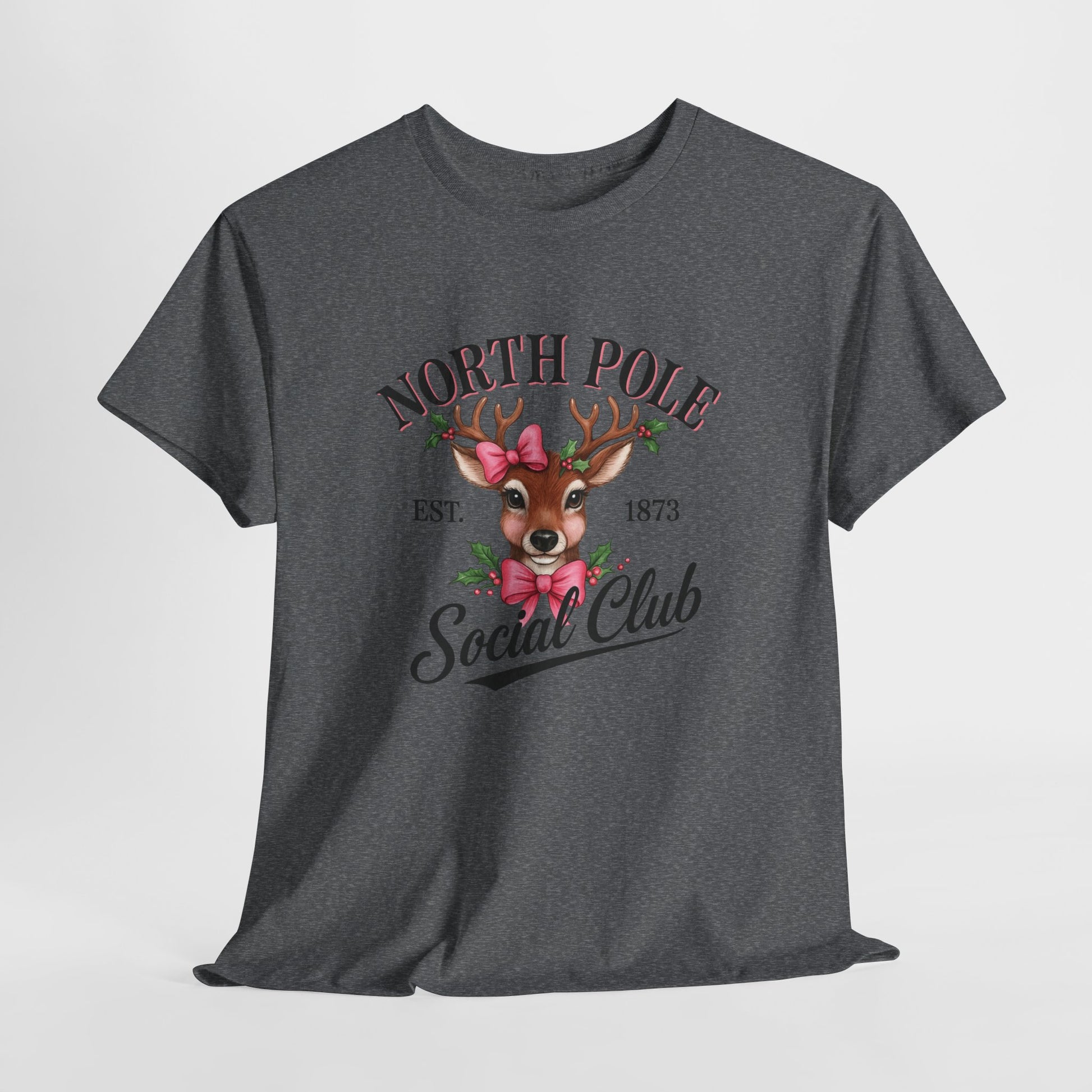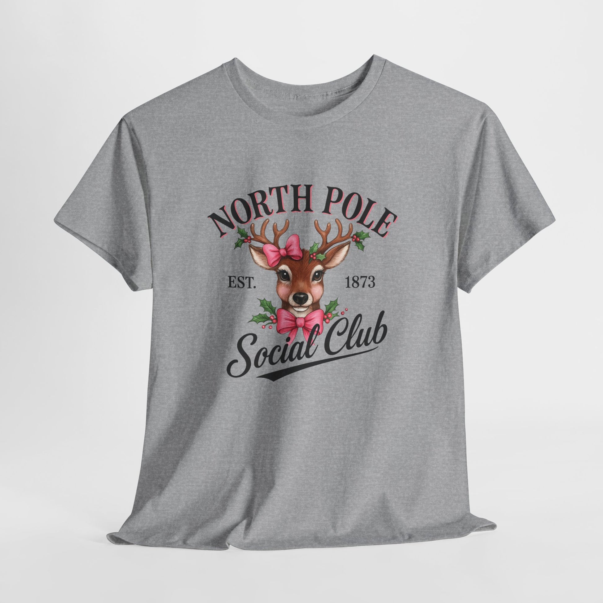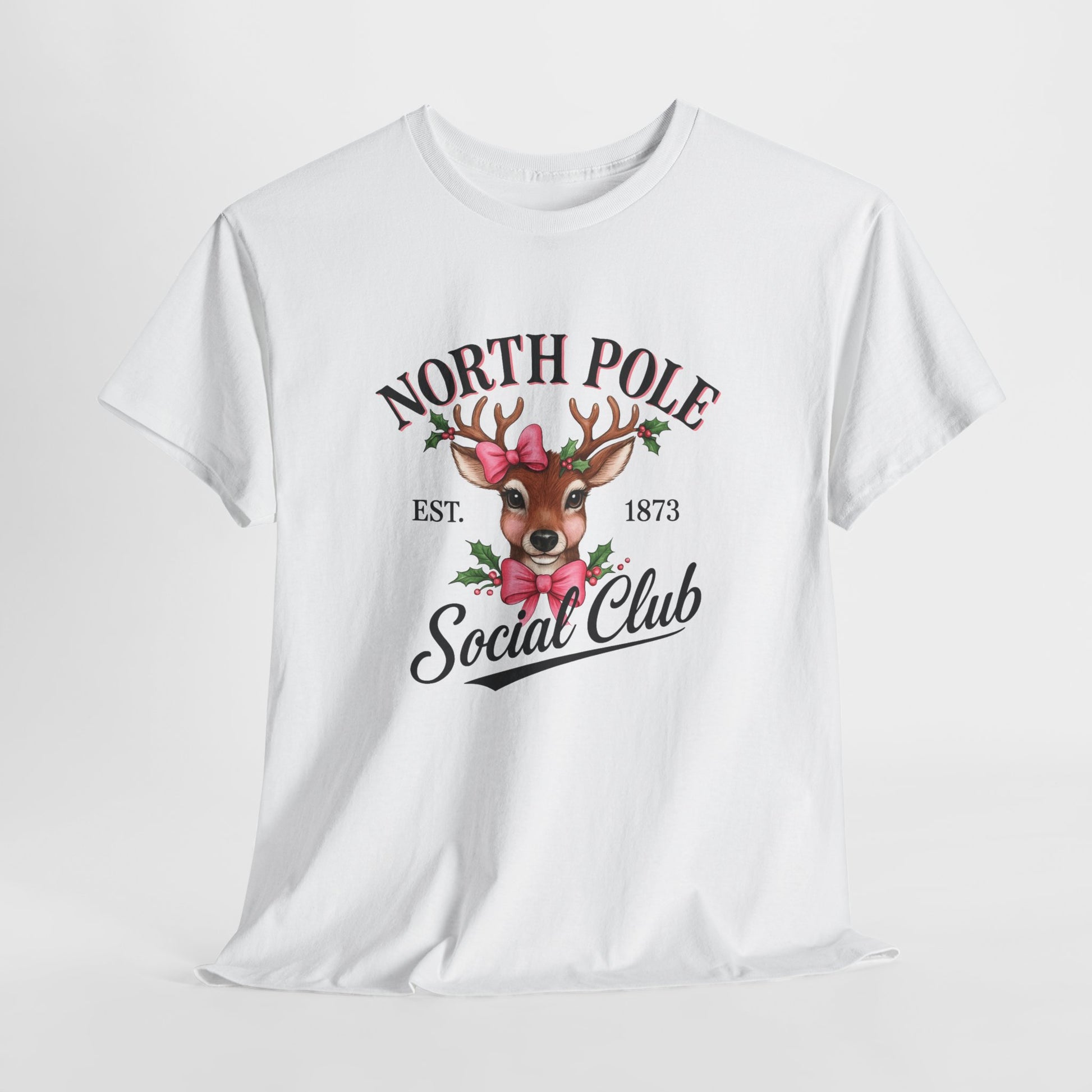 A vintage-inspired tee featuring a charming reindeer adorned with holly and a pink bow, celebrating the spirit of the North Pole Social Club. This tee offers year-round comfort with lasting durability, a classic fit, tear-away label, and ethical production.