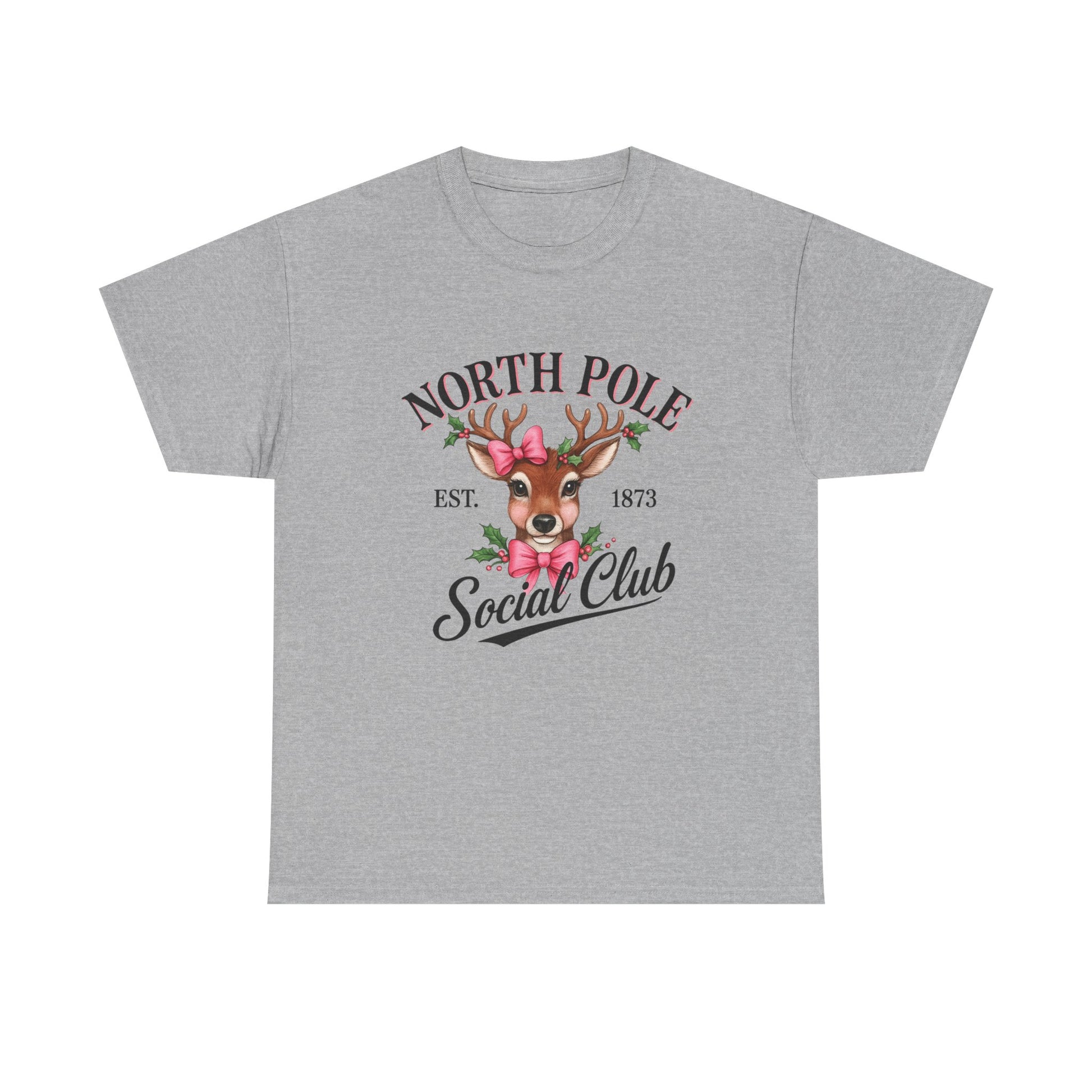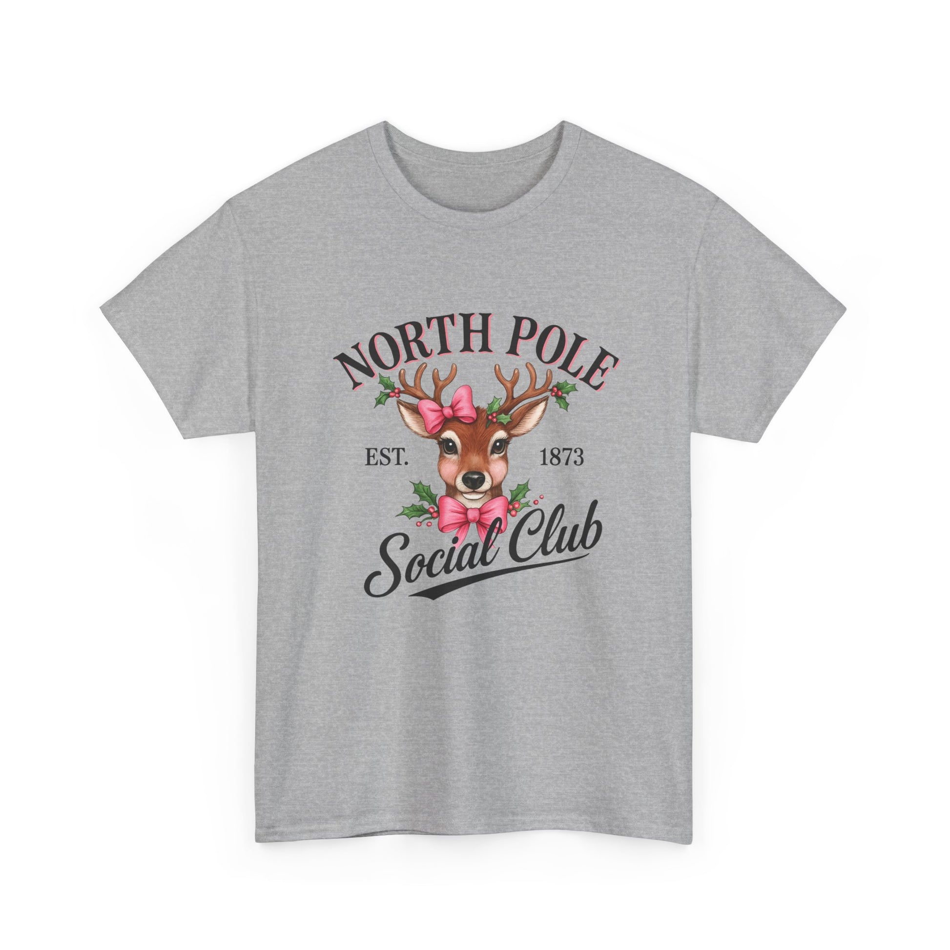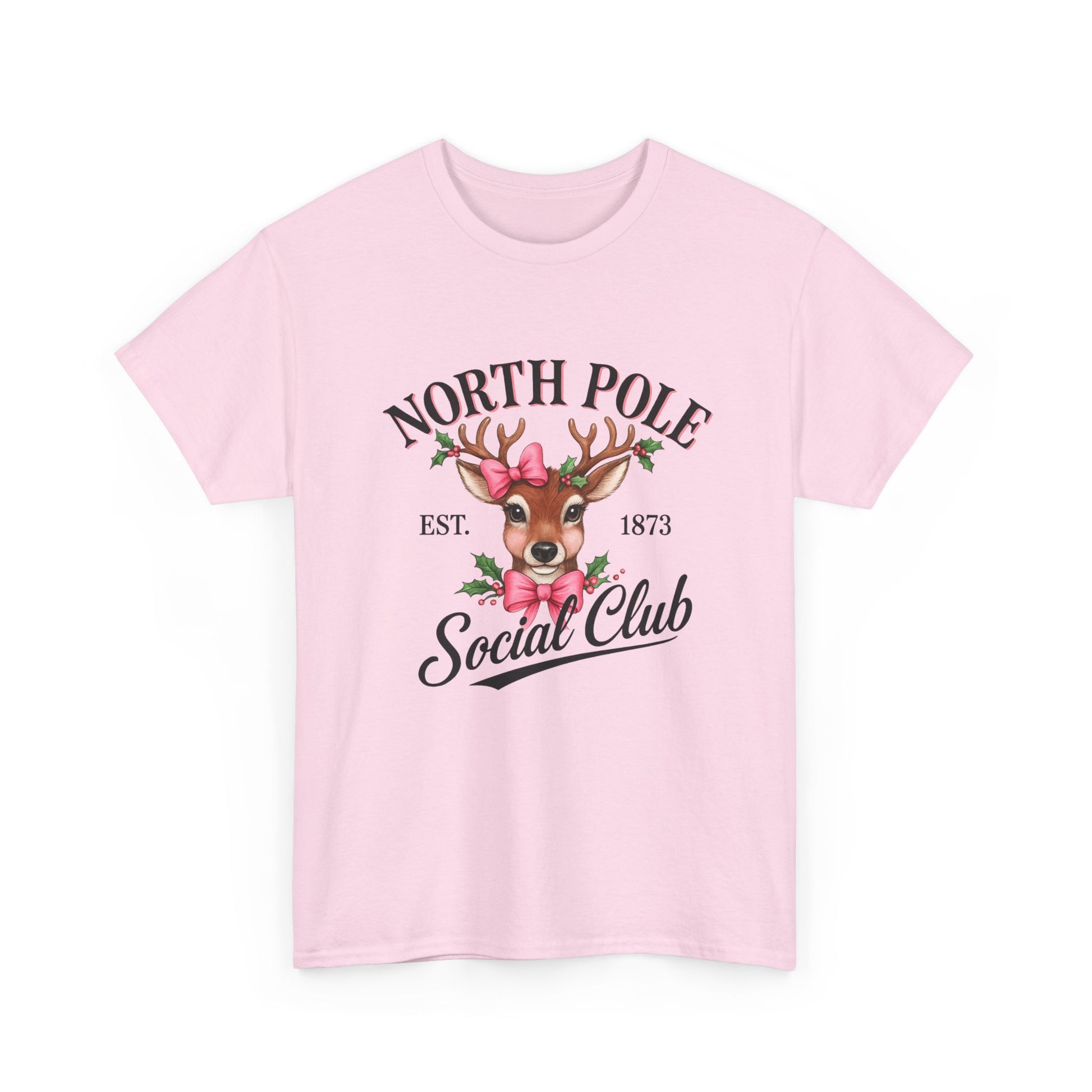 A vintage-inspired tee featuring a charming reindeer adorned with holly and a pink bow, celebrating the spirit of the North Pole Social Club. This tee offers year-round comfort with lasting durability, a classic fit, tear-away label, and ethical production.