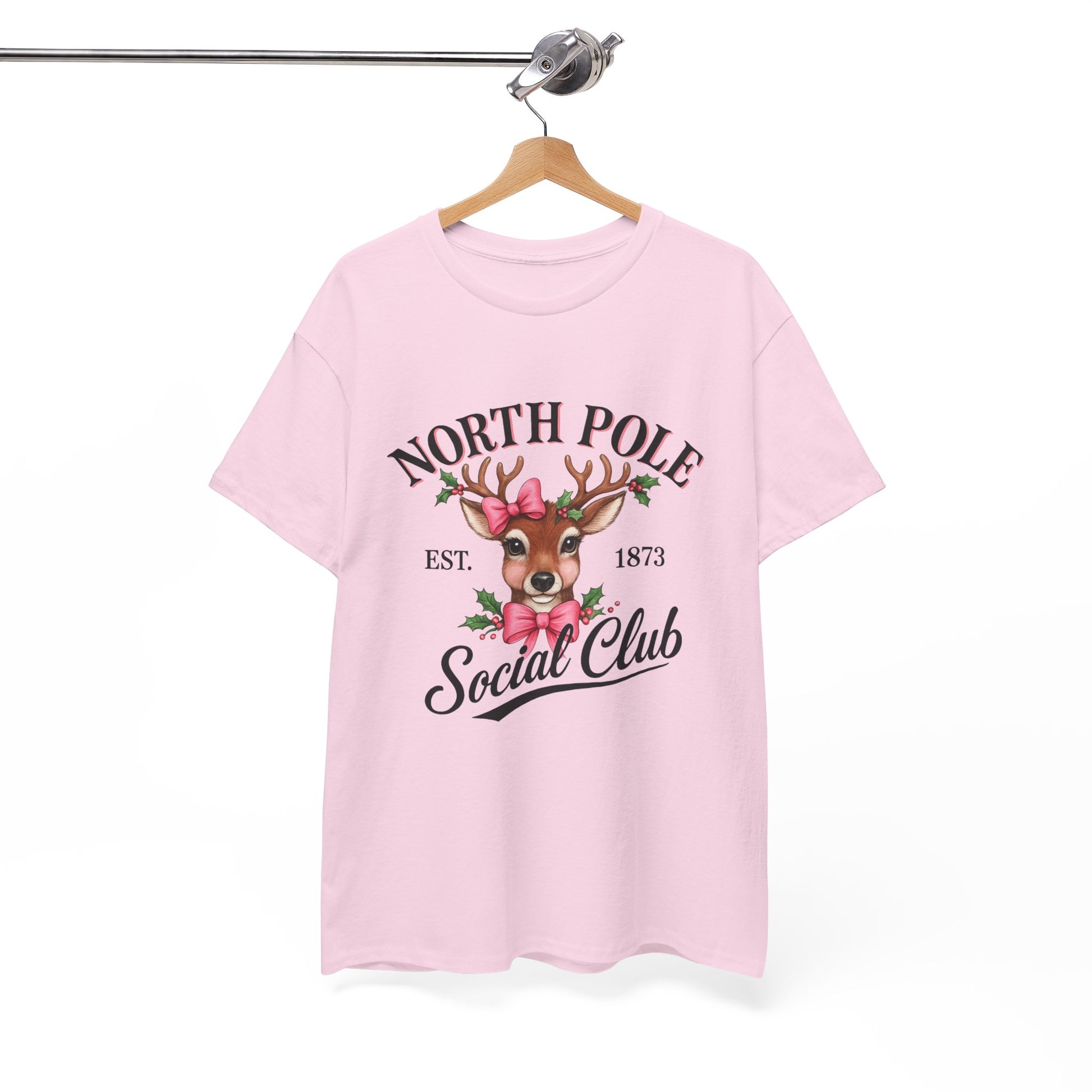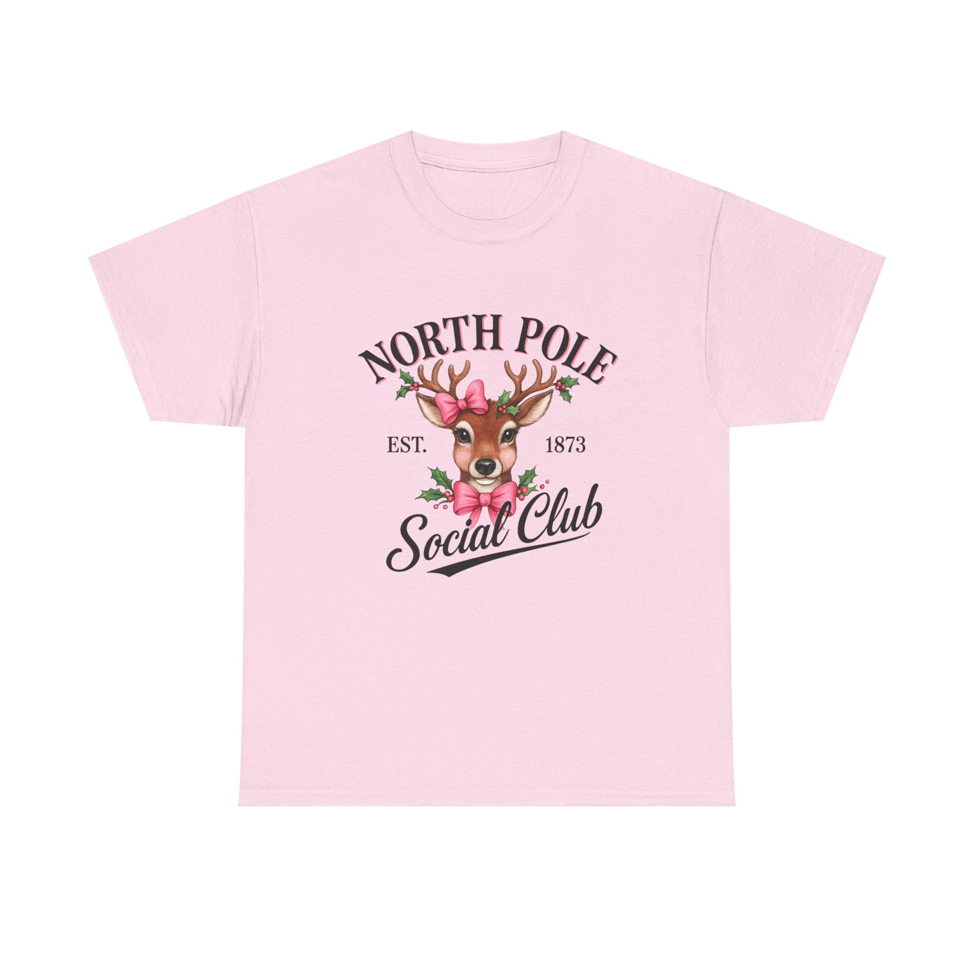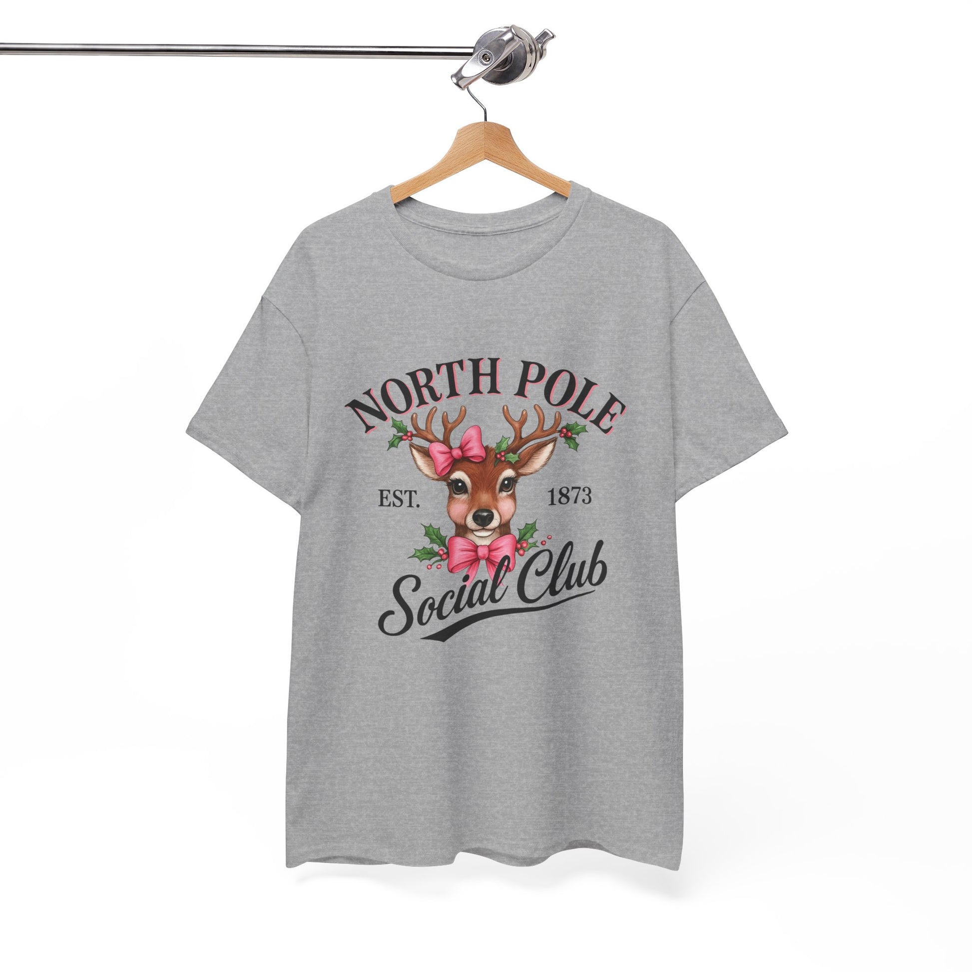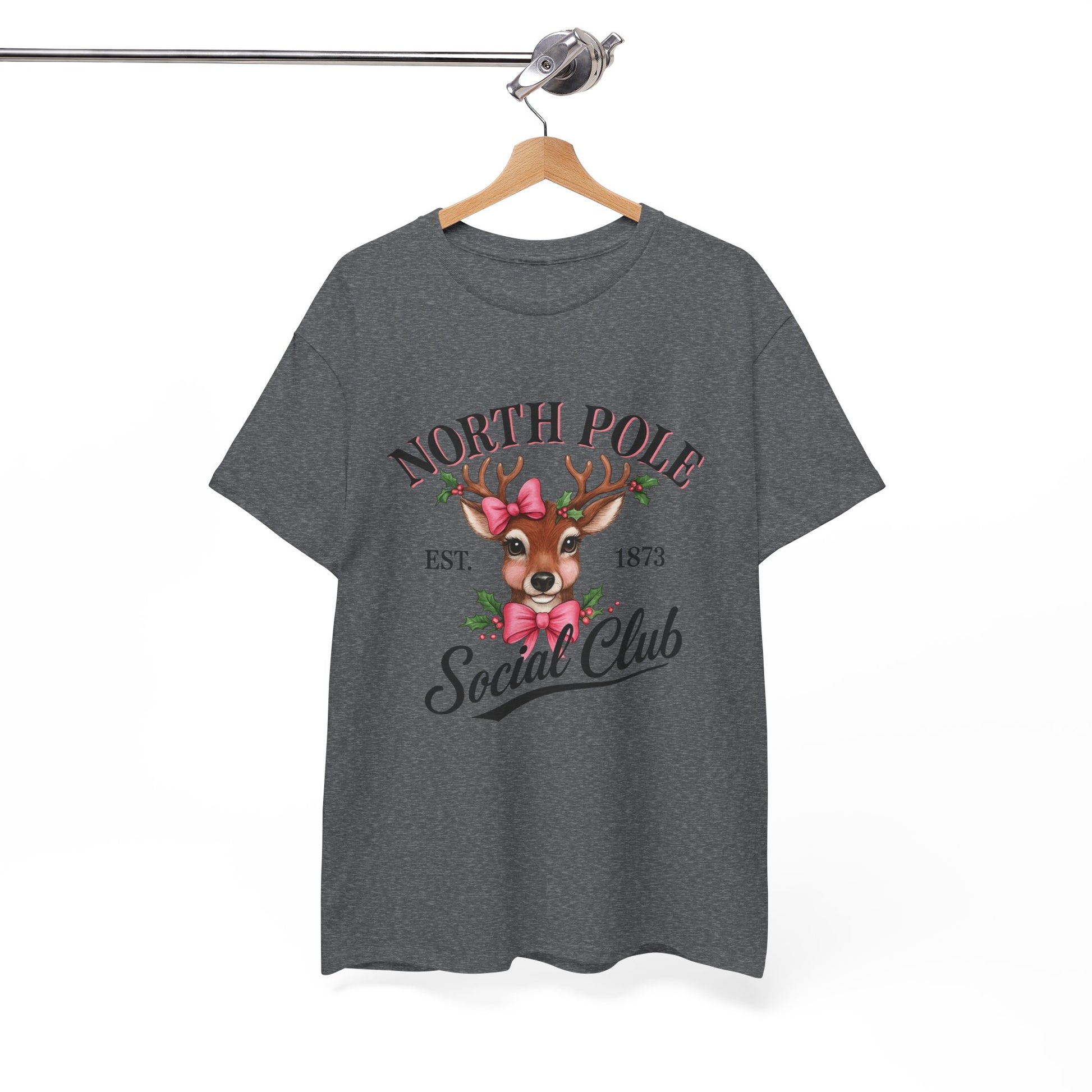 A vintage-inspired tee featuring a charming reindeer adorned with holly and a pink bow, celebrating the spirit of the North Pole Social Club. This tee offers year-round comfort with lasting durability, a classic fit, tear-away label, and ethical production.