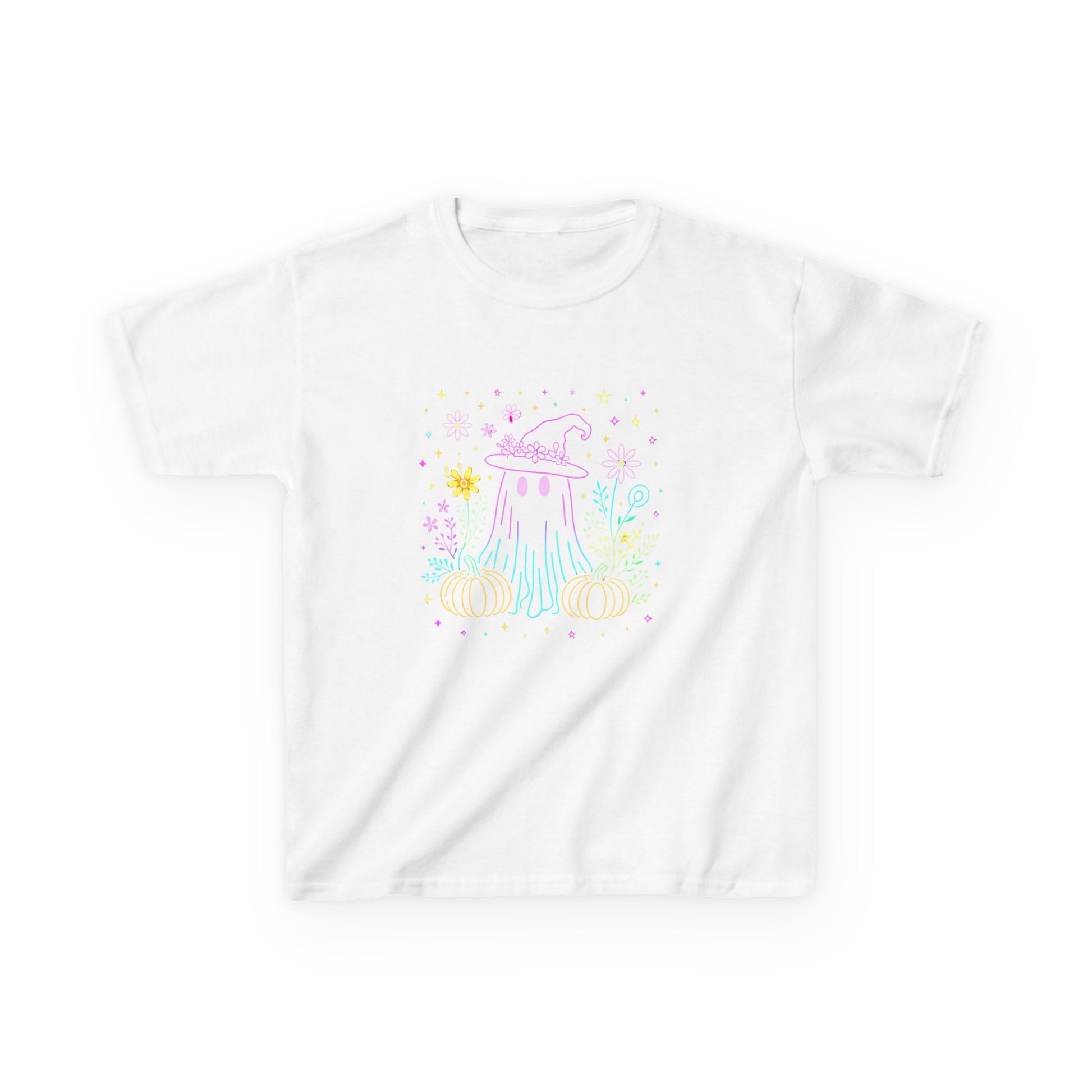 Embrace Halloween with this adorable kids' tee! Featuring a friendly ghost in a witch hat, surrounded by pumpkins, flowers, and stars in a soft pastel palette. This cute graphic tee is perfect for little ones. Ideal for Halloween, Autumn celebrations, or as a fun gift. It's comfortable, stylish, and sure to bring smiles!