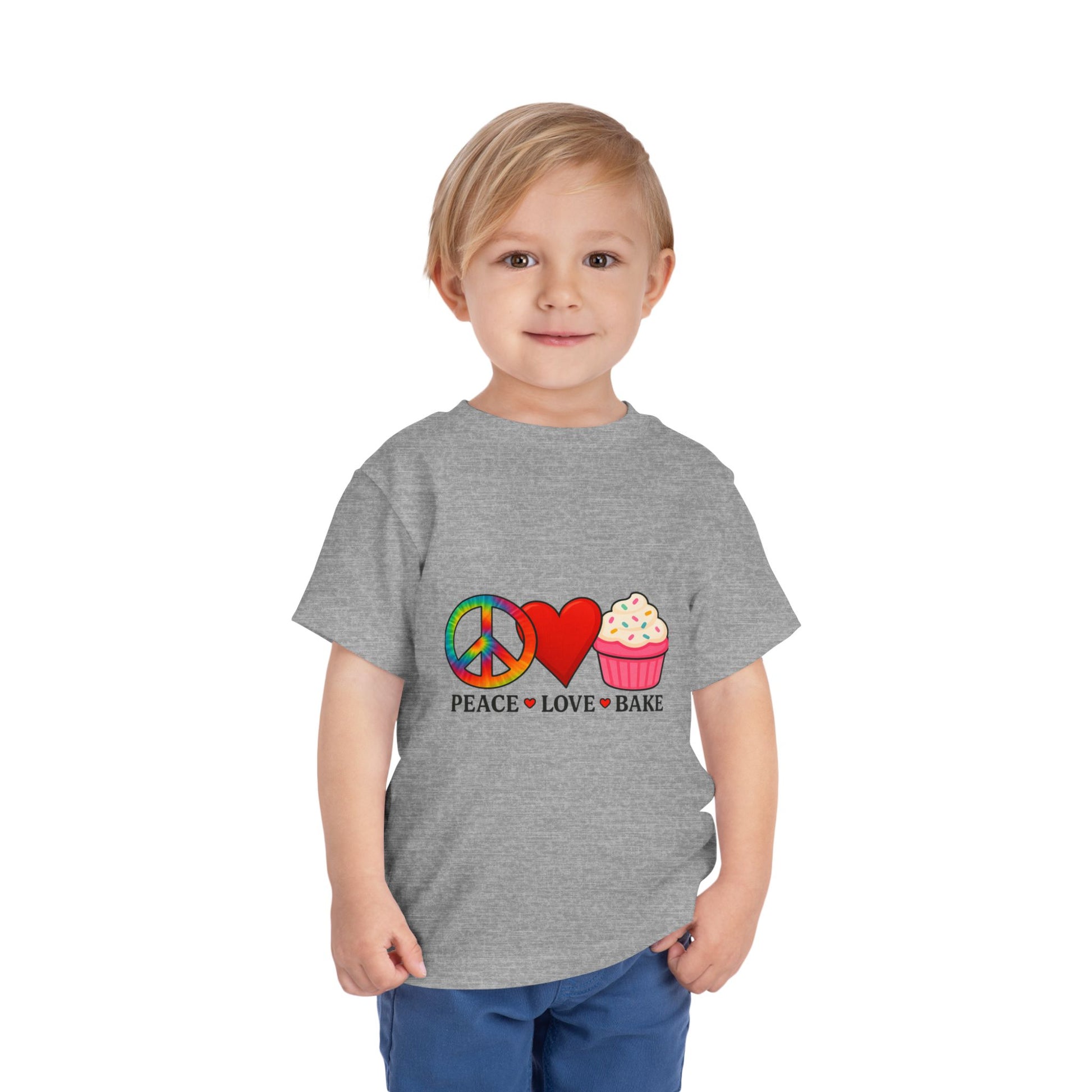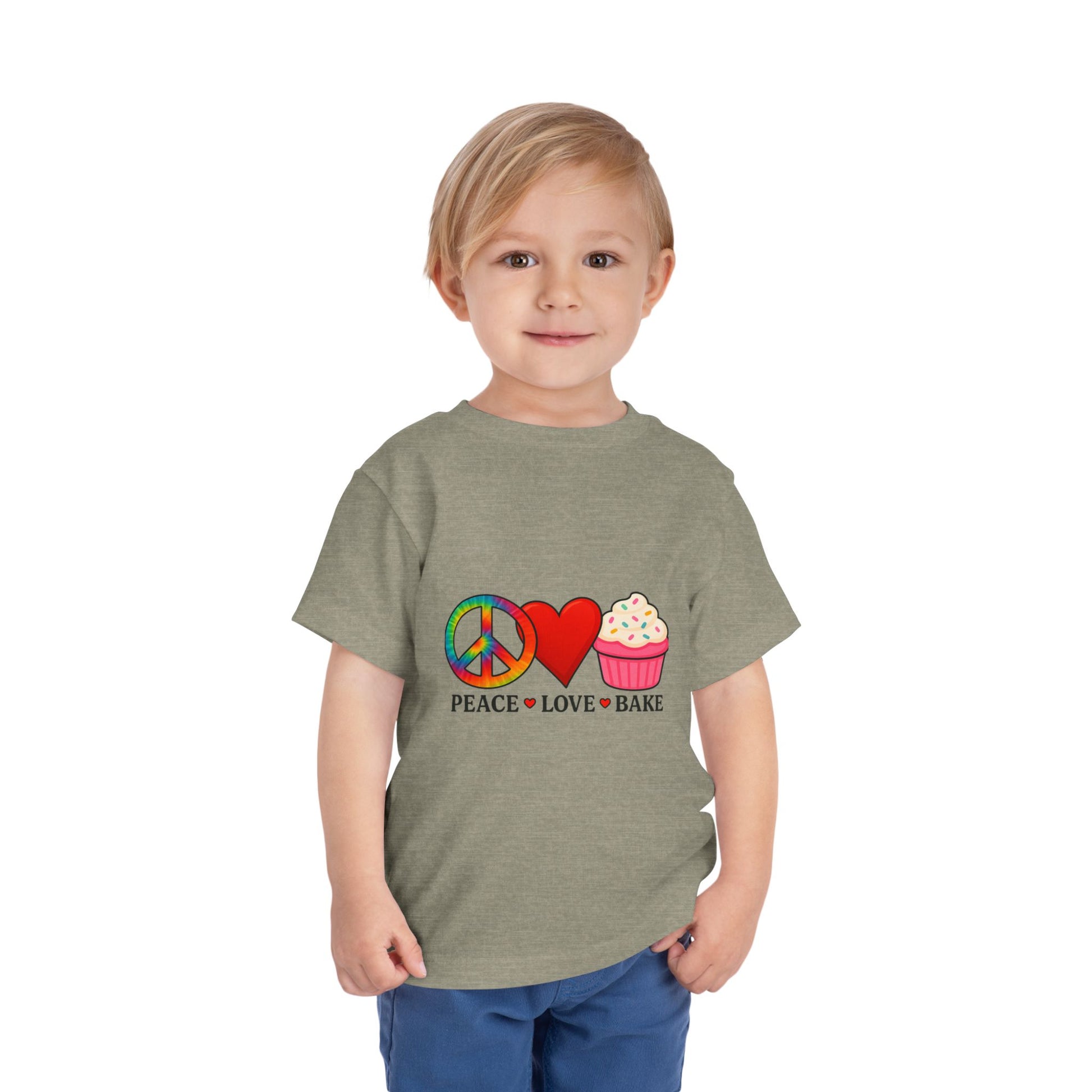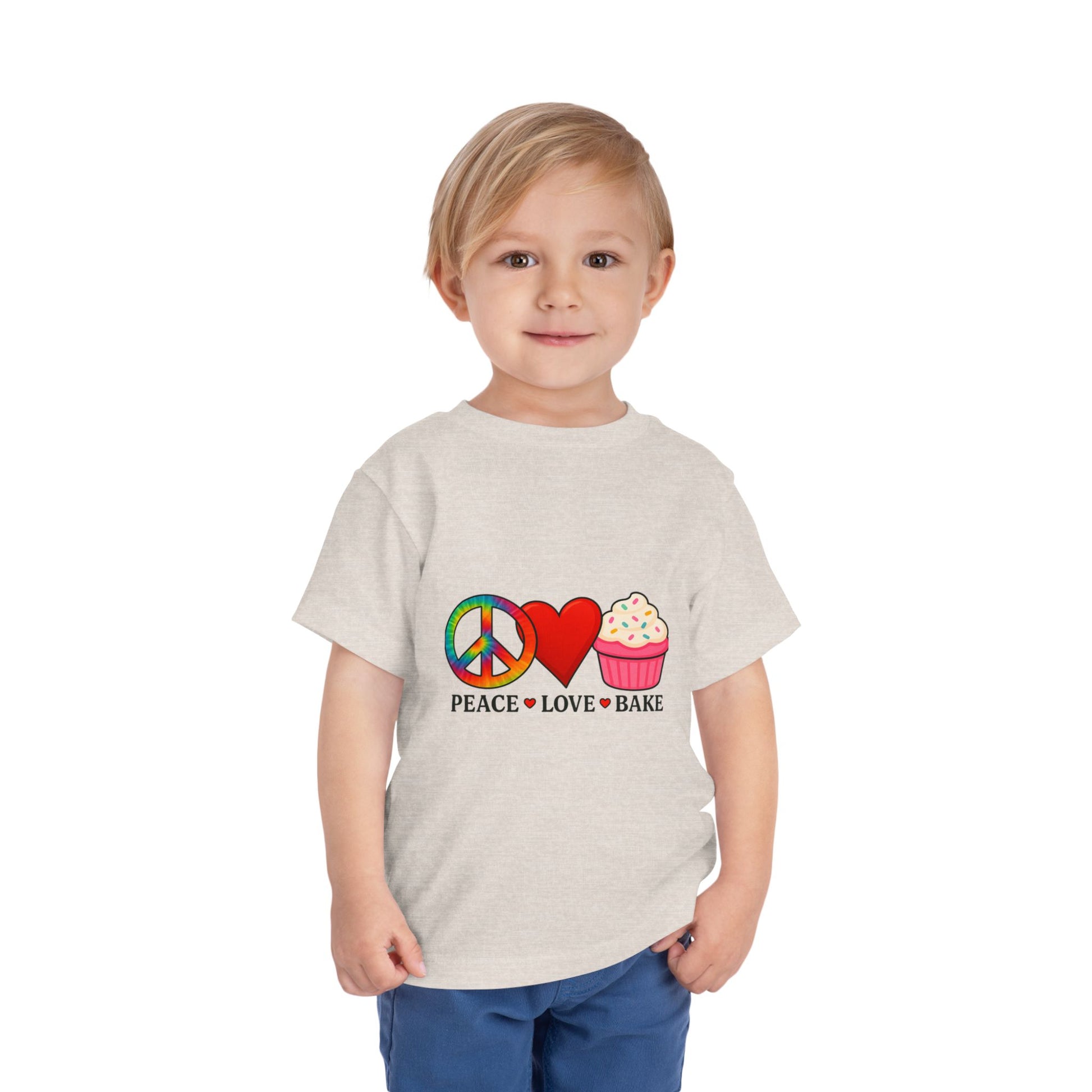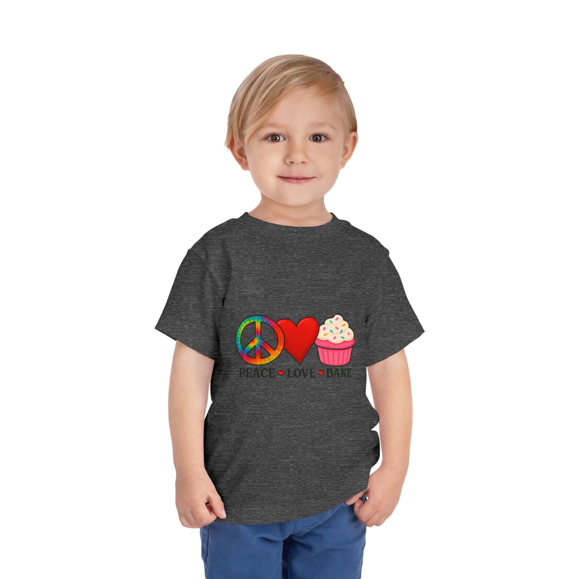 Spread holiday cheer with this adorable toddler tee! Featuring a cheerful peace sign, a bright heart, and a sprinkle-covered cupcake, this shirt embodies peace, love, and baking. Perfect for little ones to celebrate the season in style and comfort.