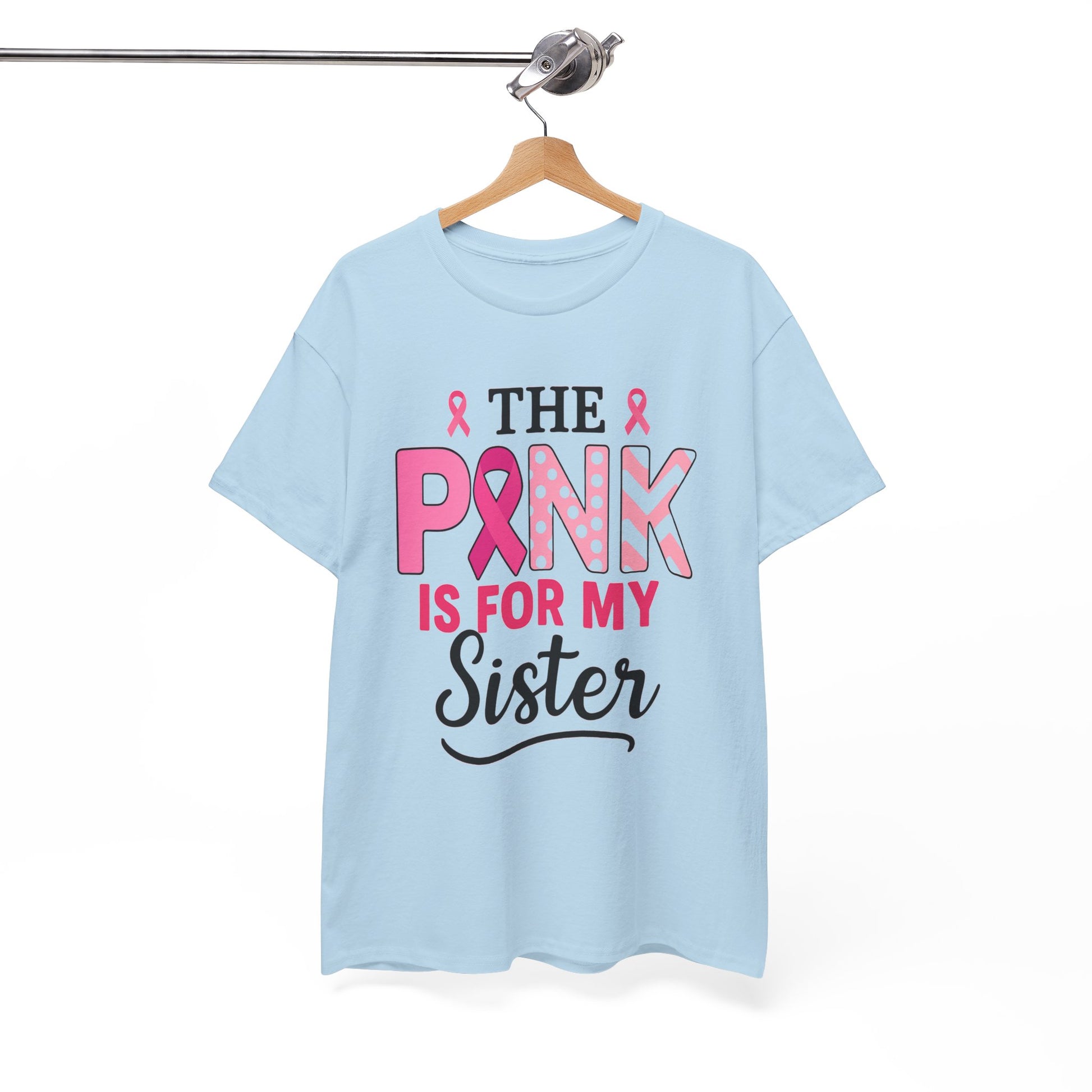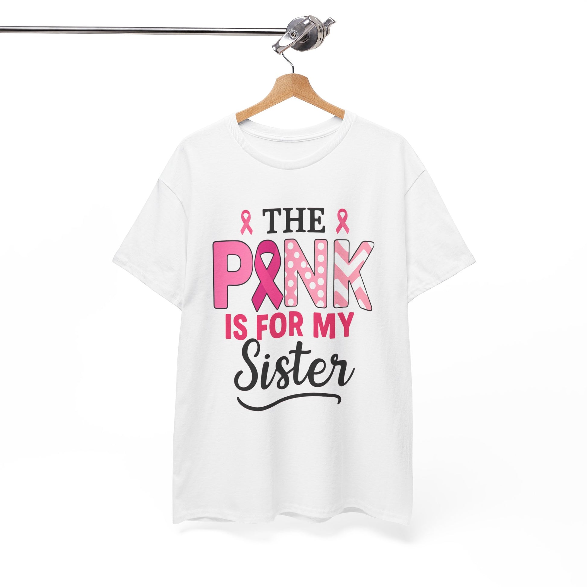 Show your support with this empowering breast cancer awareness tee! Featuring a bold design with 'THE PINK IS FOR MY Sister', this shirt spreads a message of hope and love. The design includes pink ribbon graphics and a clean, modern font. Perfect as a gift or for personal wear to support breast cancer awareness. Made with comfortable, high-quality fabric.