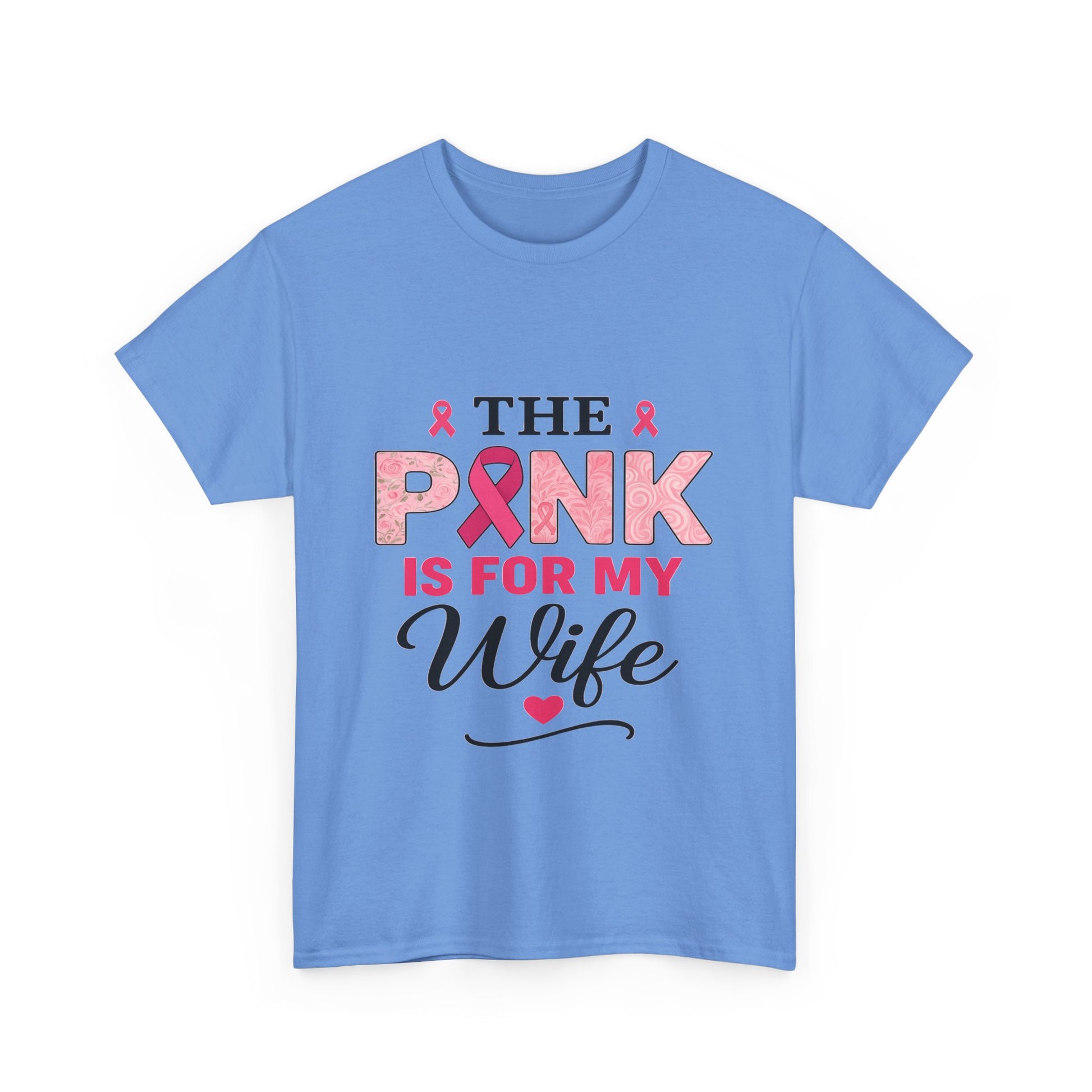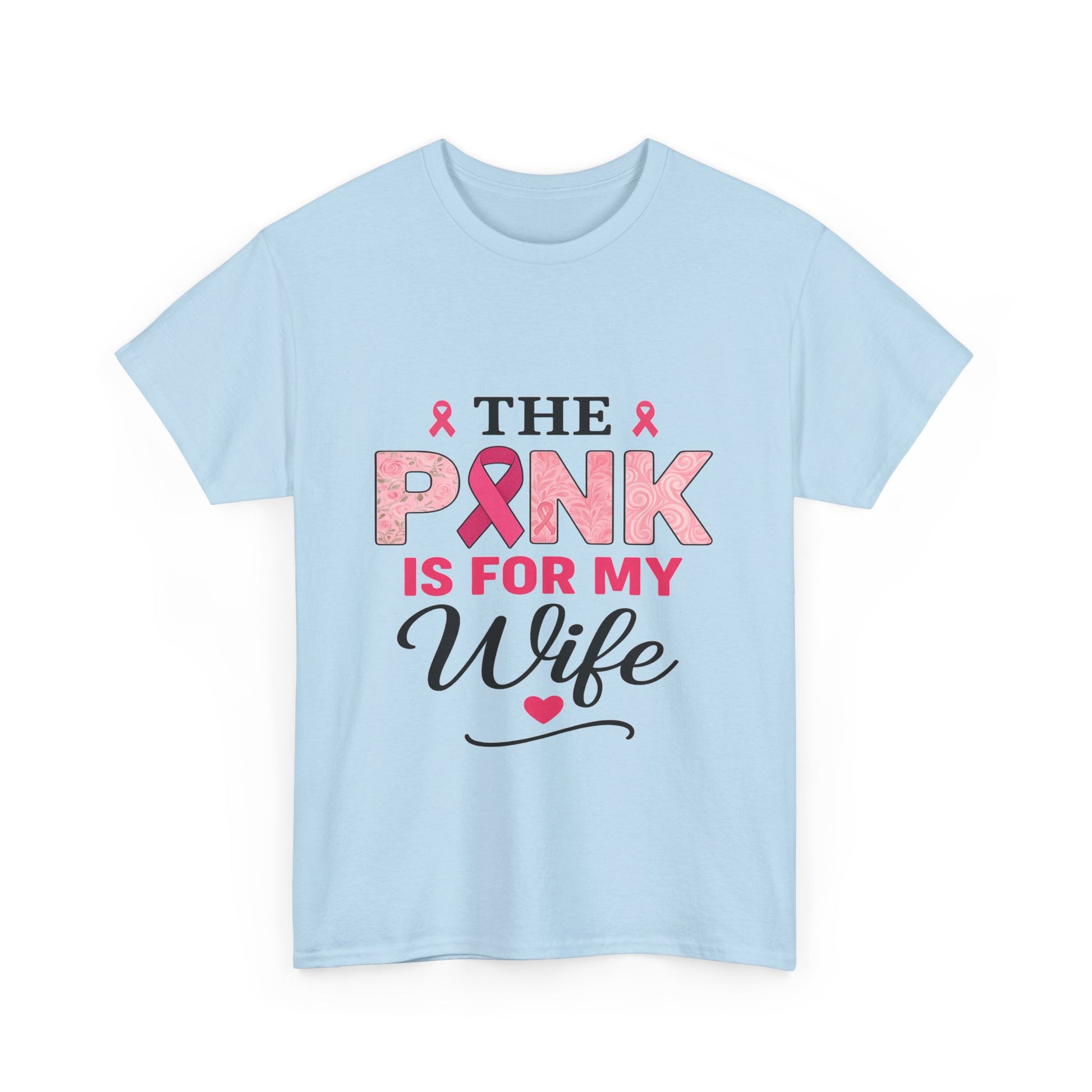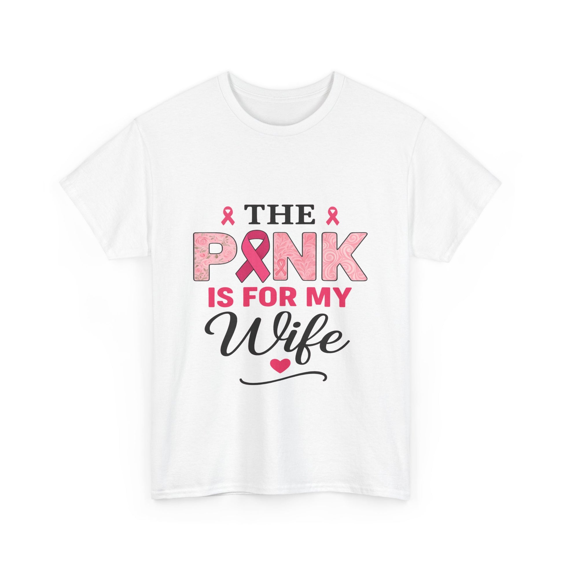 Show your love and support with this empowering breast cancer awareness tee. Featuring a bold design with pink ribbons and floral details, it's a perfect gift to honor a loved one. The design includes "PINK" with a prominent pink ribbon, "IS FOR MY" in vibrant pink, and "Wife" in cursive with a heart. Made with soft, comfortable material, this unisex tee spreads a message of hope and solidarity.