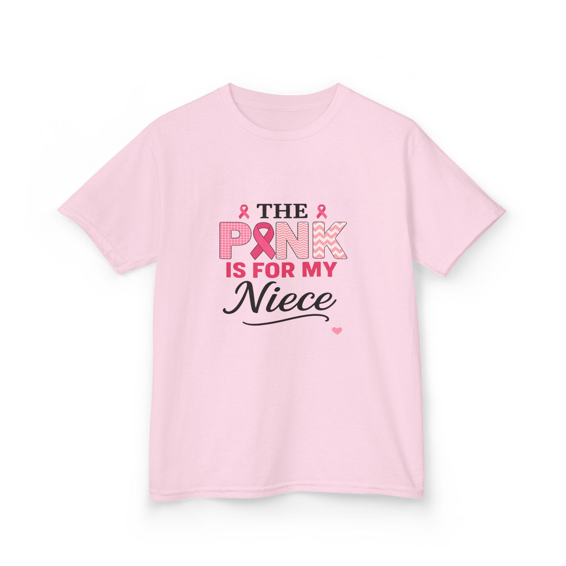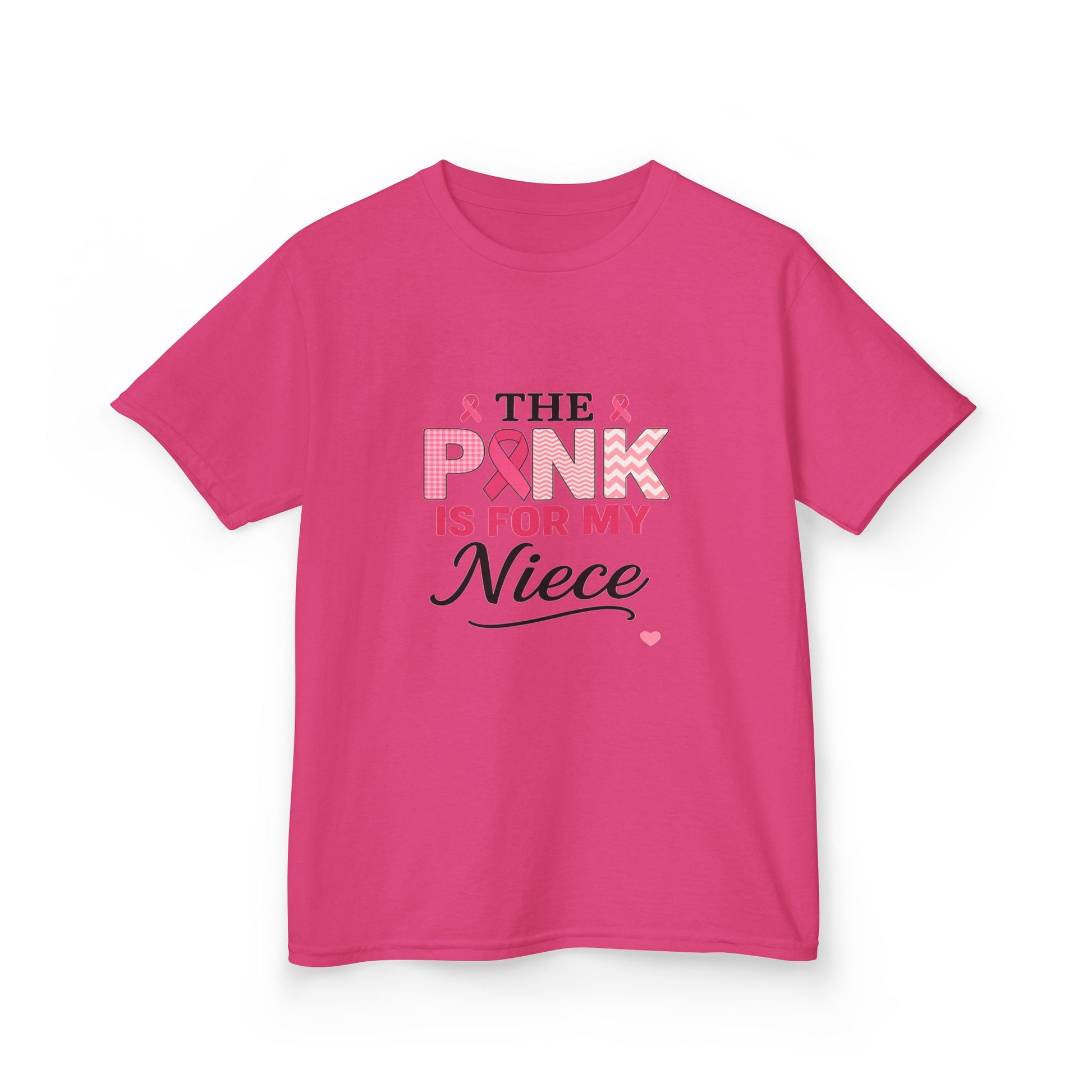 Celebrate the holidays with this adorable dinosaur tee! Featuring a unique design with a breast cancer awareness theme, it's perfect for kids. This festive shirt includes the words "THE PINK" with a special design dedicated to a niece, along with a cute heart. Great for Christmas, parties, or any day! Made with soft, comfortable fabric for all-day wear.