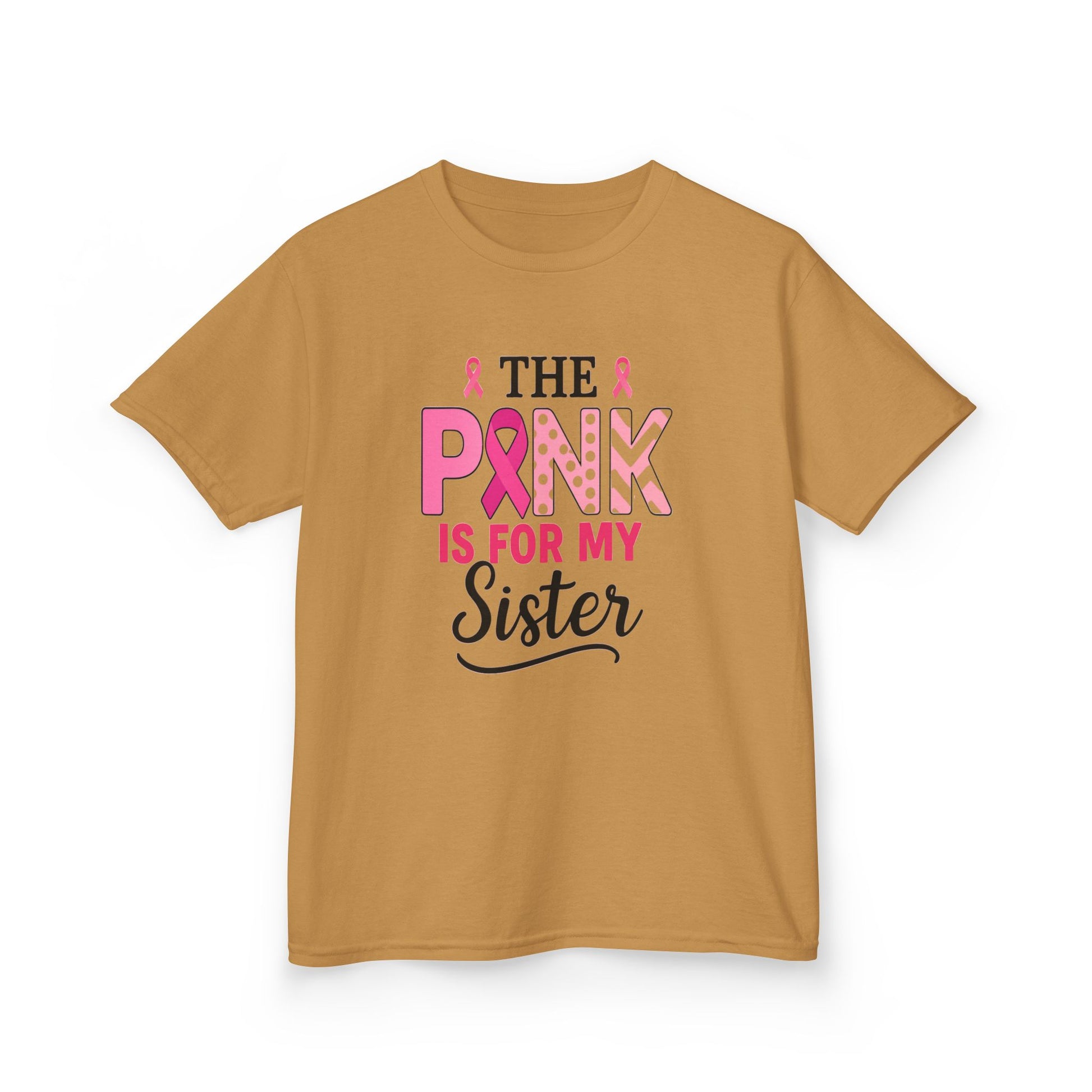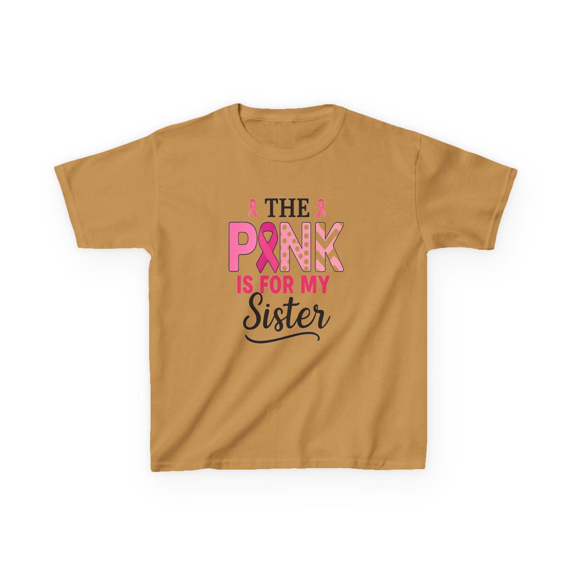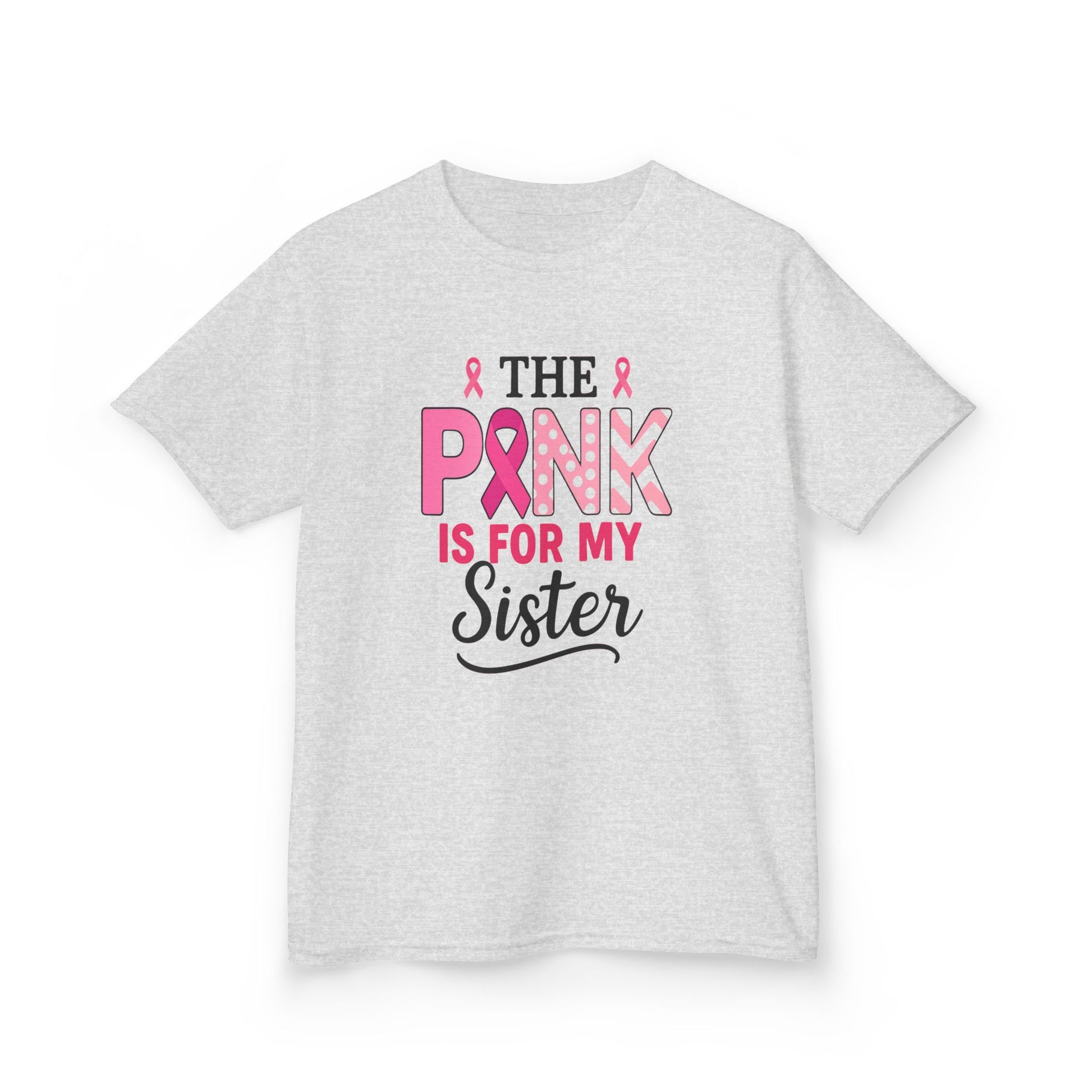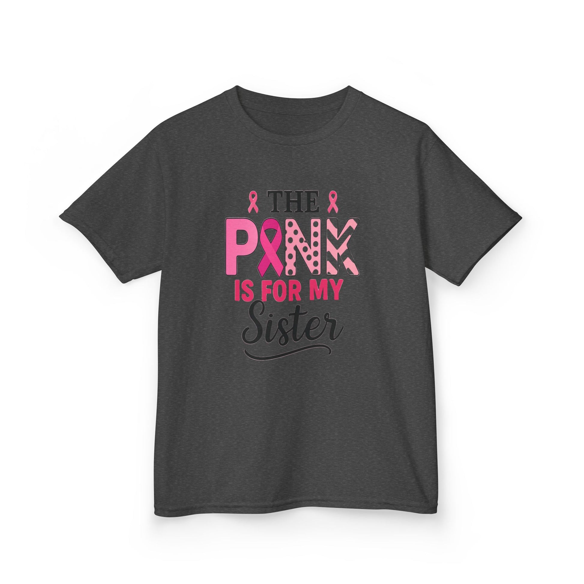 Show your support with this heartwarming breast cancer awareness tee! Featuring a playful 'PINK' design with a breast cancer ribbon and the message 'IS FOR MY Sister,' this shirt is perfect for raising awareness and showing solidarity. Crafted with soft, comfortable materials, this tee is ideal for wearing year-round. A thoughtful and stylish gift for any child to show their love and support.