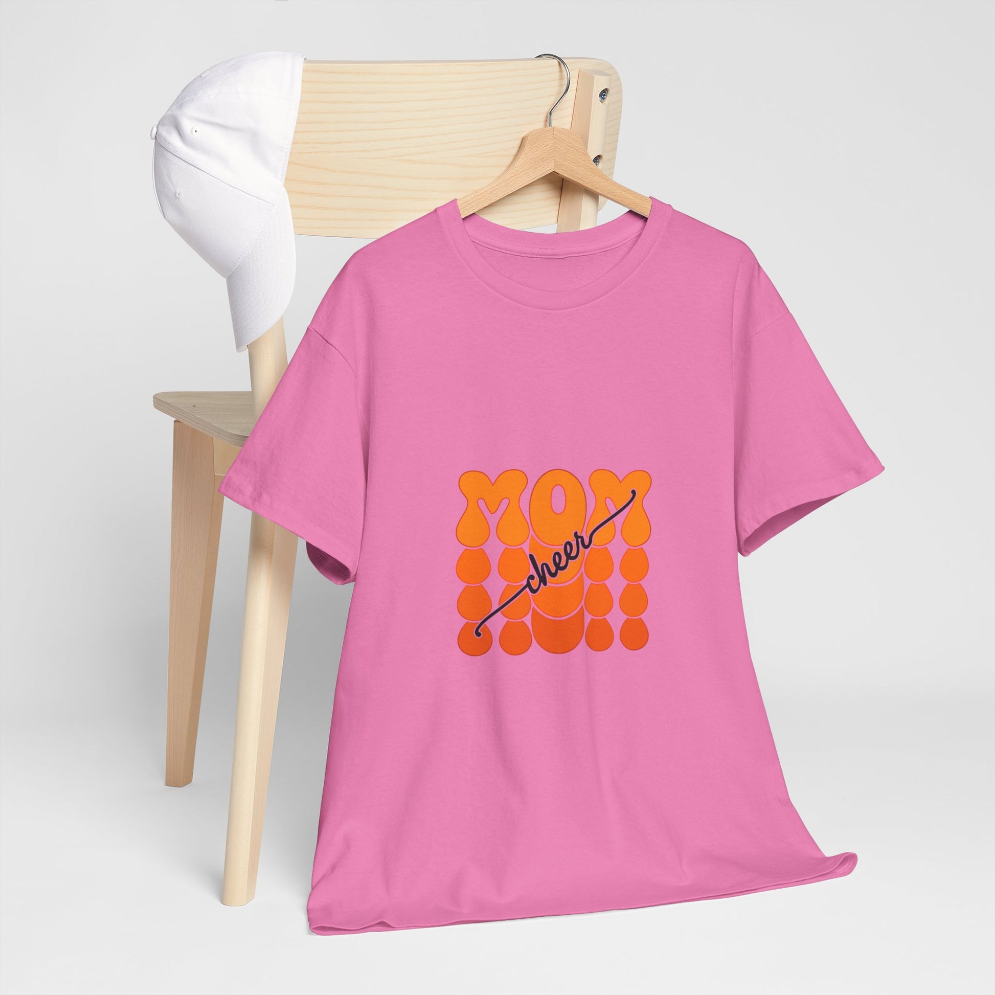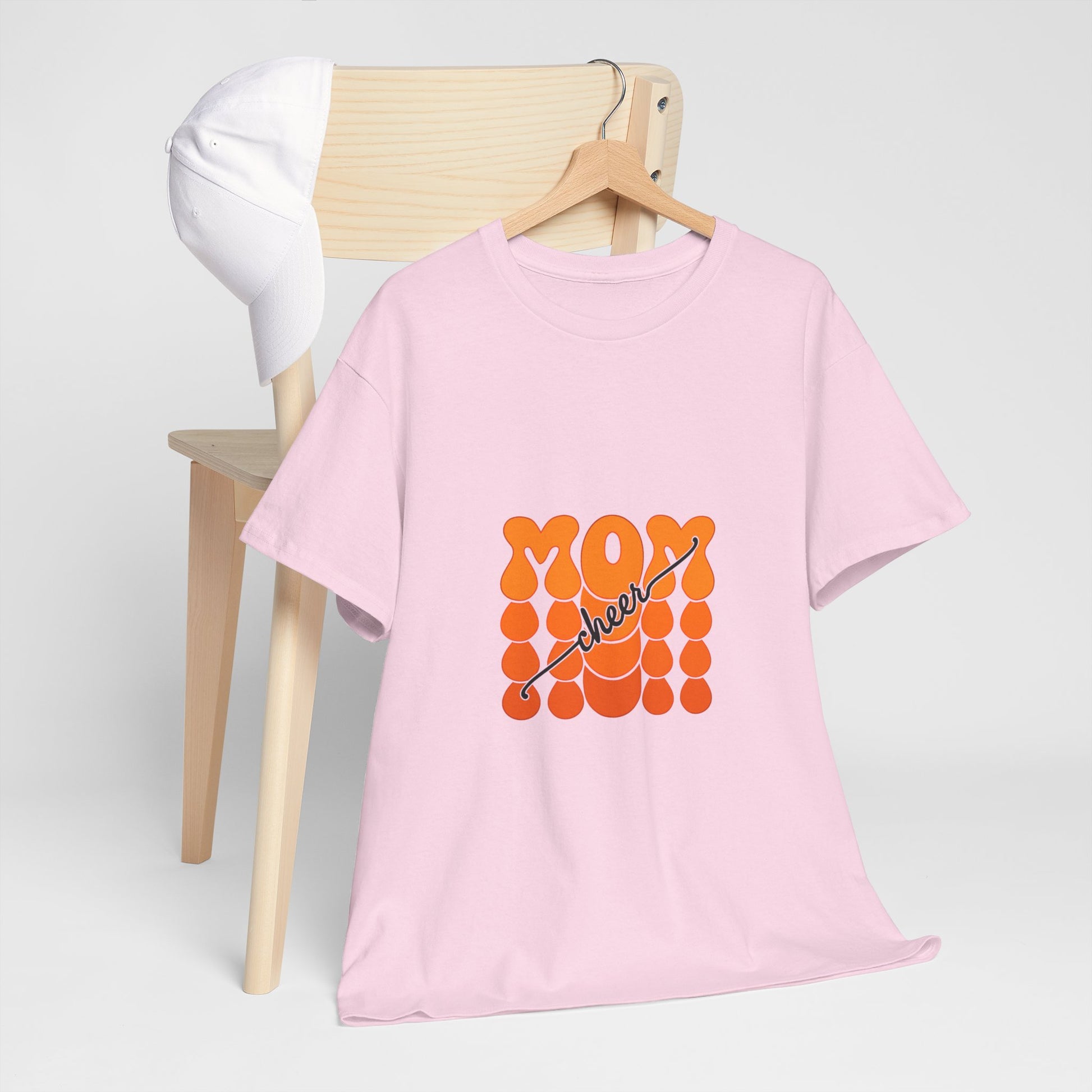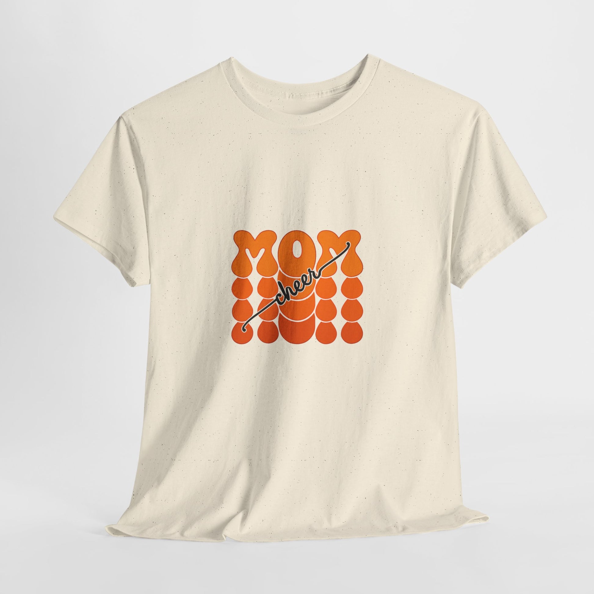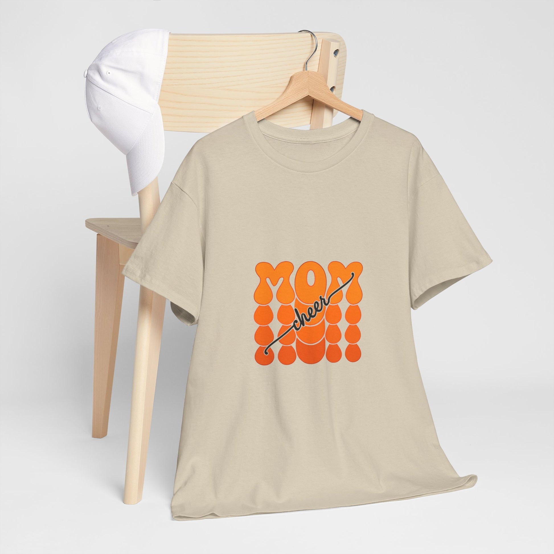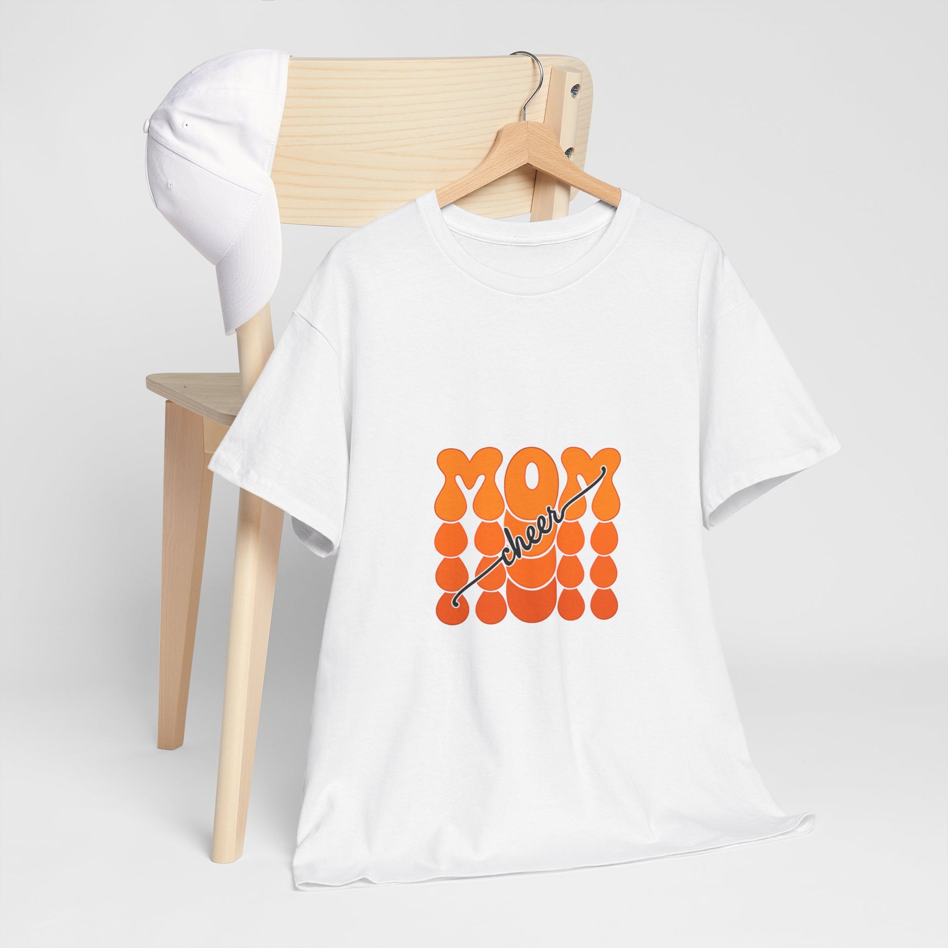 Show your support with this groovy "Mom Cheer" tee! Featuring a retro design with bold orange "MOM" letters and a flowing "cheer" script, this shirt is a perfect blend of style and support. The warm color palette and playful vibe make it a cheerful statement piece.