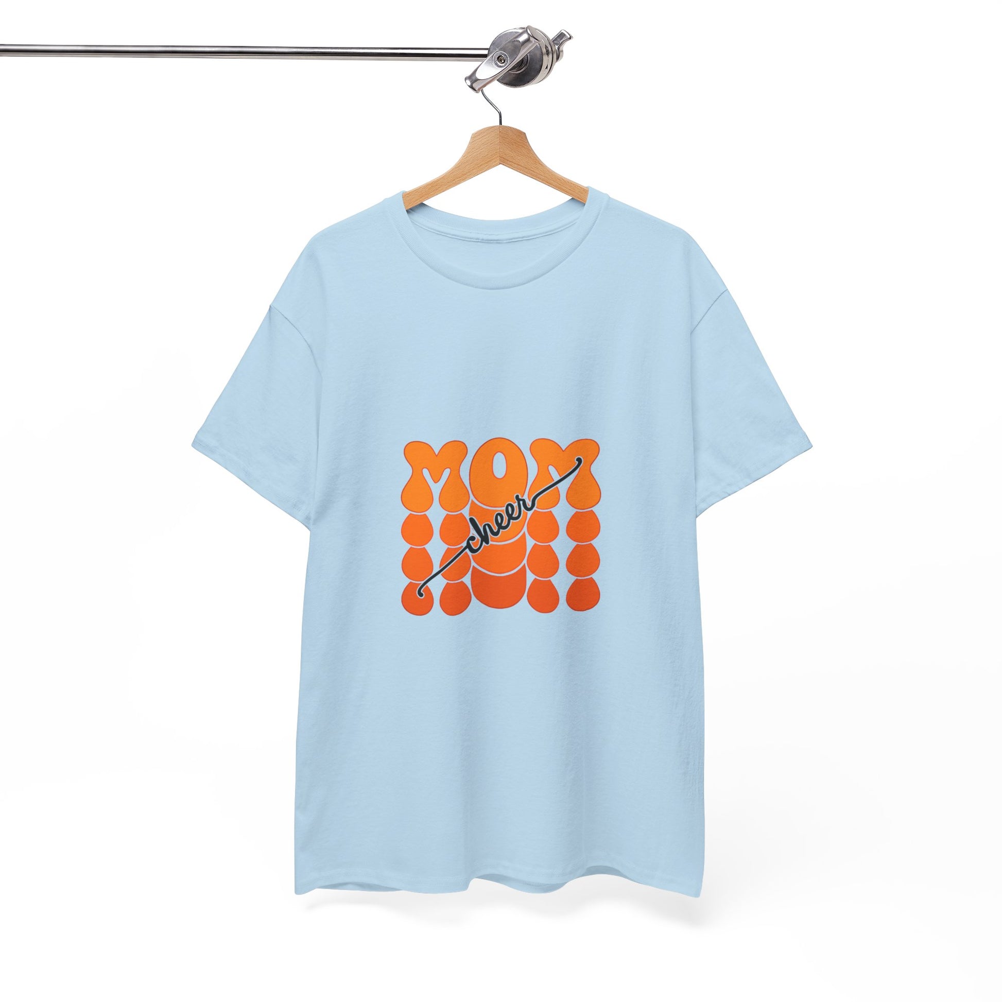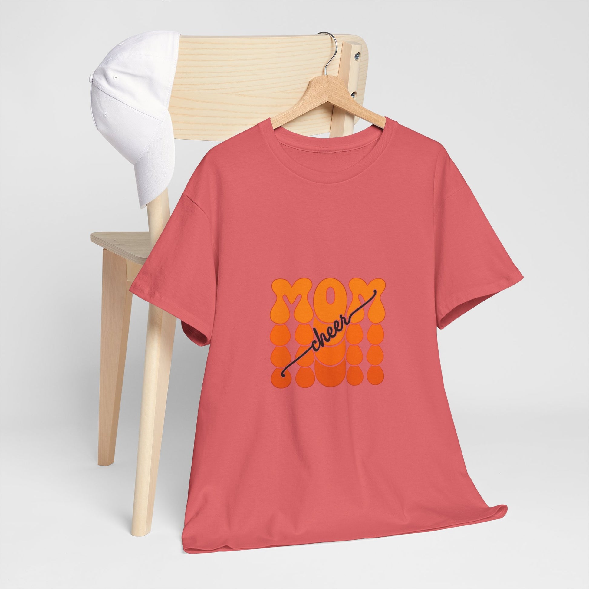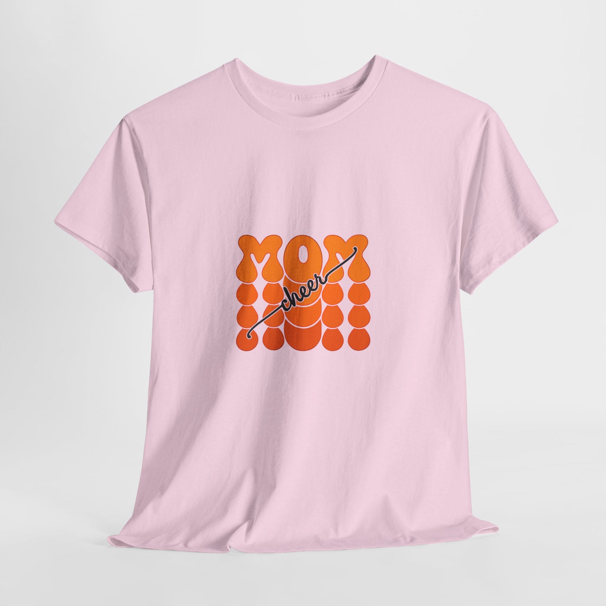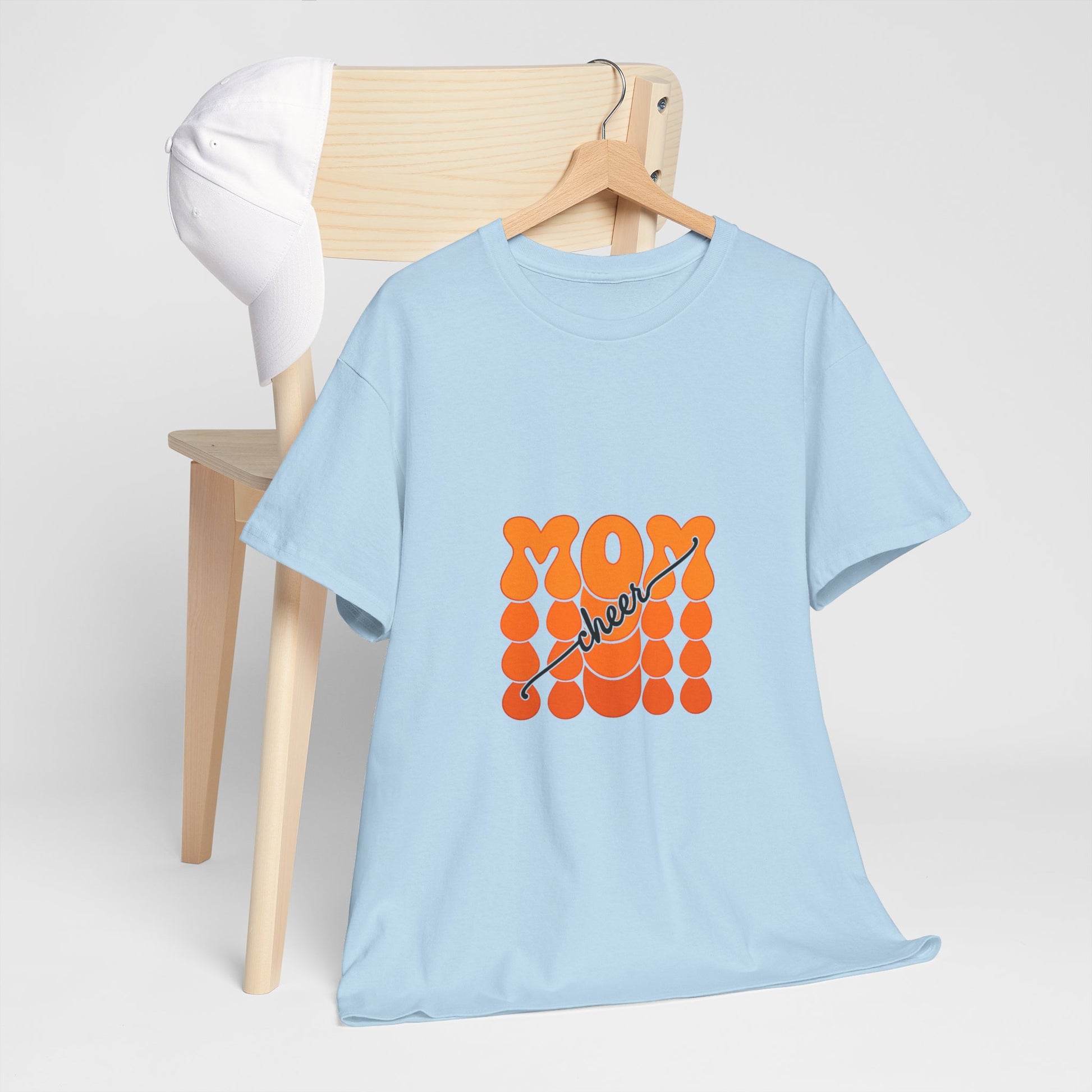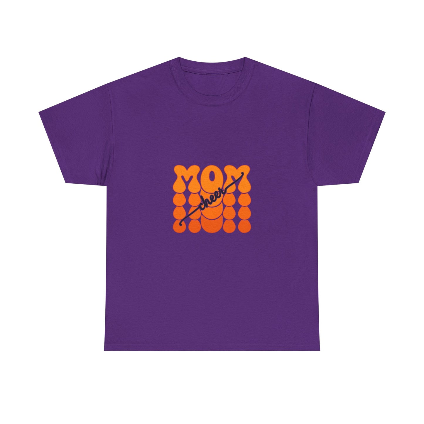 Show your support with this groovy "Mom Cheer" tee! Featuring a retro design with bold orange "MOM" letters and a flowing "cheer" script, this shirt is a perfect blend of style and support. The warm color palette and playful vibe make it a cheerful statement piece.