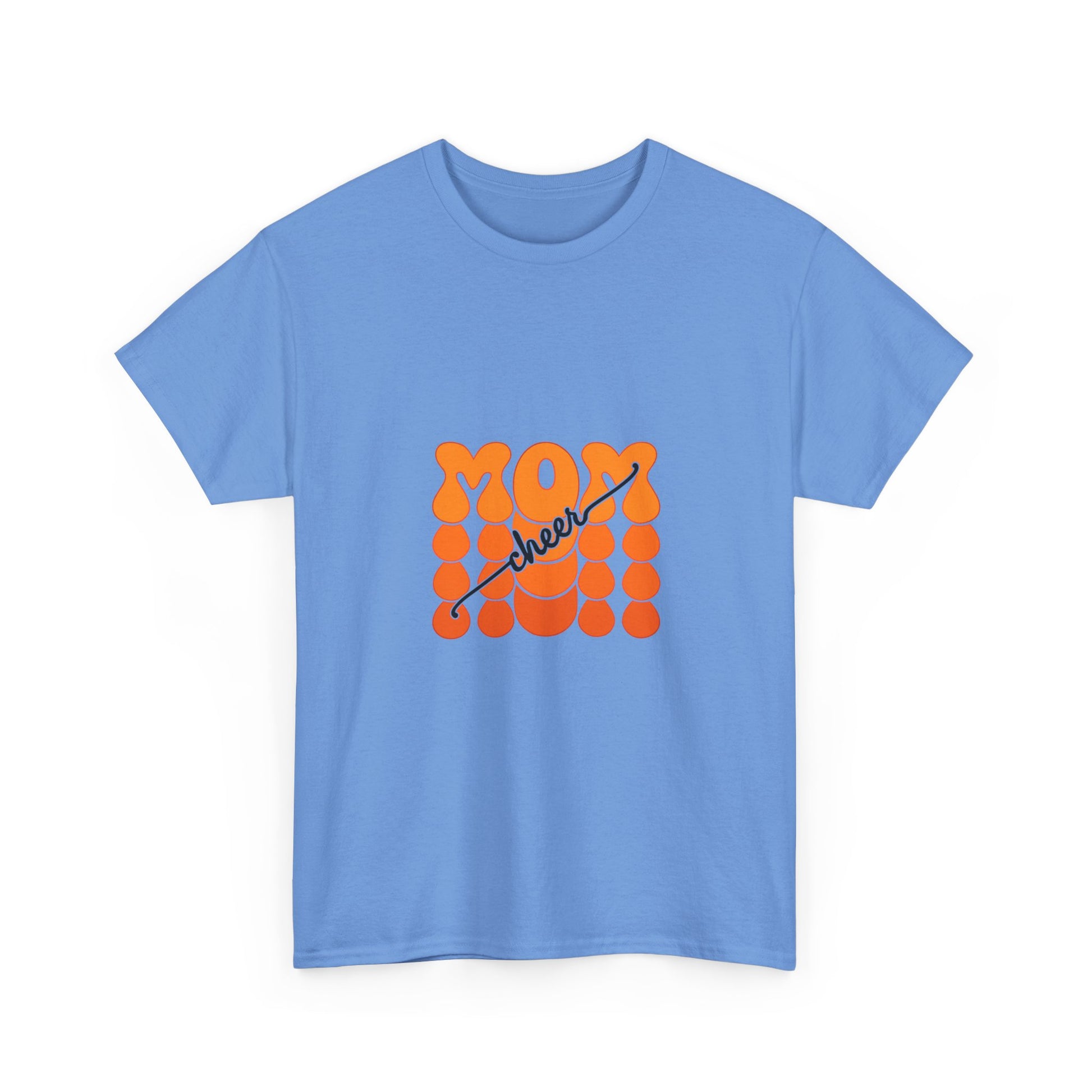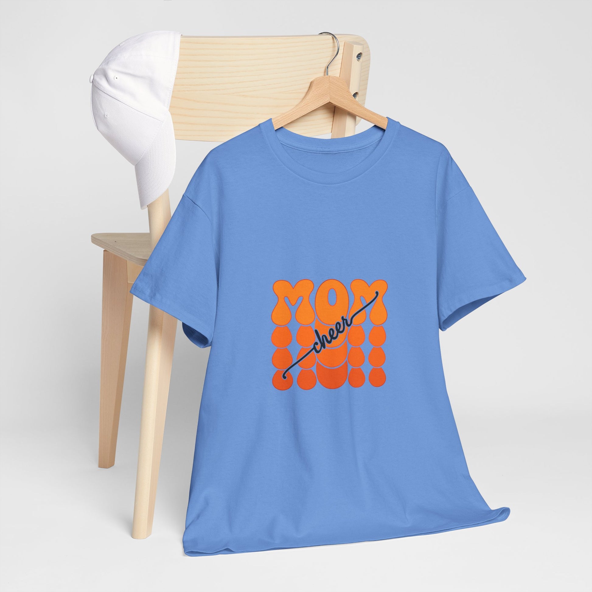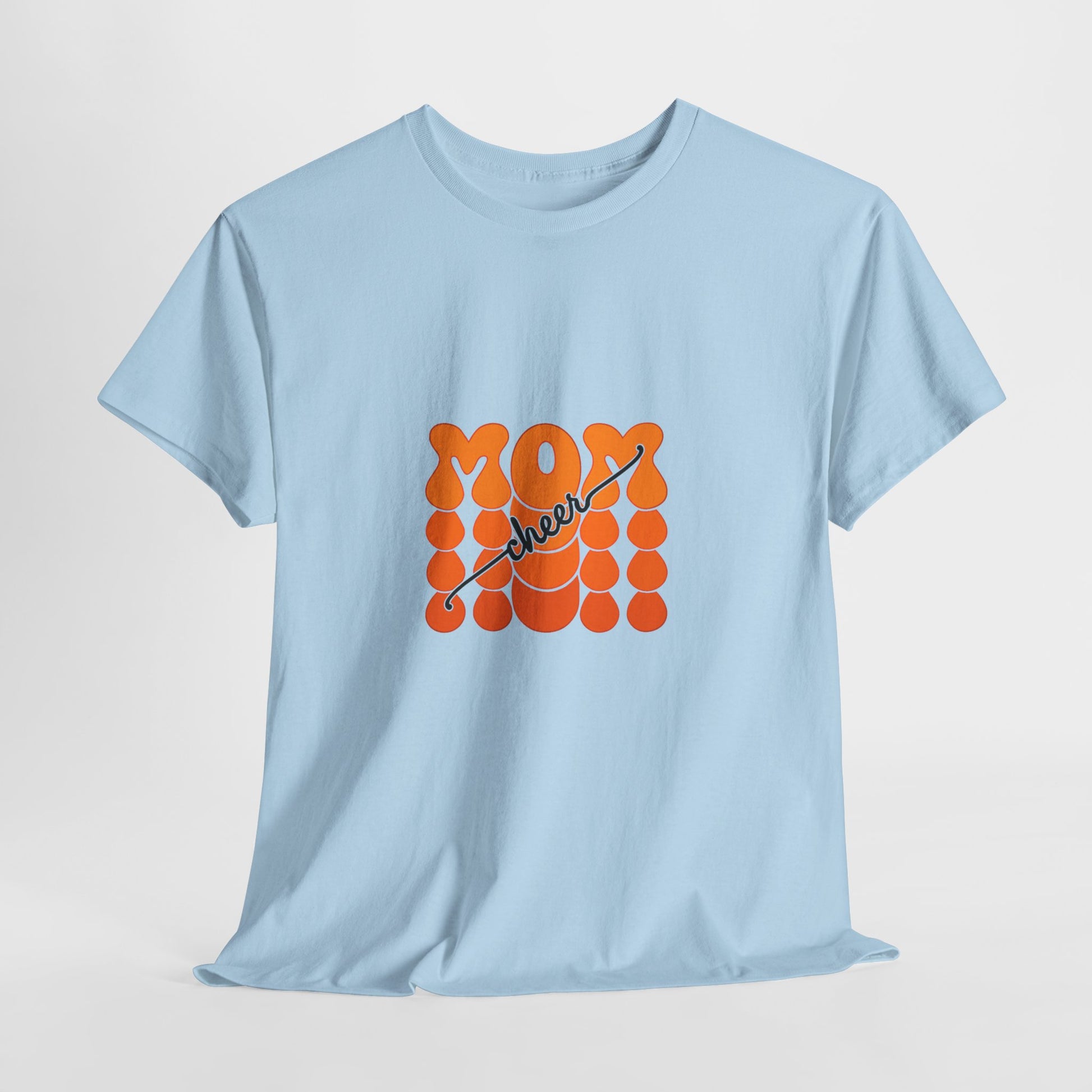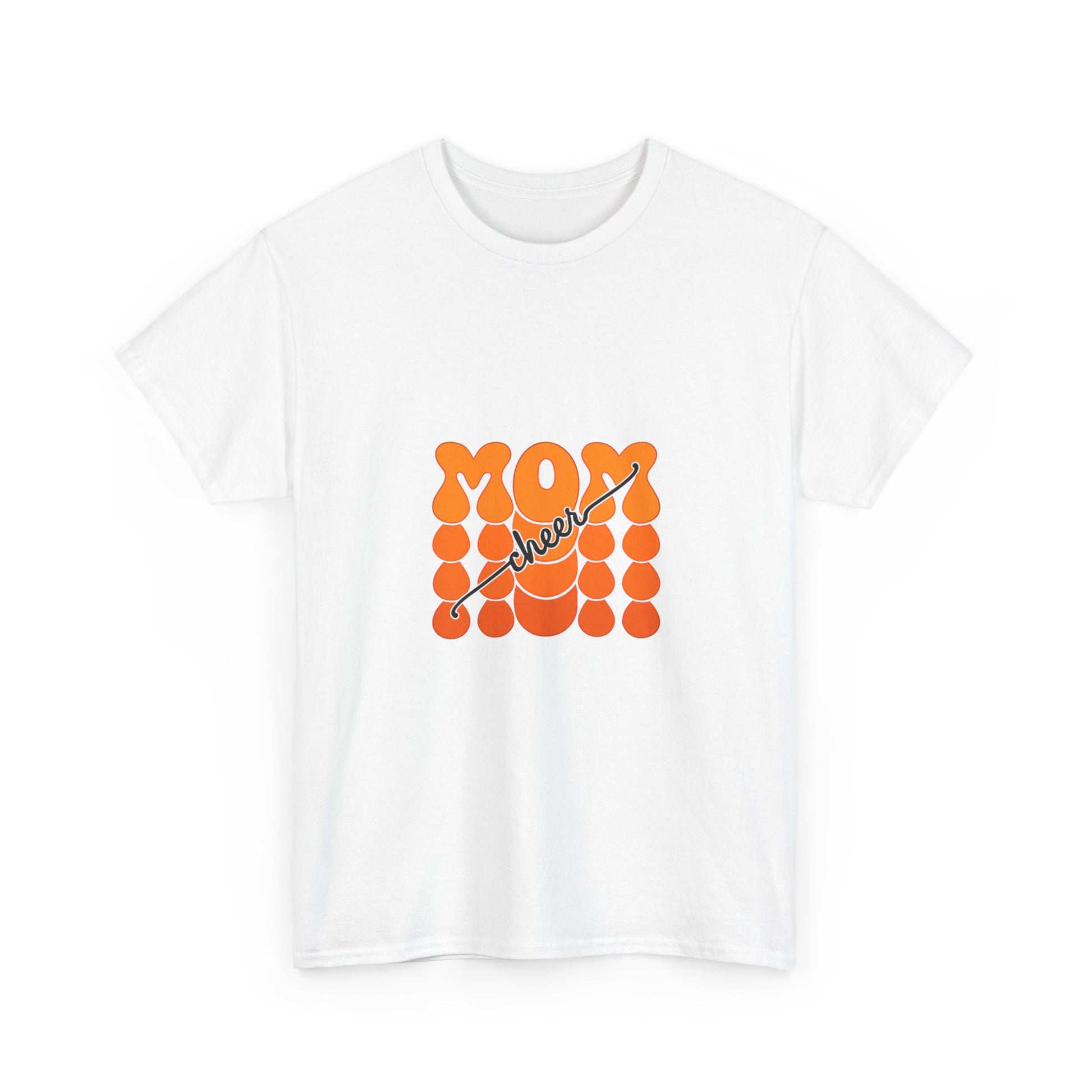 Show your support with this groovy "Mom Cheer" tee! Featuring a retro design with bold orange "MOM" letters and a flowing "cheer" script, this shirt is a perfect blend of style and support. The warm color palette and playful vibe make it a cheerful statement piece.