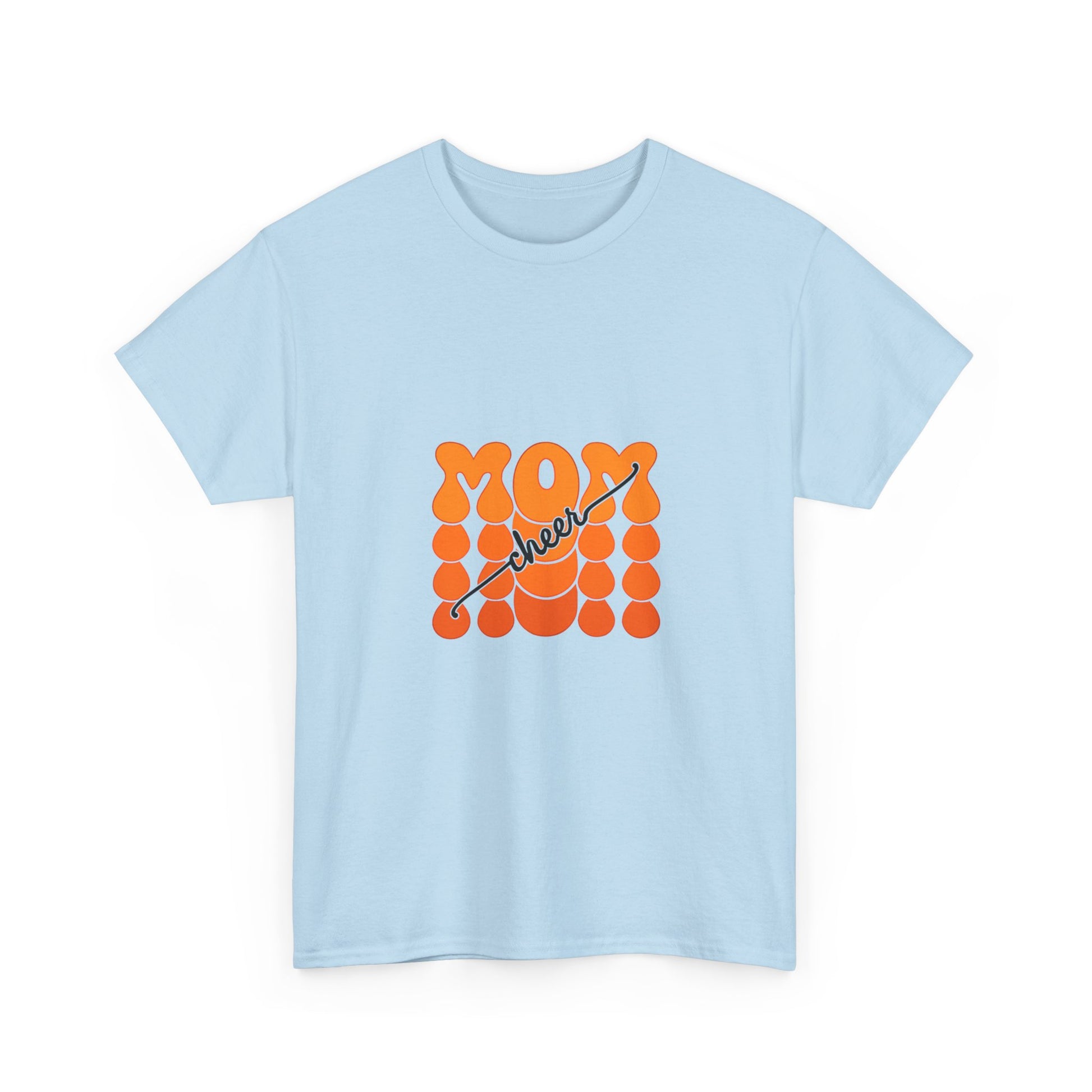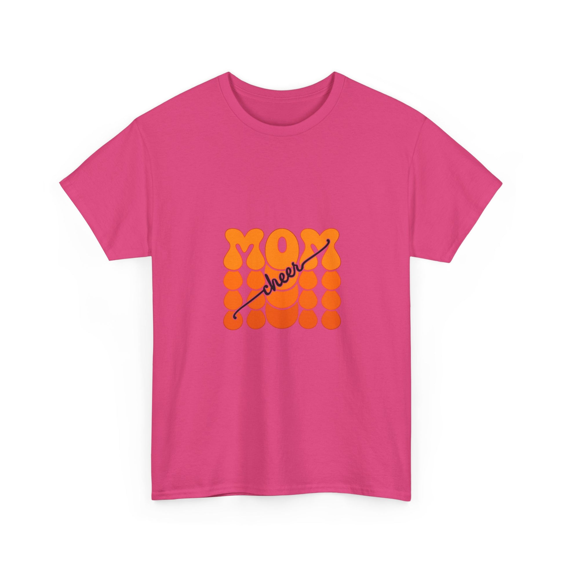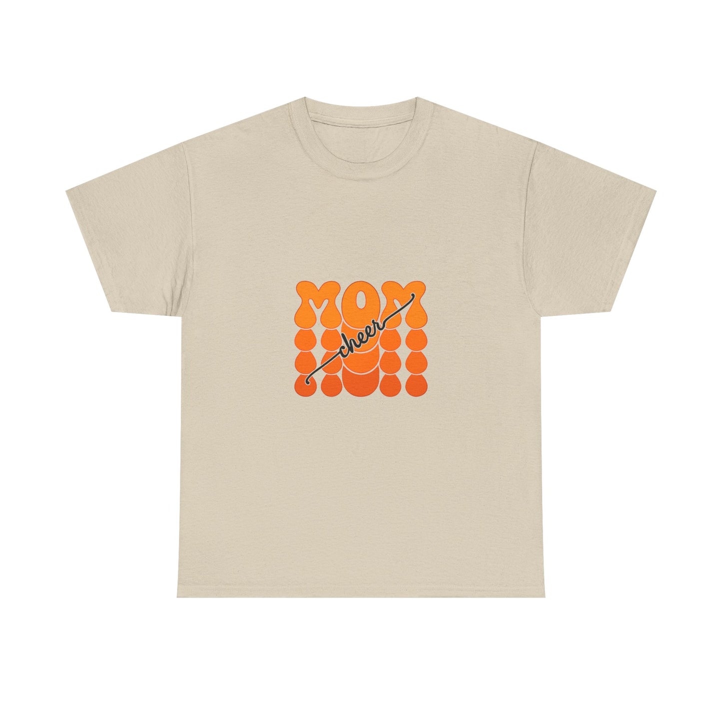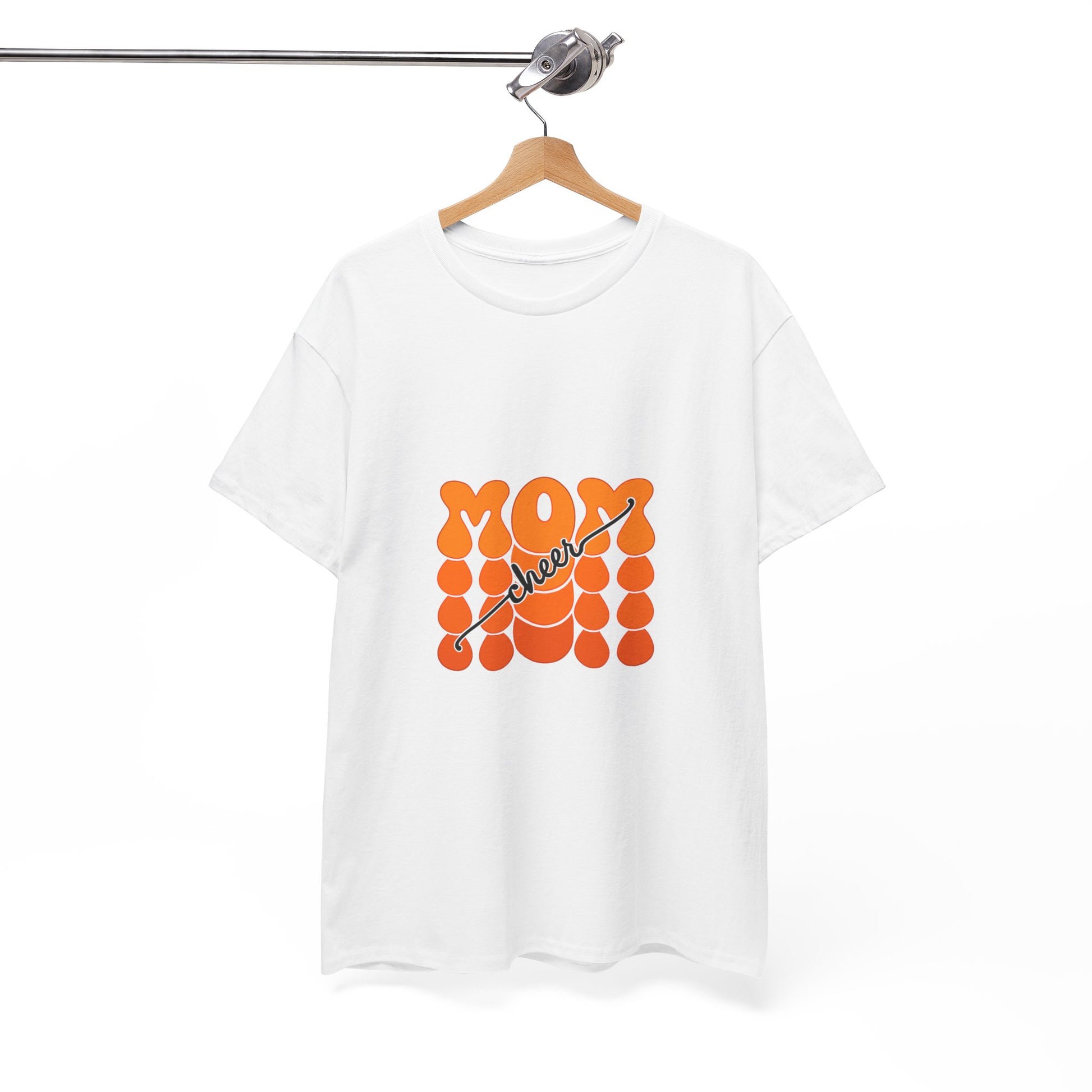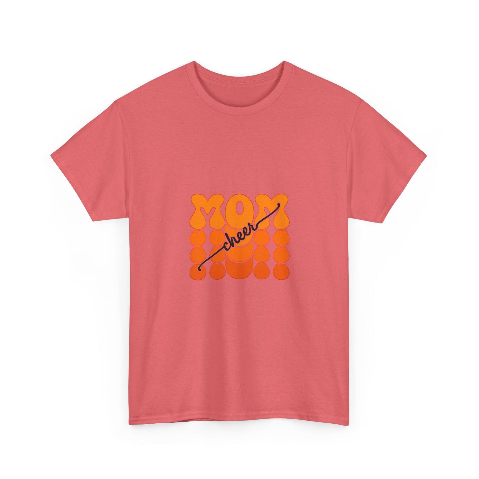 Show your support with this groovy "Mom Cheer" tee! Featuring a retro design with bold orange "MOM" letters and a flowing "cheer" script, this shirt is a perfect blend of style and support. The warm color palette and playful vibe make it a cheerful statement piece.