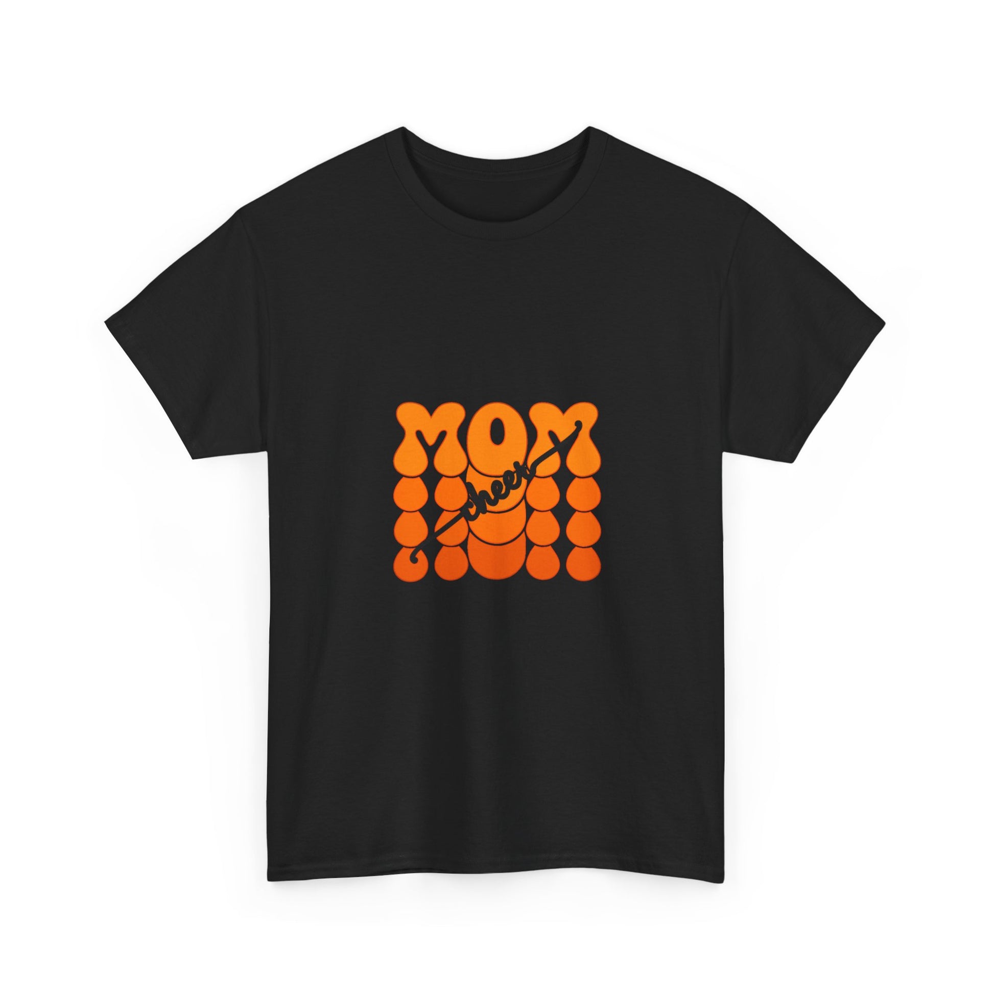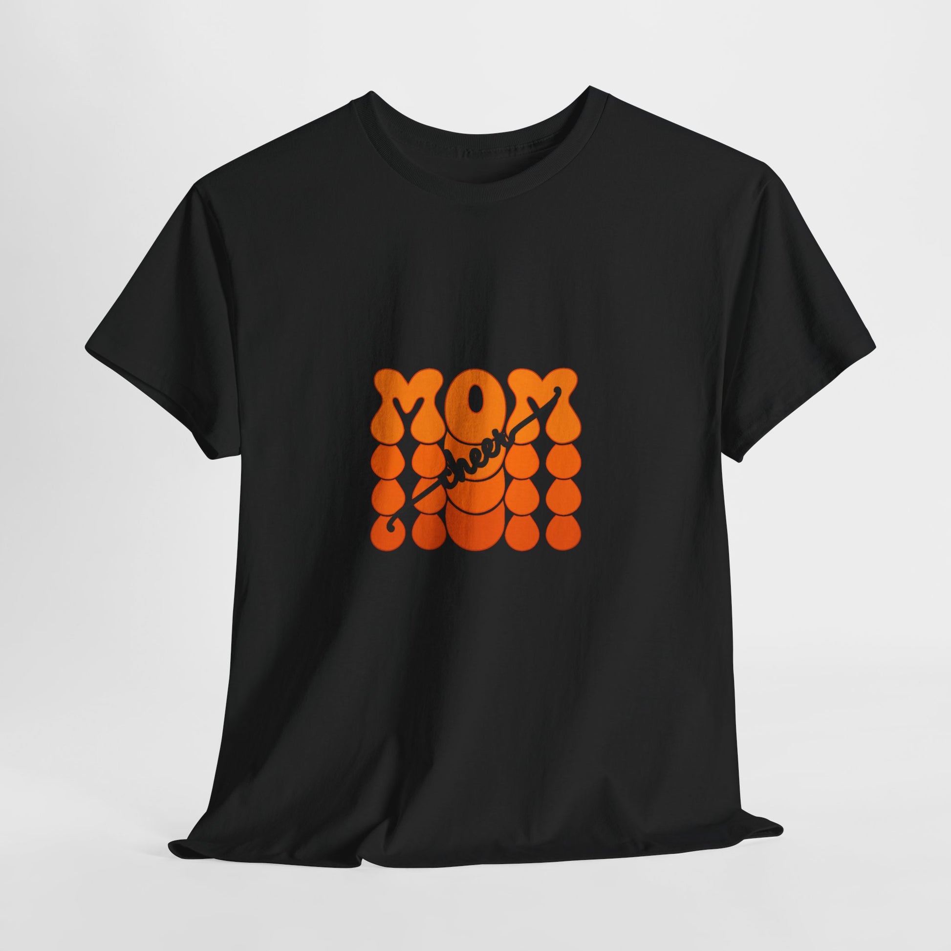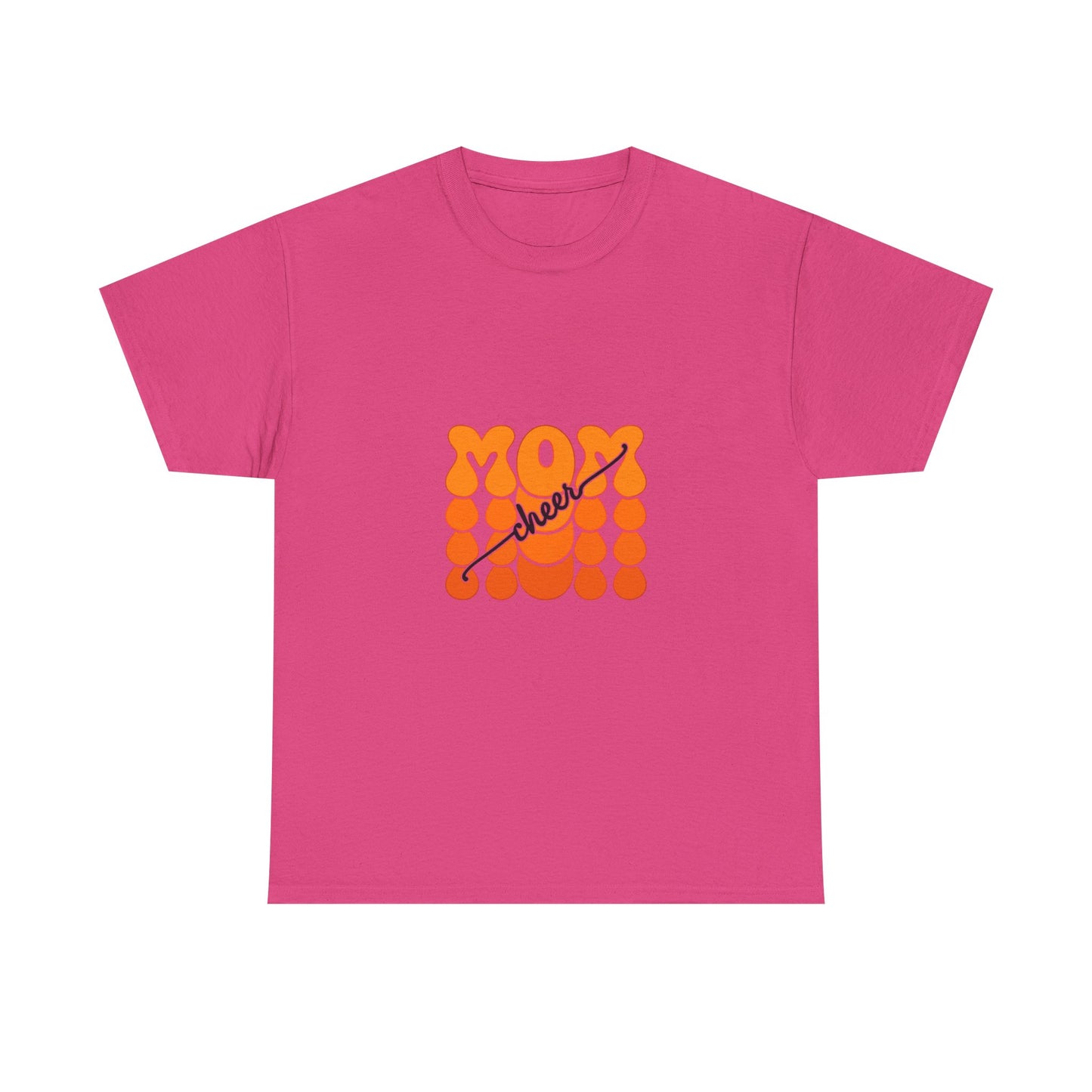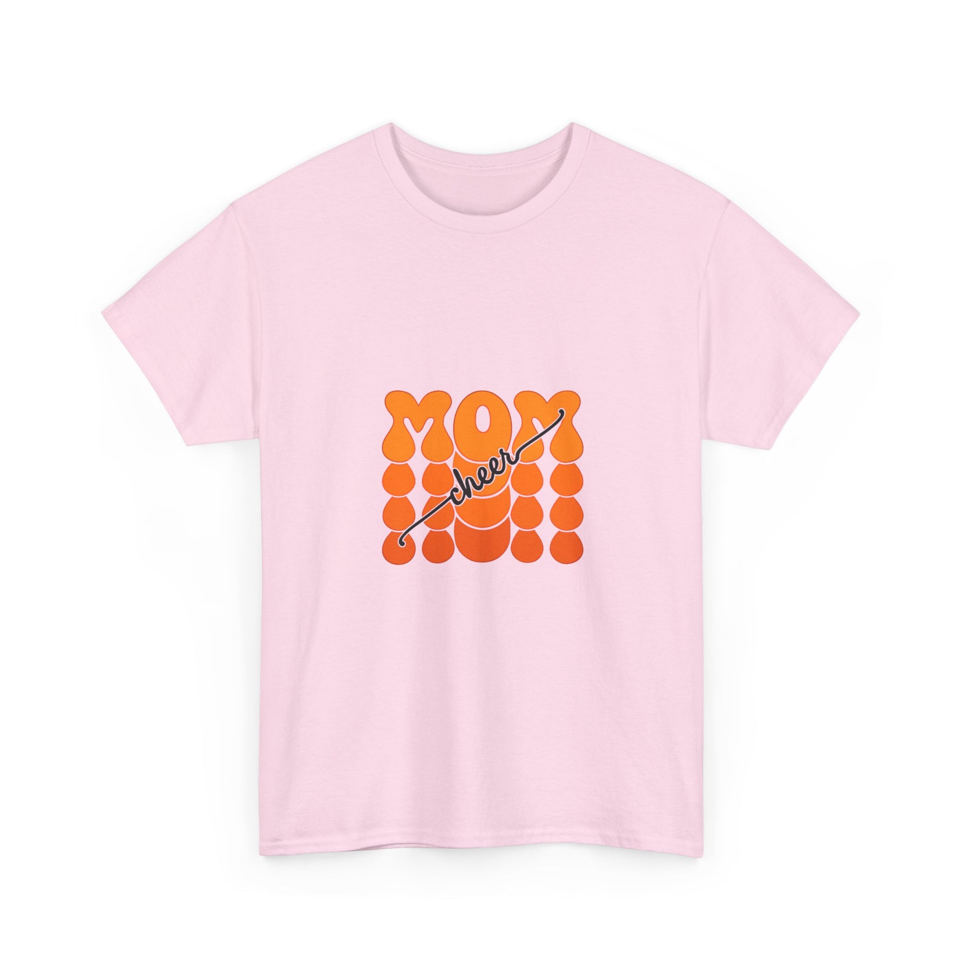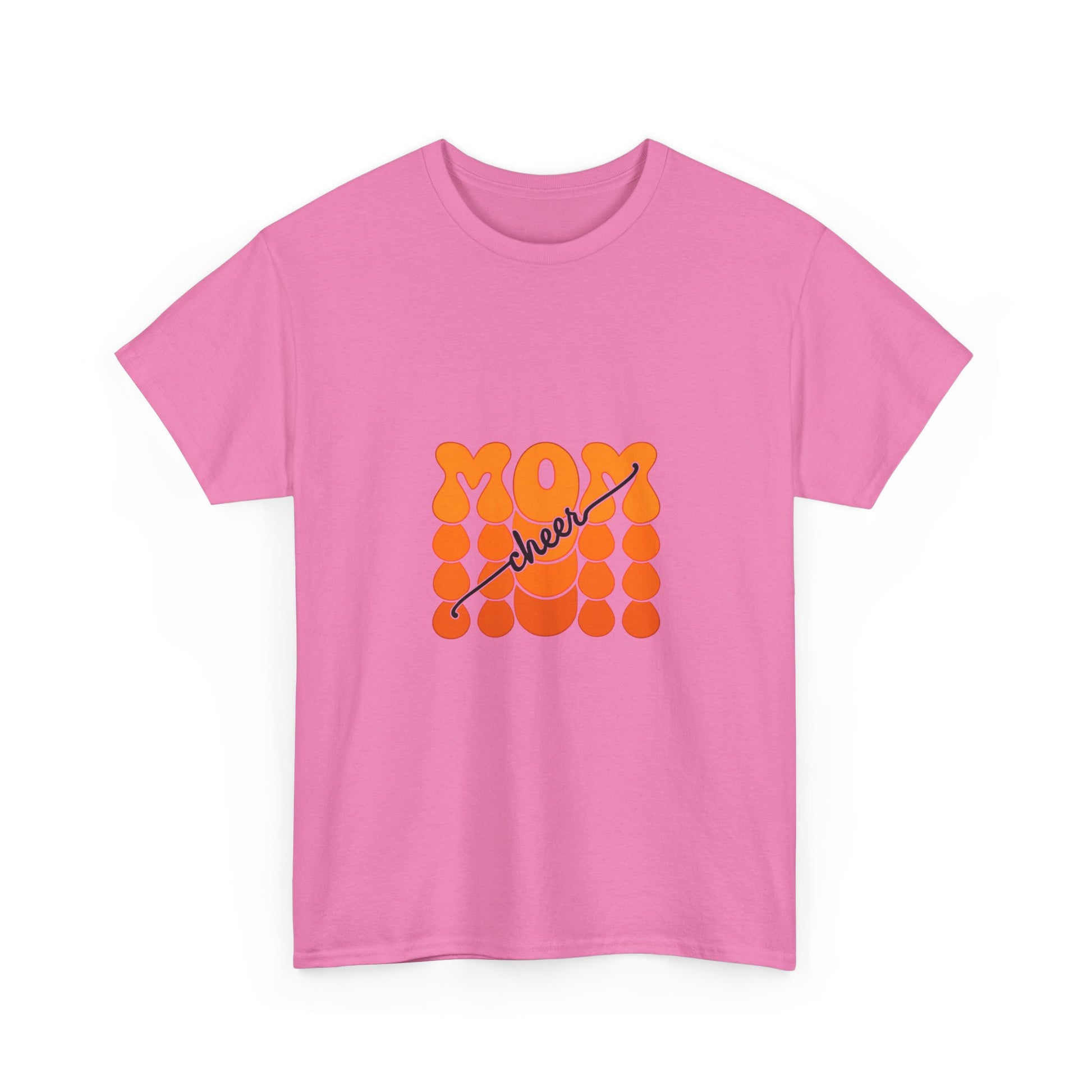 Show your support with this groovy "Mom Cheer" tee! Featuring a retro design with bold orange "MOM" letters and a flowing "cheer" script, this shirt is a perfect blend of style and support. The warm color palette and playful vibe make it a cheerful statement piece.