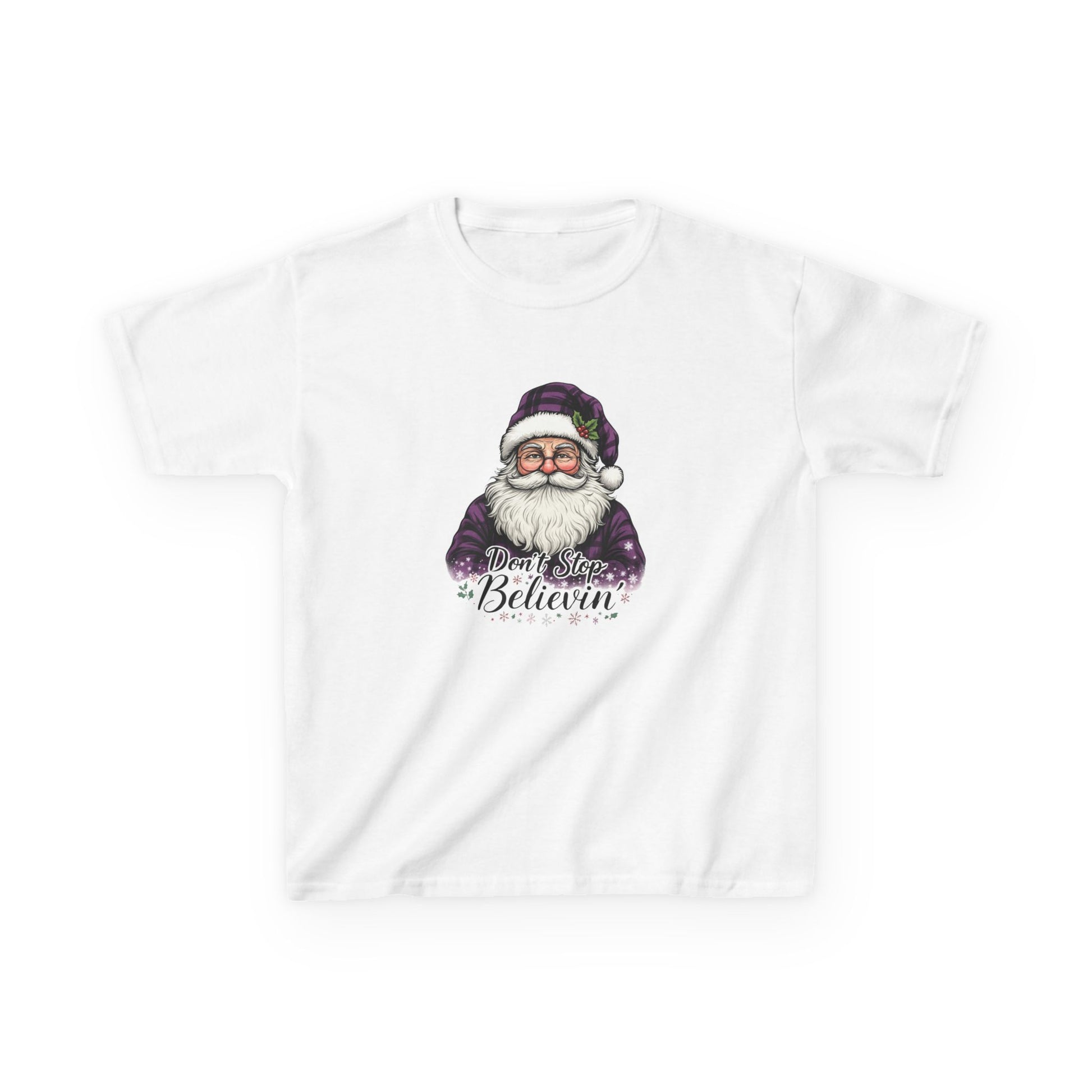 Spread holiday cheer with this adorable Santa Claus illustrated tee! Featuring a jolly Santa with a rosy nose and plaid pajamas, this shirt reminds everyone "Don't Stop Believin'" this Christmas. Perfect for kids who love dinosaurs and the magic of the season. It's a fun, festive, and comfortable addition to any holiday wardrobe, ideal for parties and creating lasting memories.