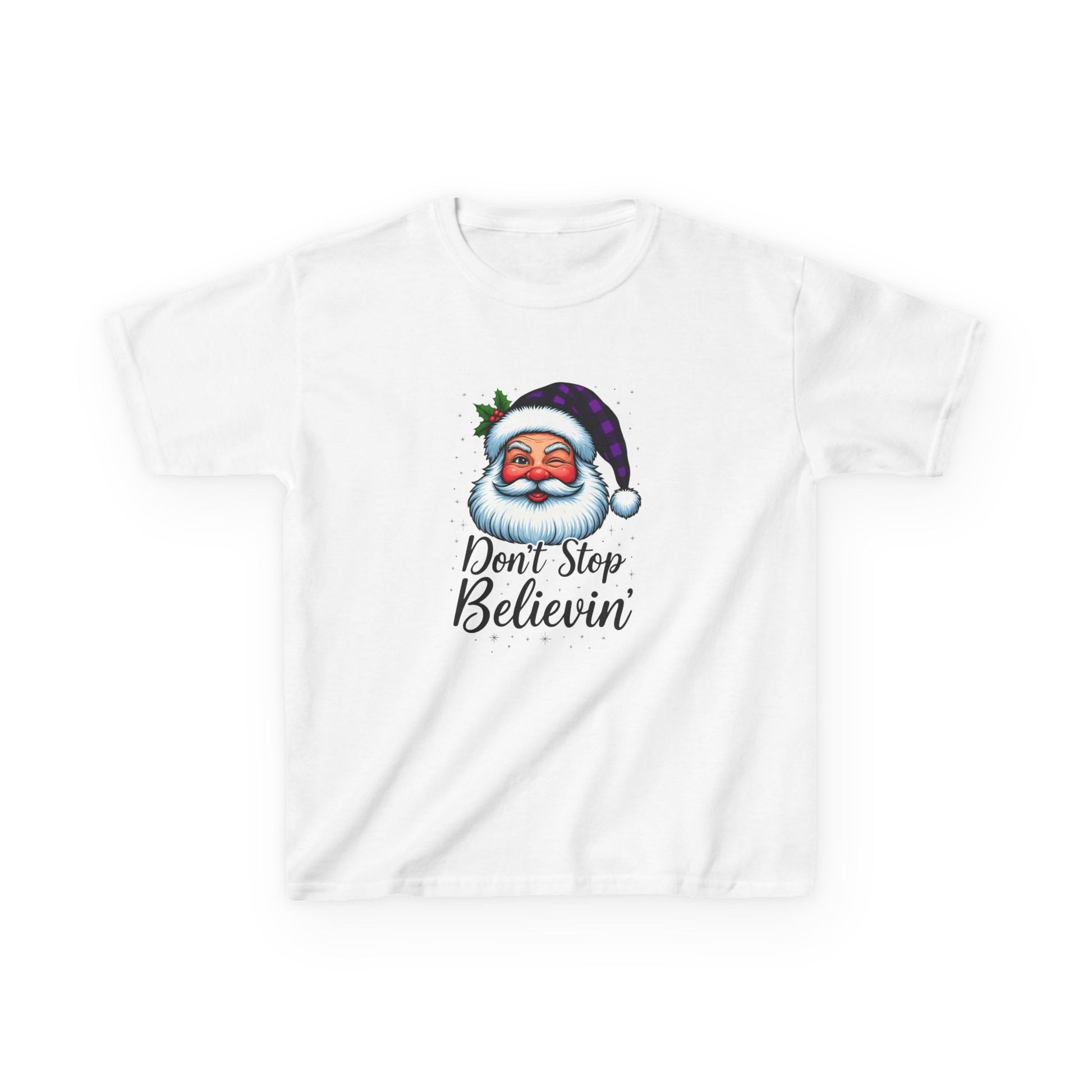 Spread holiday cheer with this adorable Santa Claus illustration! Featuring a joyful Santa face with a plaid hat and the inspiring phrase "Don't Stop Believin'", this tee combines vintage charm with a modern twist. Perfect for Christmas parties, family photos, or everyday wear, this fun graphic tee is sure to become a kid's favorite. Made from soft, comfortable fabric, it's the ideal gift for any young believer in the magic of Christmas.