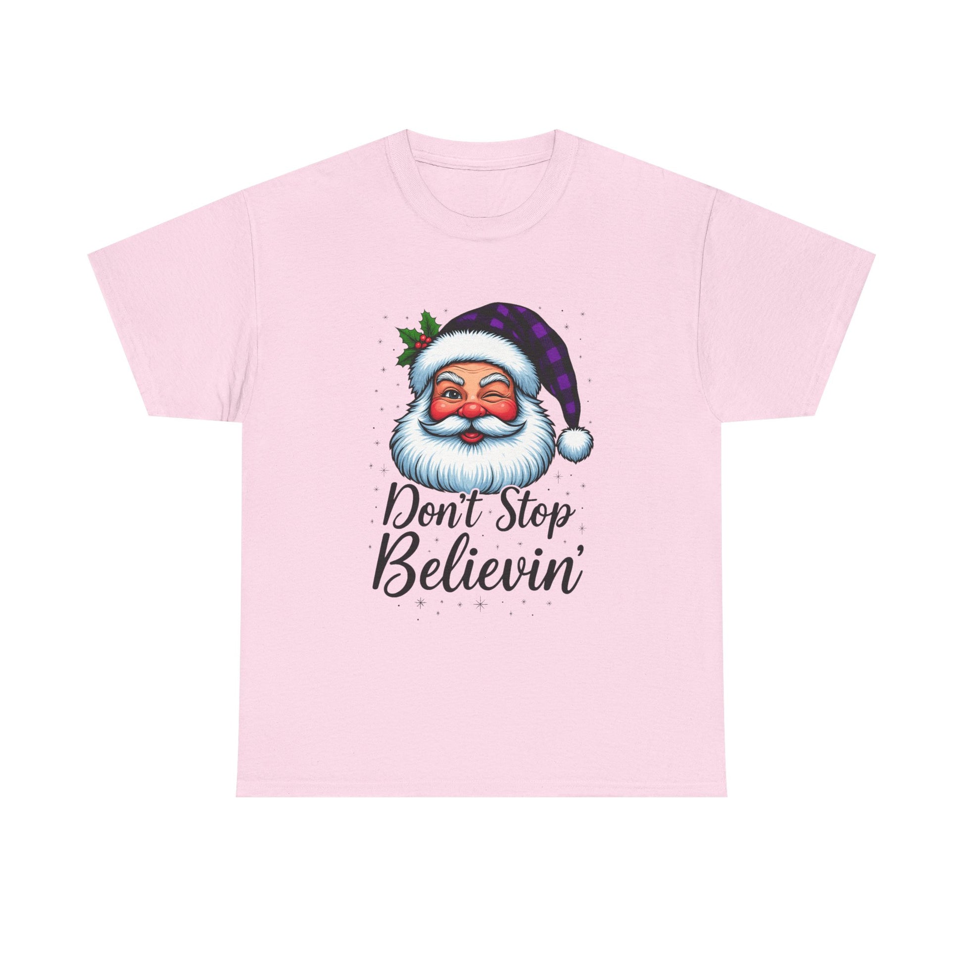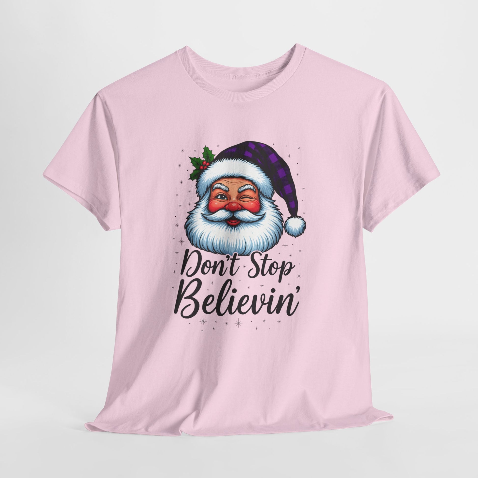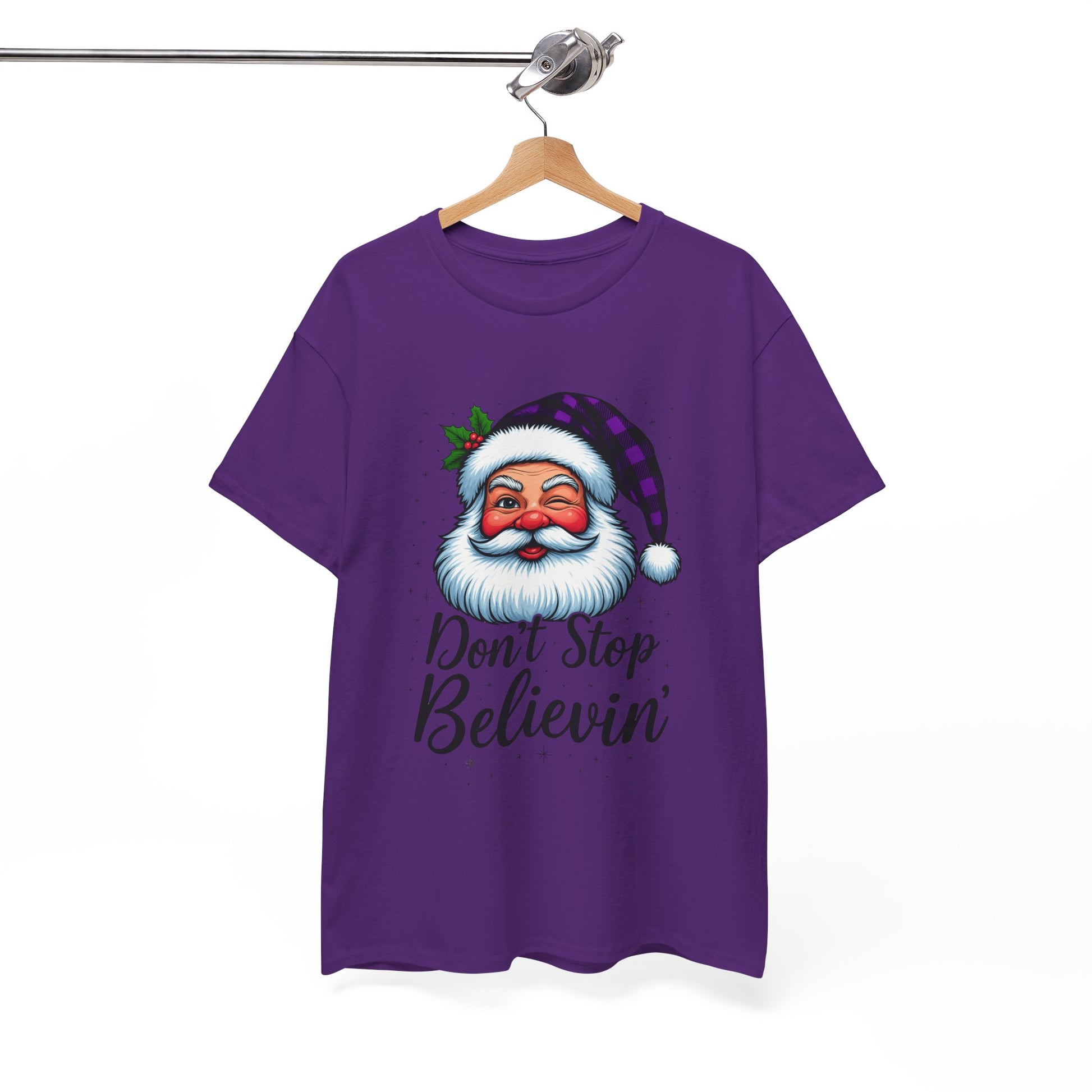 Spread holiday cheer with this festive tee. Featuring a cartoon Santa Claus winking with a purple plaid hat and a sprig of holly, alongside the empowering message "Don't Stop Believin'" in a playful cursive font. This comfortable unisex shirt is perfect for showing your support during the holiday season. A thoughtful gift for loved ones and a reminder to stay hopeful!