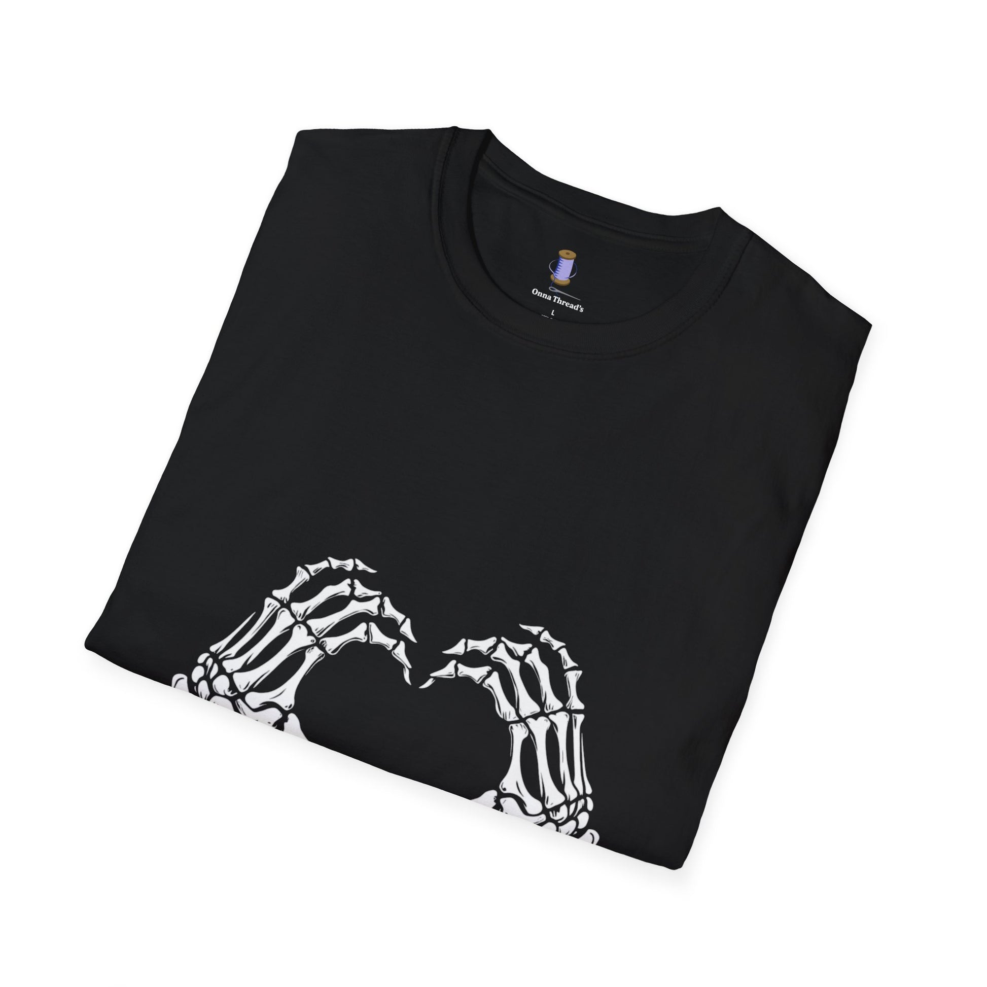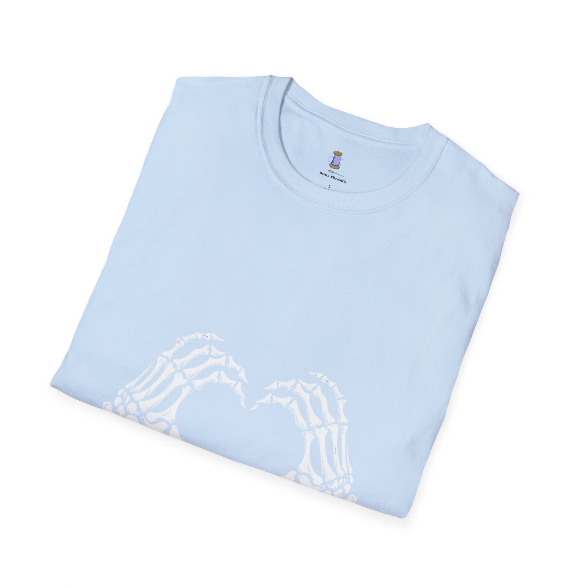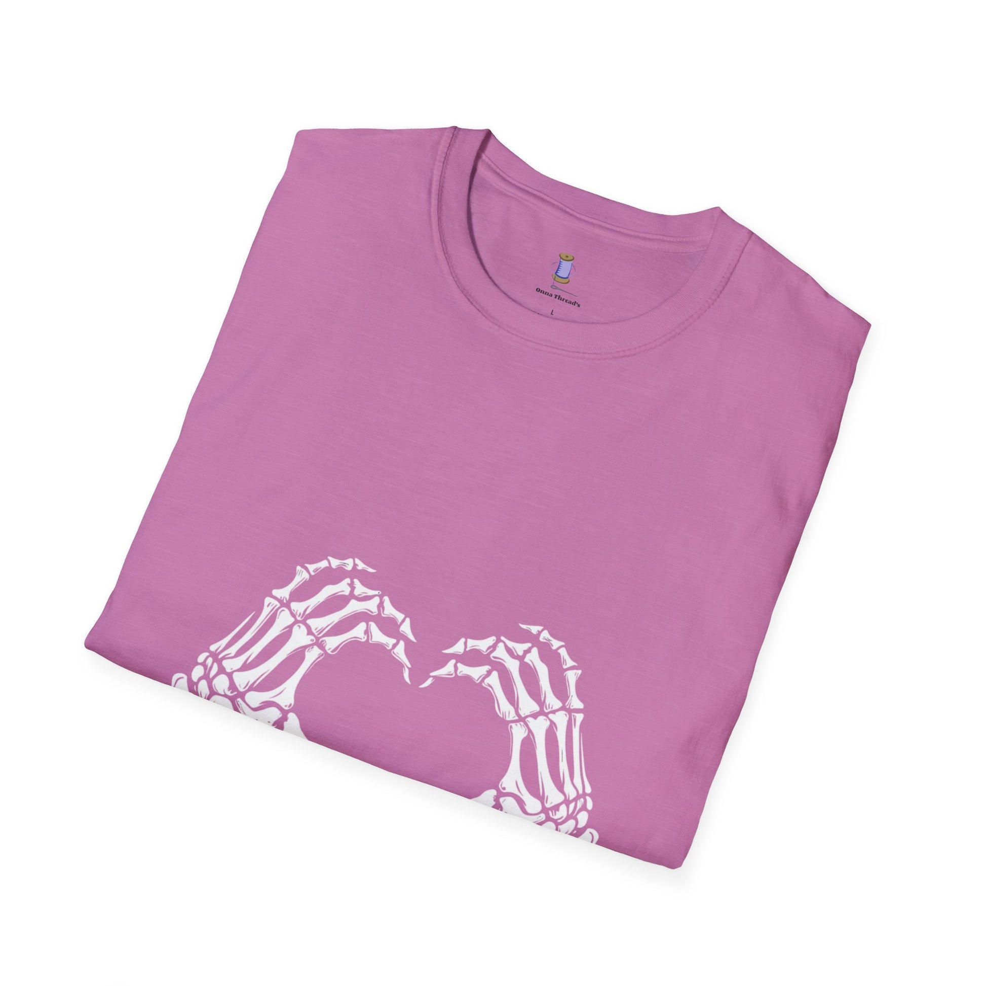 Embrace your unique style with this versatile unisex t-shirt. Featuring a playful skeleton hands heart design, this tee is perfect for expressing your individuality and love for life. Whether you’re dressing it up for a casual gathering or wearing it for a laid-back day at home, it seamlessly fits into your wardrobe. Ideal for those who appreciate quirky fashion, this t-shirt is great for Halloween, themed parties, or simply to make a statement any time of the year. Made for adults, it's a fantastic addition to gift-giving occasions such as birthdays or celebrations where fun and creativity are celebrated.