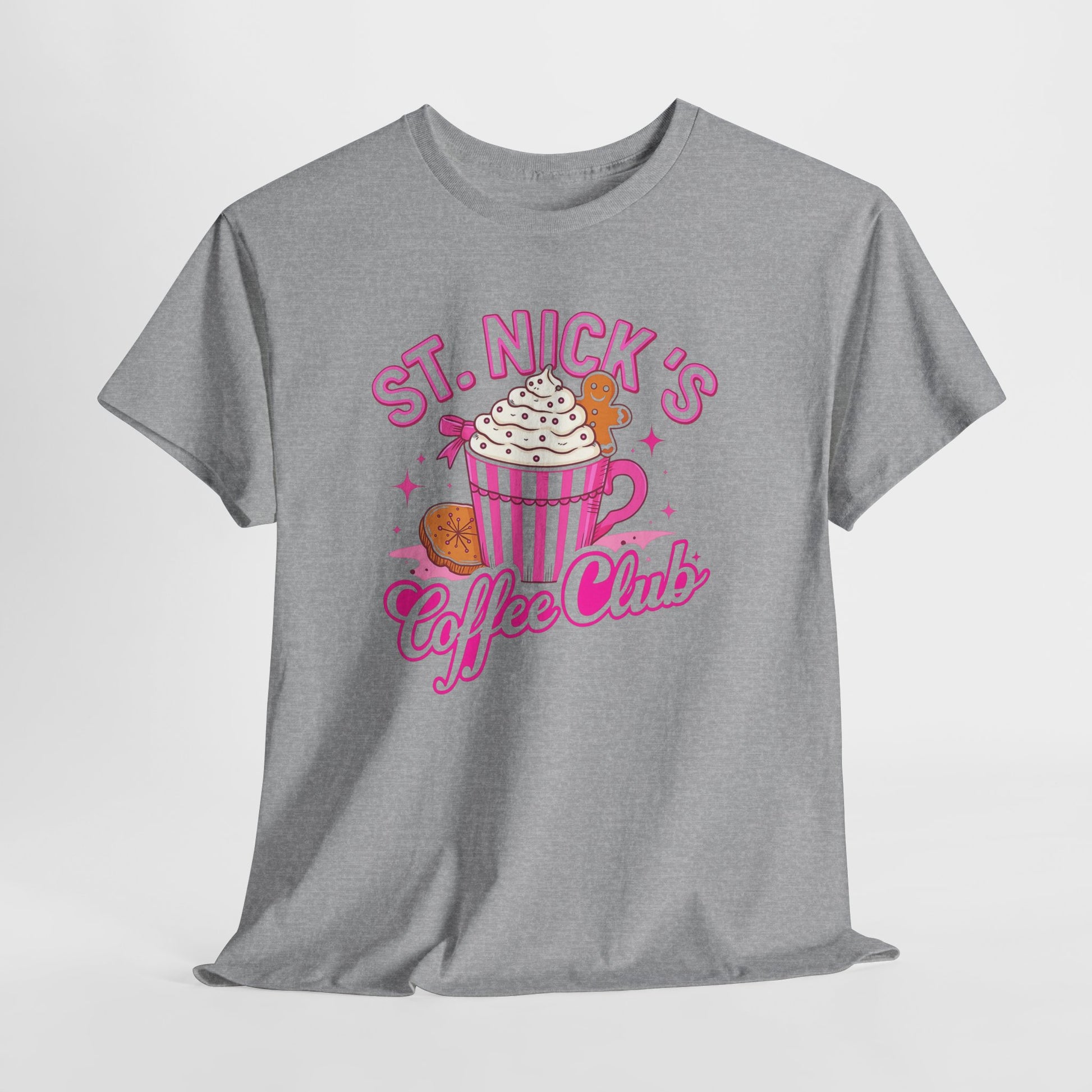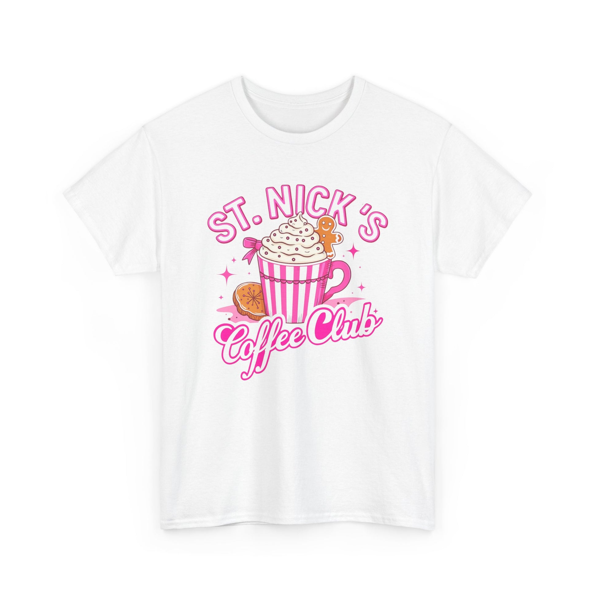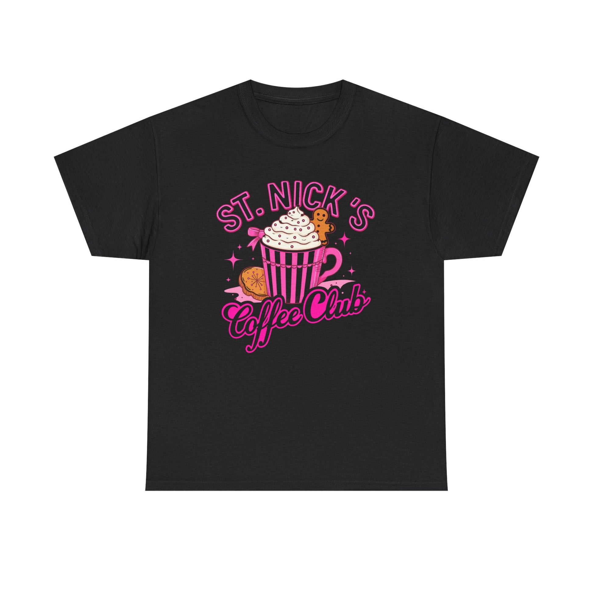 The St. Nick's Coffee Club tee is a vibrant, cartoon-style design features a festive coffee cup with whipped cream and a gingerbread man, all in pink.