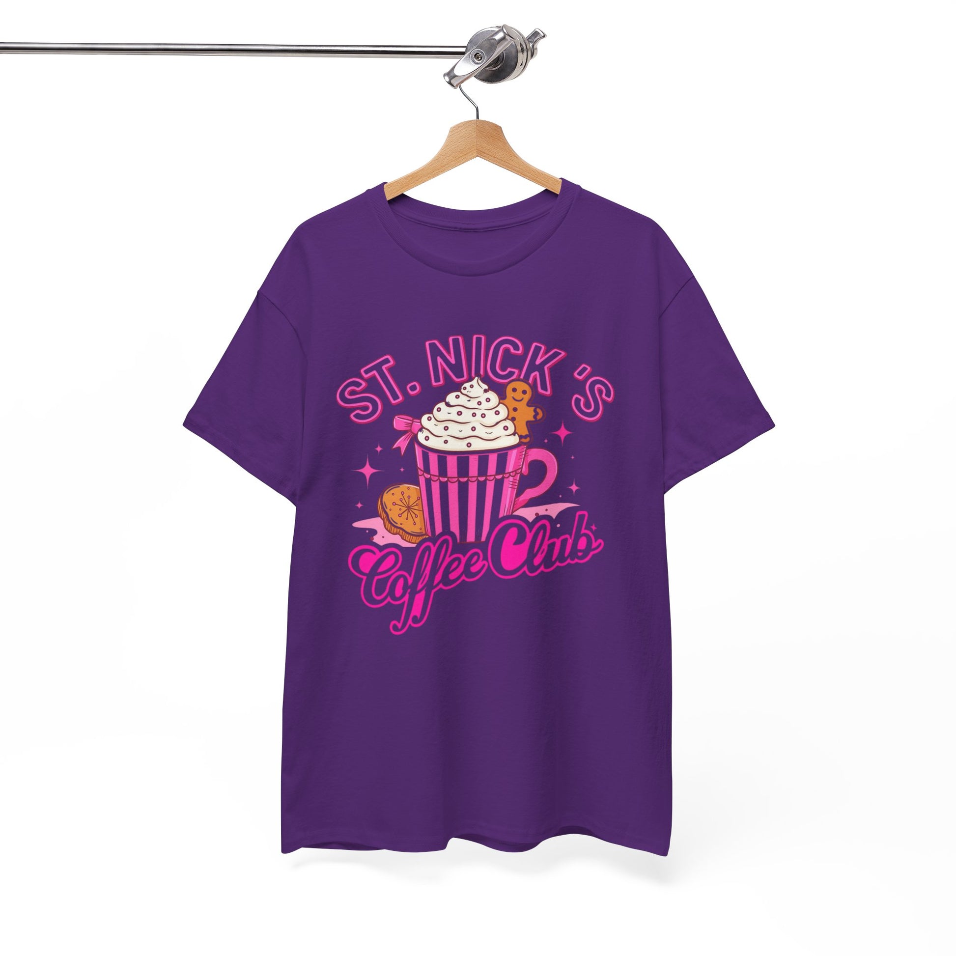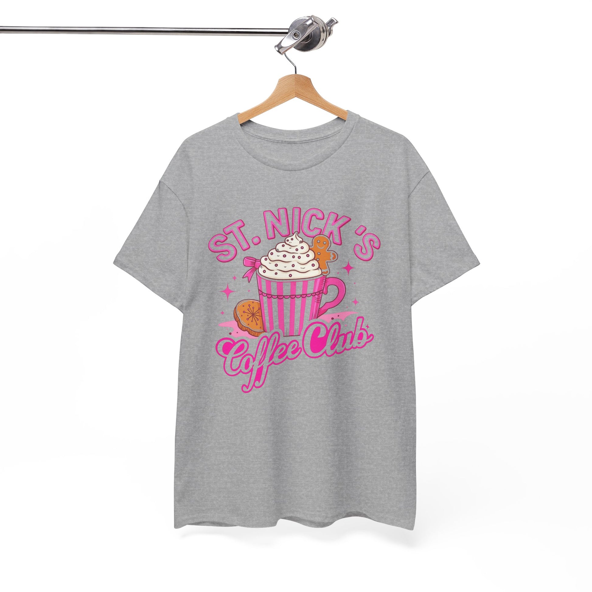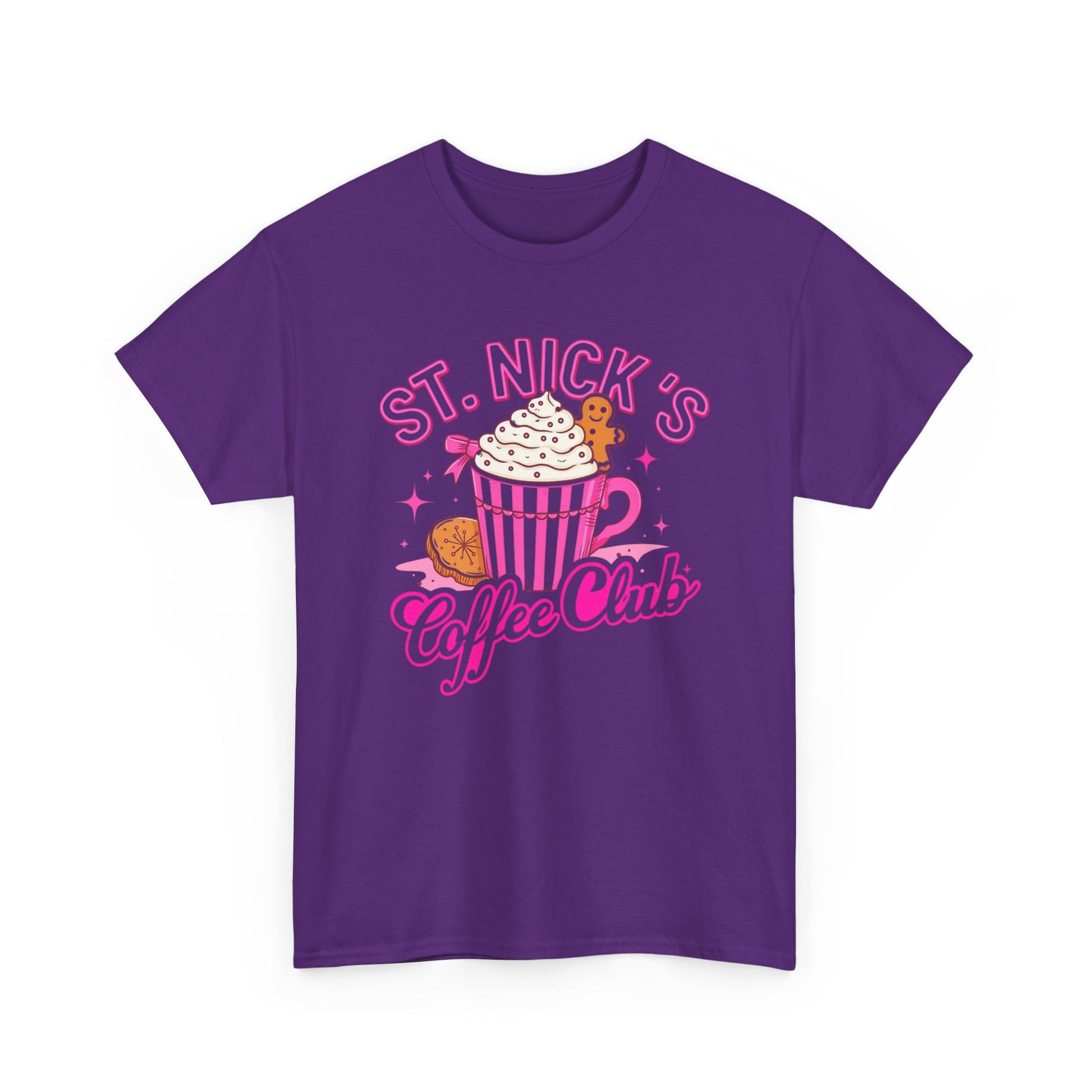 The St. Nick's Coffee Club tee is a vibrant, cartoon-style design features a festive coffee cup with whipped cream and a gingerbread man, all in pink.