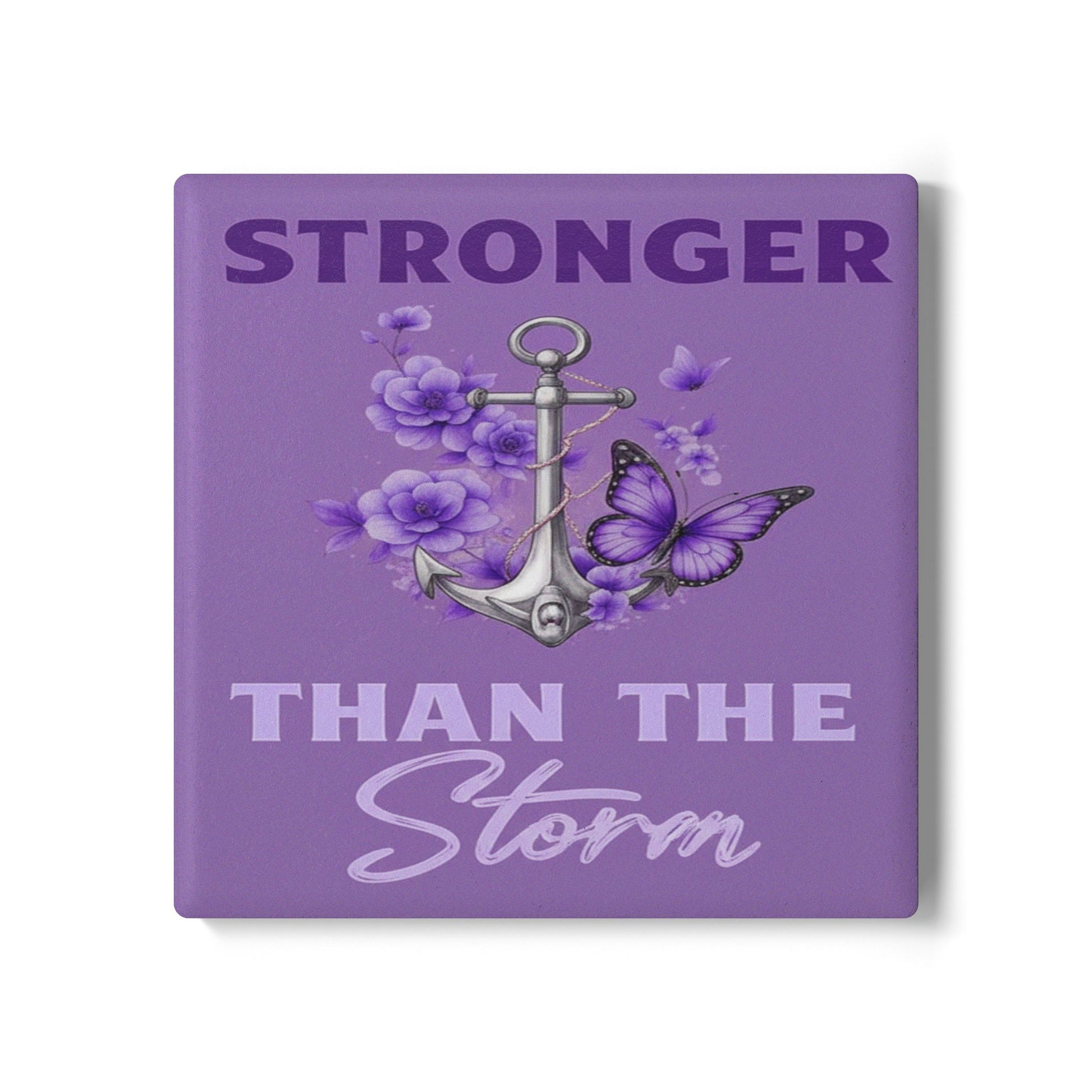 Stronger Than the Storm Square Ceramic Coaster Set – Purple Anchor & Butterfly Design