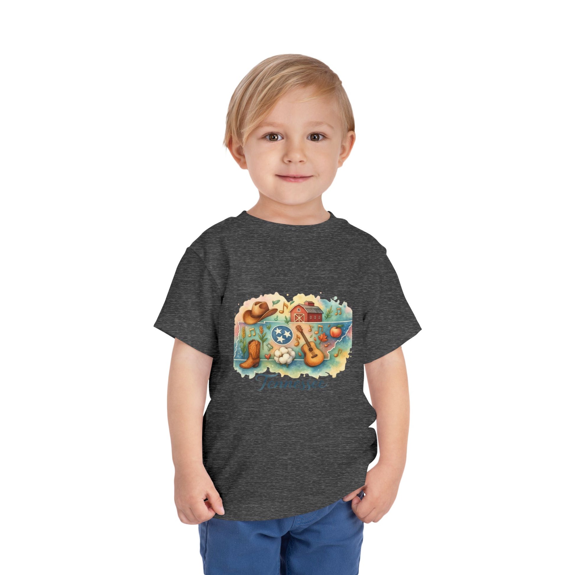 This adorable toddler tee features a vibrant watercolor illustration of Tennessee, complete with state symbols and musical notes. Perfect for young children who love the state or music. Great for family vacations, holidays, or casual wear.