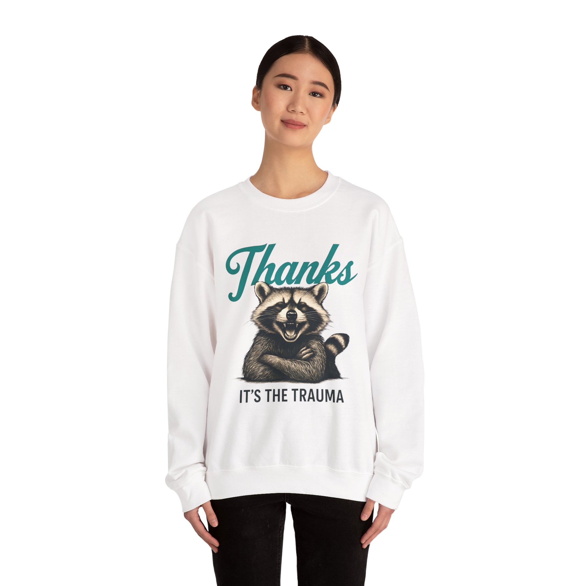Embrace the irony this Halloween with our 'Thanks It's The Trauma' sweatshirt! Featuring a detailed, vintage-style illustration of a smug raccoon, playfully crossing its arms, paired with the phrase 'Thanks' in elegant cursive and 'IT'S THE TRAUMA' in bold text. This unique design is perfect for anyone who appreciates dark humor and a touch of cynicism. Crafted with soft, high-quality materials, this sweatshirt is comfortable enough for all-day wear, making it ideal for Halloween parties or everyday wear.