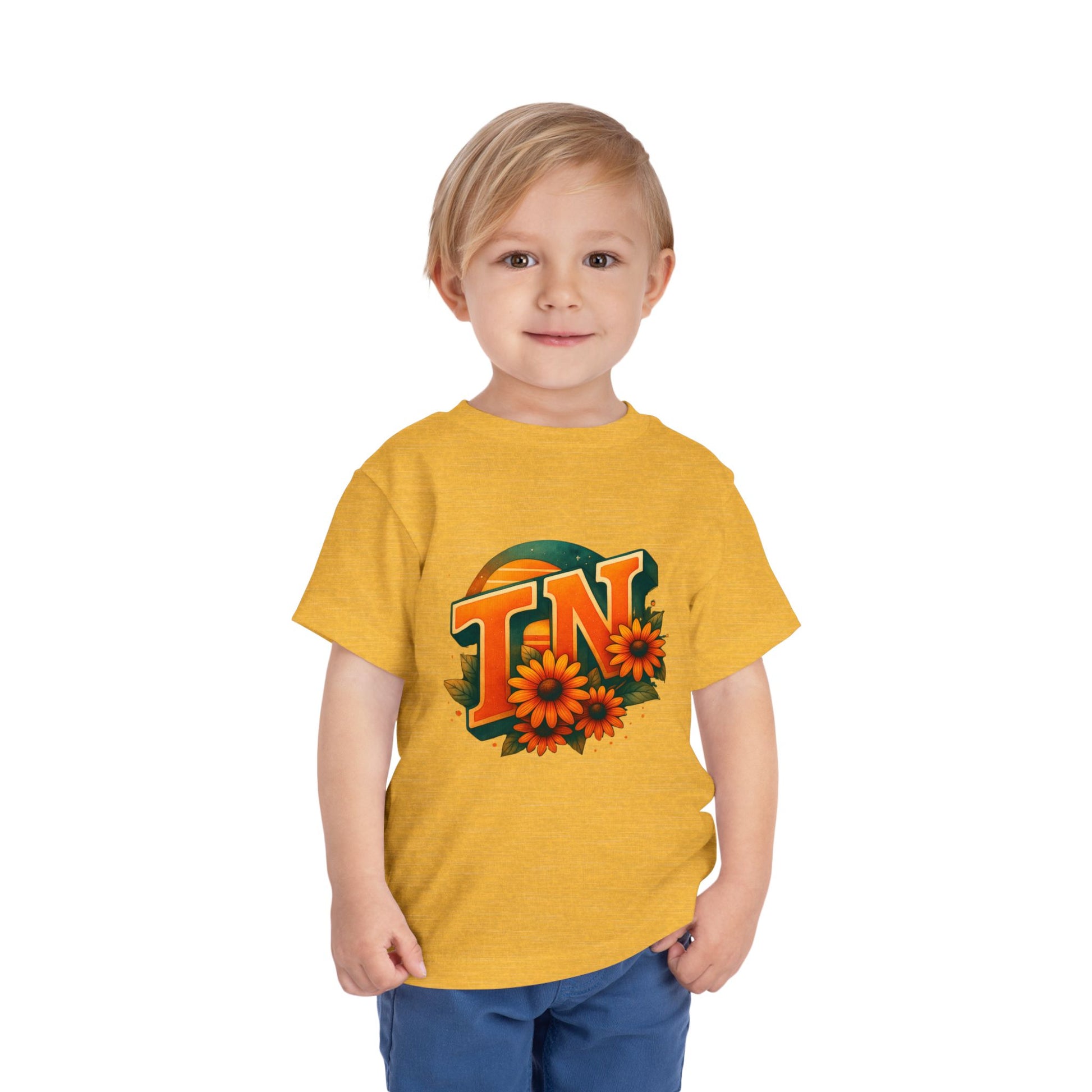 This adorable toddler tee features a vibrant 'TN' design with sunflowers, a sunset motif, and a touch of vintage charm. Perfect for parents looking for a cute and stylish outfit for their little ones. Great for summer outings, family gatherings, and photoshoots.