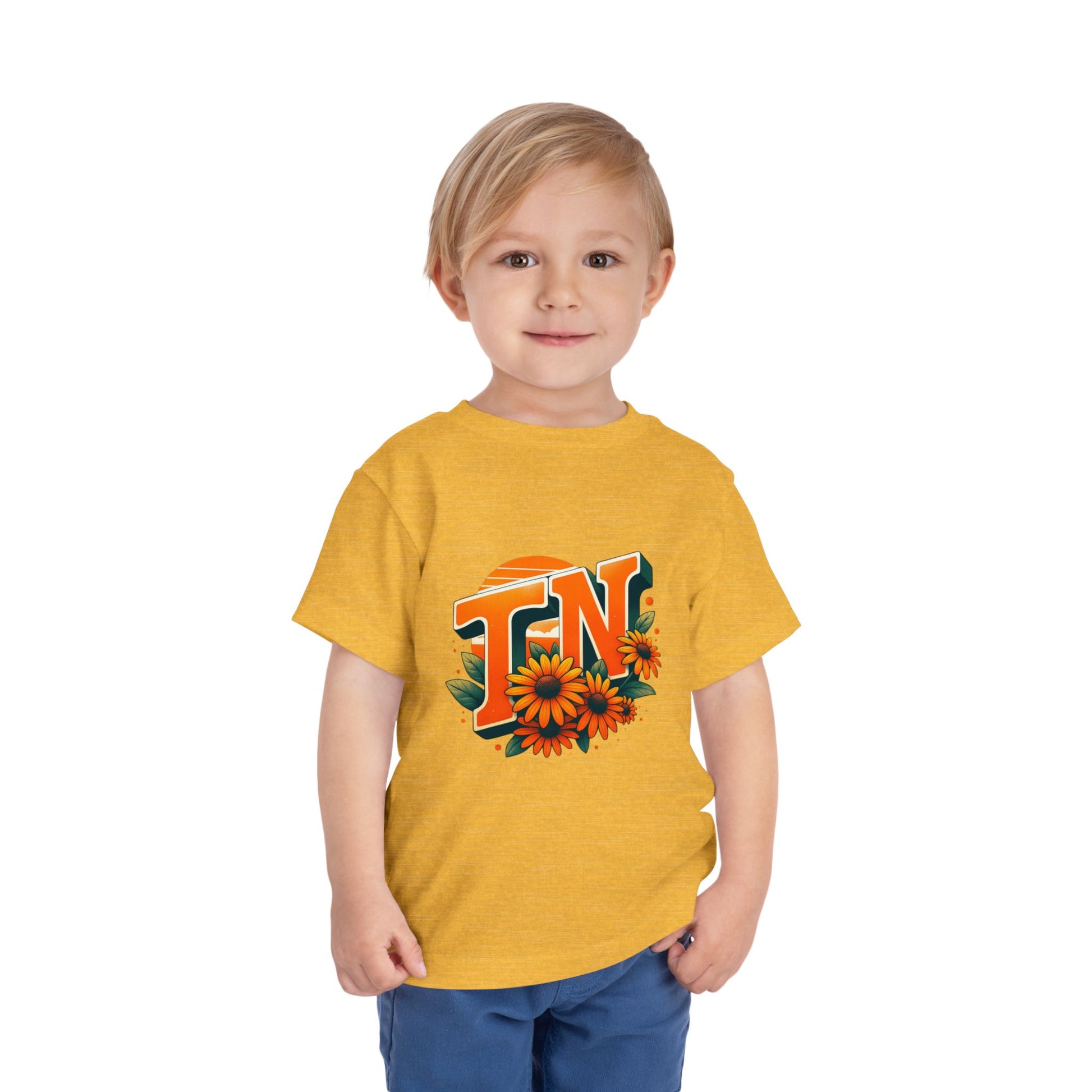 Celebrate the warmth and wild beauty of Tennessee with the TN Sunset Bloom Tee. This crisp white shirt showcases bold orange and green “TN” lettering set against a radiant sunset backdrop. Surrounding the design are three vibrant orange flowers with lush green leaves, evoking the charm of summer fields and southern skies. Perfect for kids who love nature, color, and a splash of state pride, this tee brings playful energy to everyday wear.