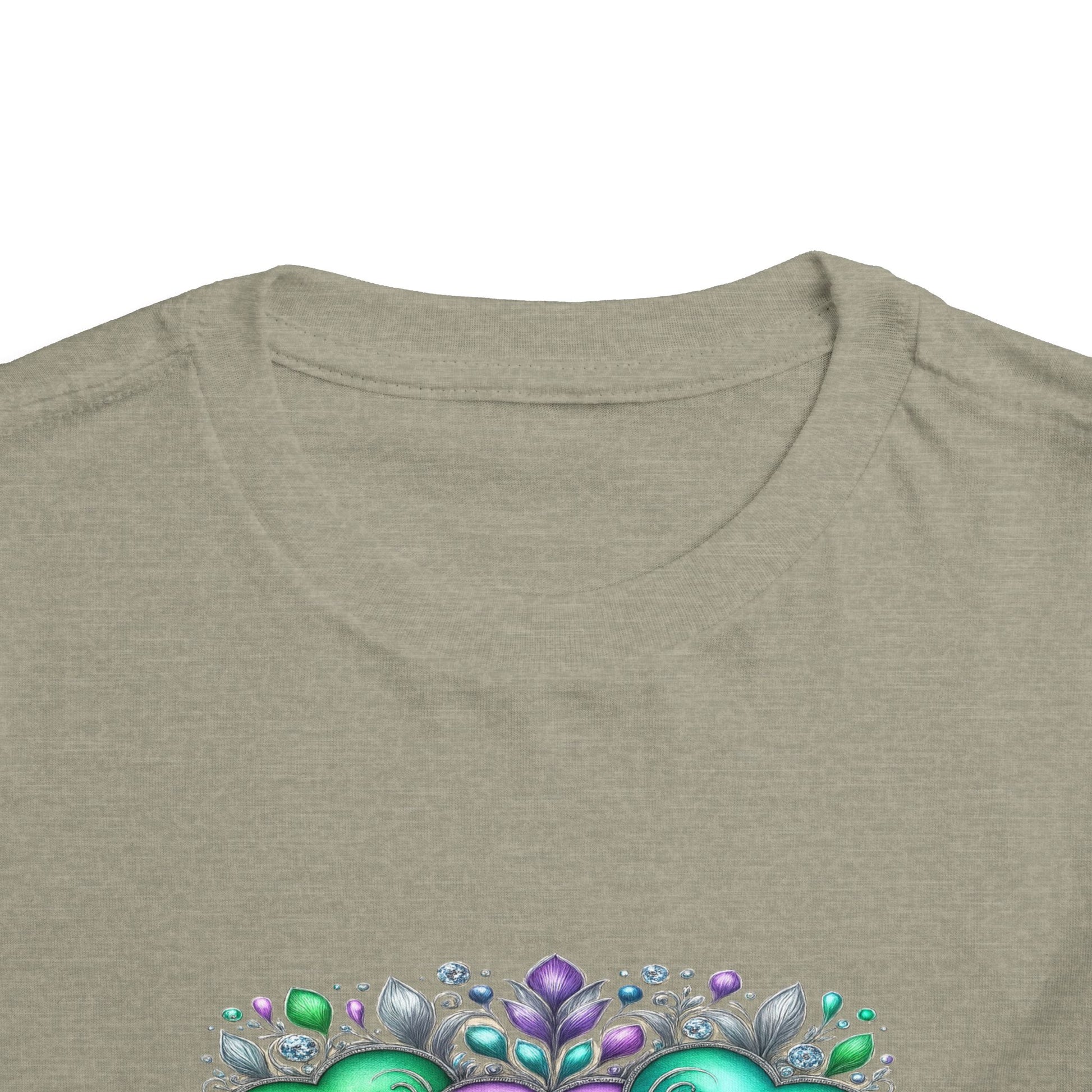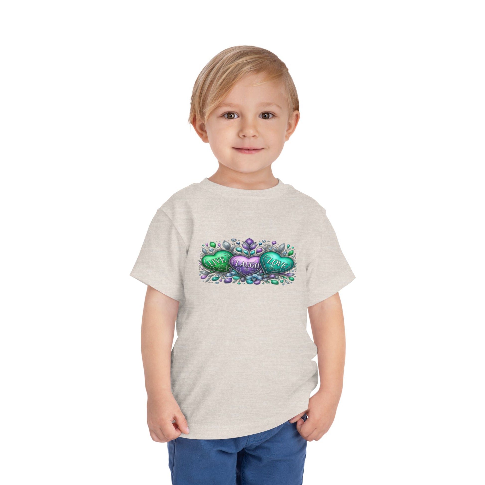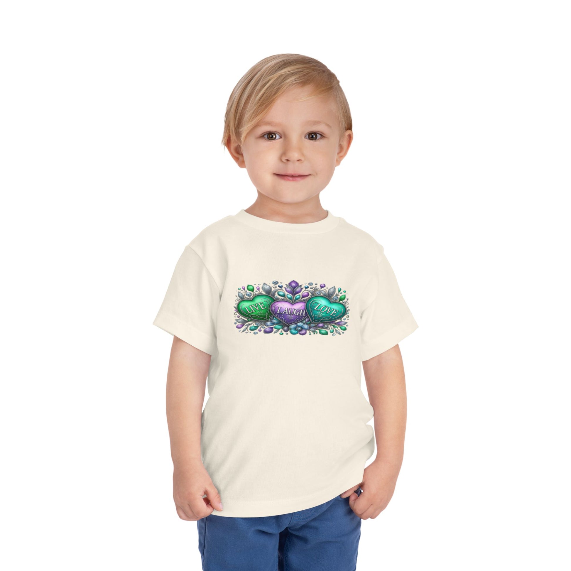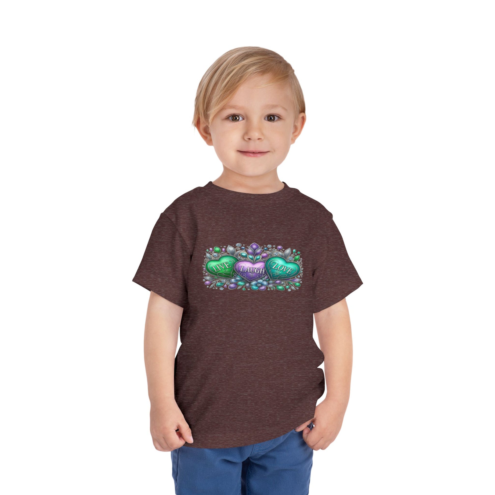 An adorable toddler tee featuring a heartwarming "Live Laugh Love" design with festive floral and gem elements. Perfect for little ones to spread positivity and joy during family gatherings, birthdays, and holidays.
