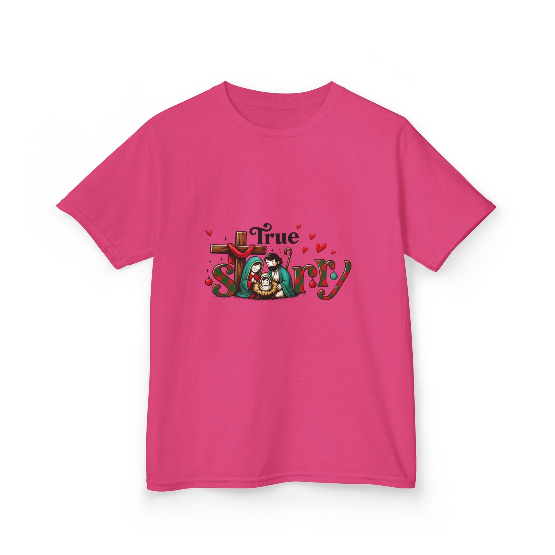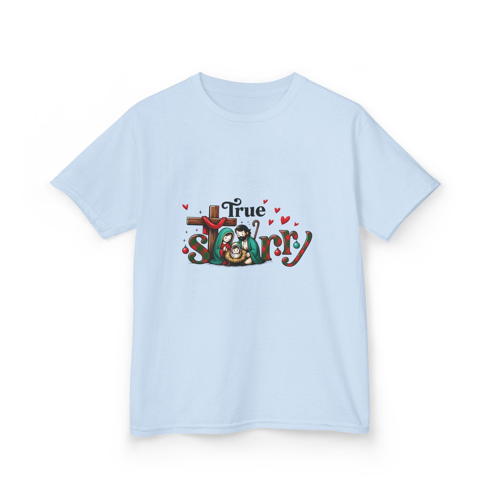 Celebrate Christmas with this adorable True Story tee! Featuring a festive Nativity scene with Mary, Joseph, and baby Jesus, it's a joyful blend of faith and fun. The 'Story' text is playfully designed with a Christmas plaid pattern. Perfect for kids who love dinosaurs and Christmas! This cute graphic tee is a great holiday gift.