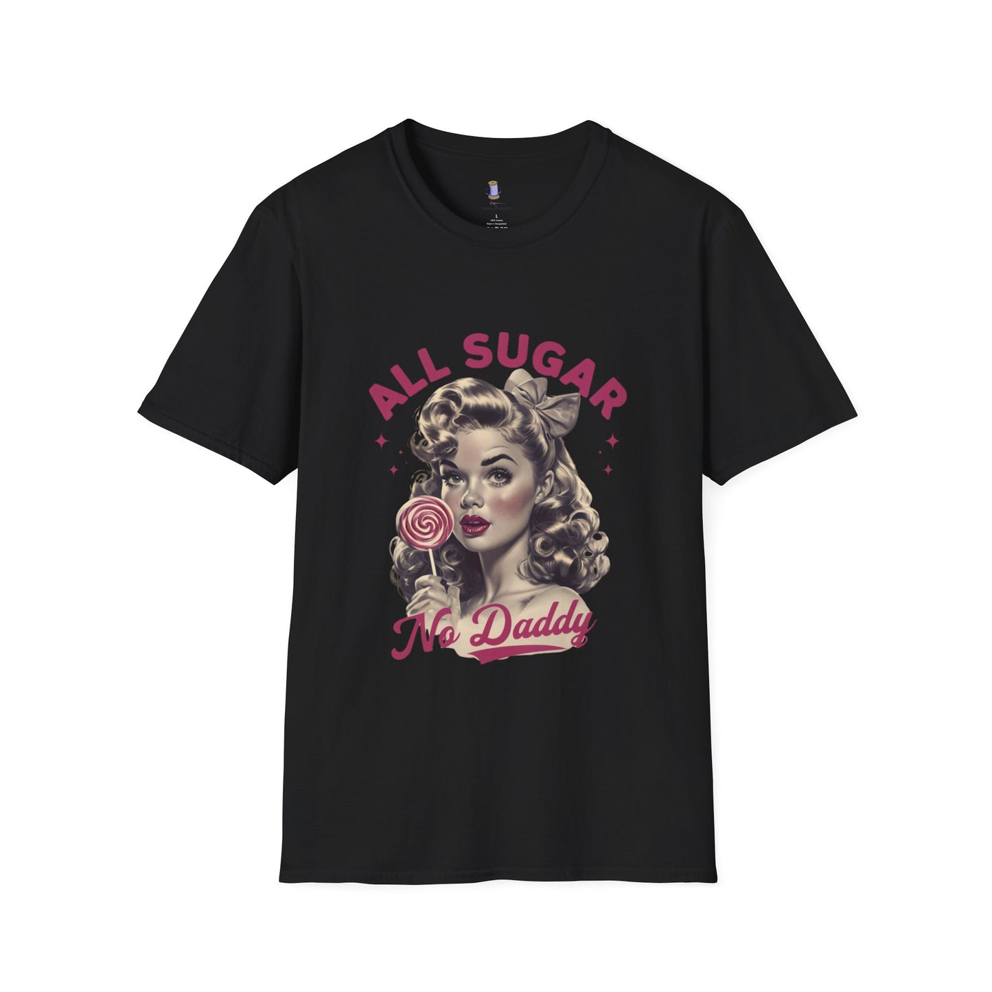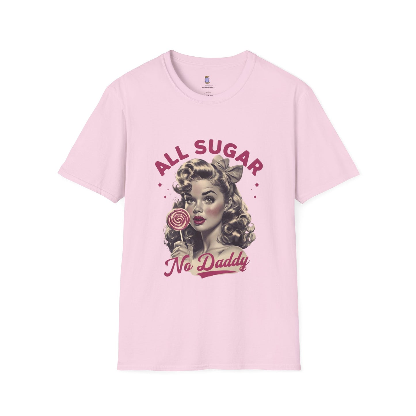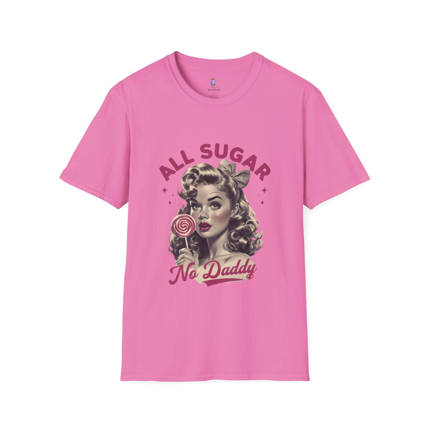 A graphic tee that says 'all sugar no daddy', perfect for those who appreciate a playful and edgy style. This unisex softstyle t-shirt is made from high-quality ring-spun cotton, providing durability and comfort. It is ideal for casual wear and can be a fun addition to your wardrobe. This shirt is suitable for adults and is great for casual outings, parties, or everyday wear.