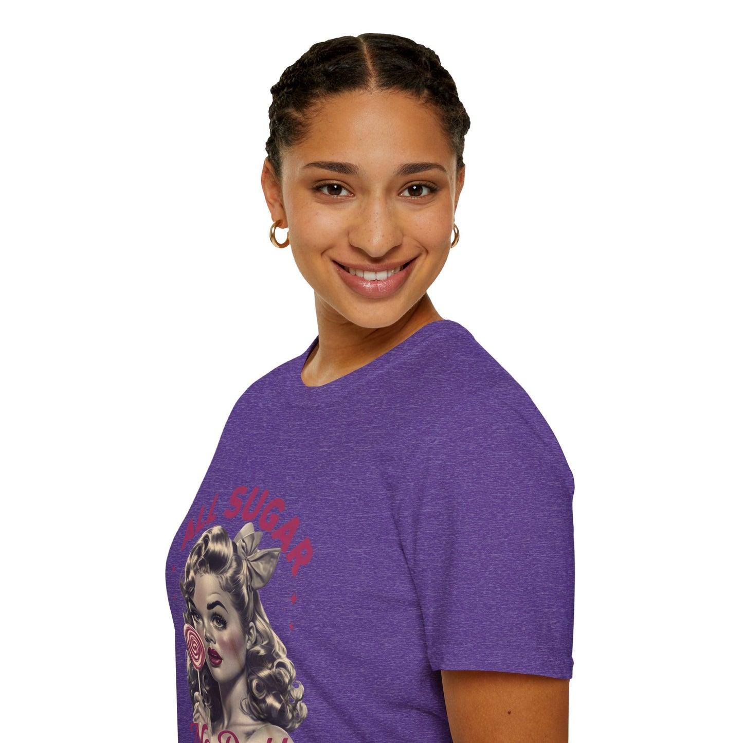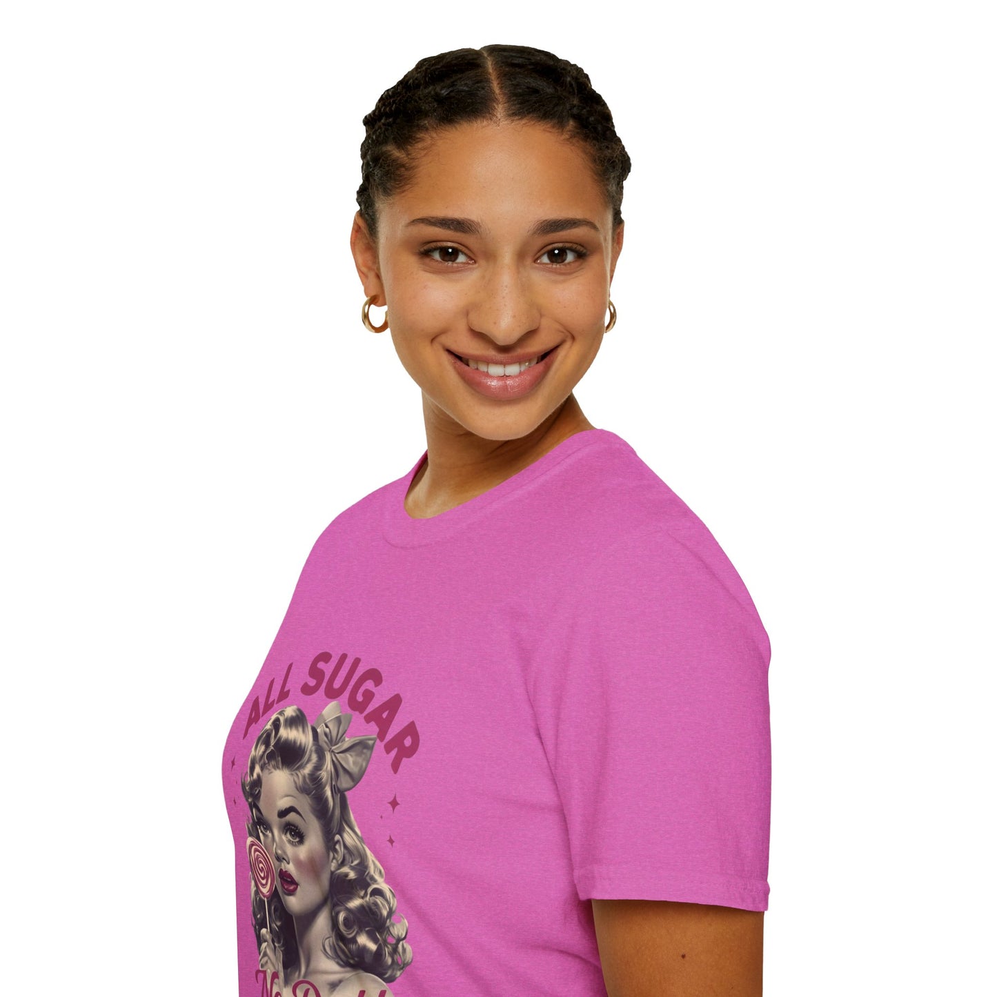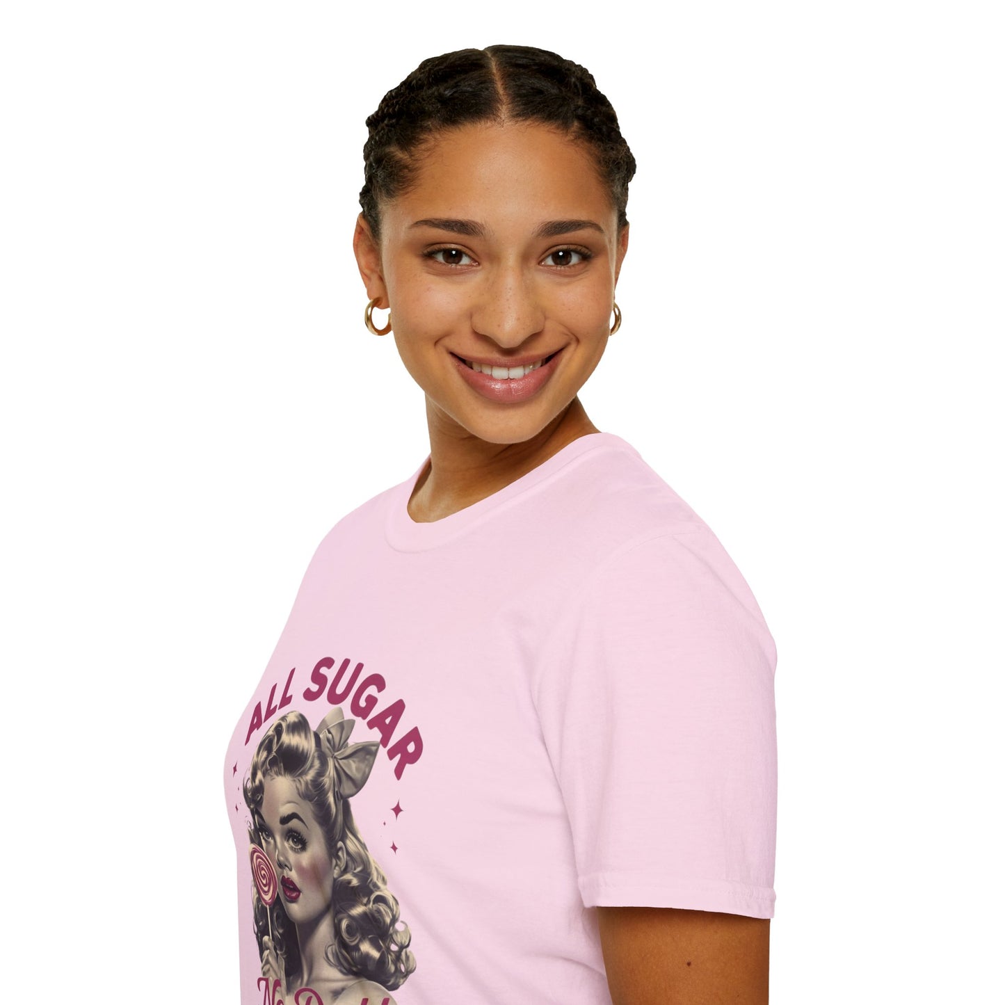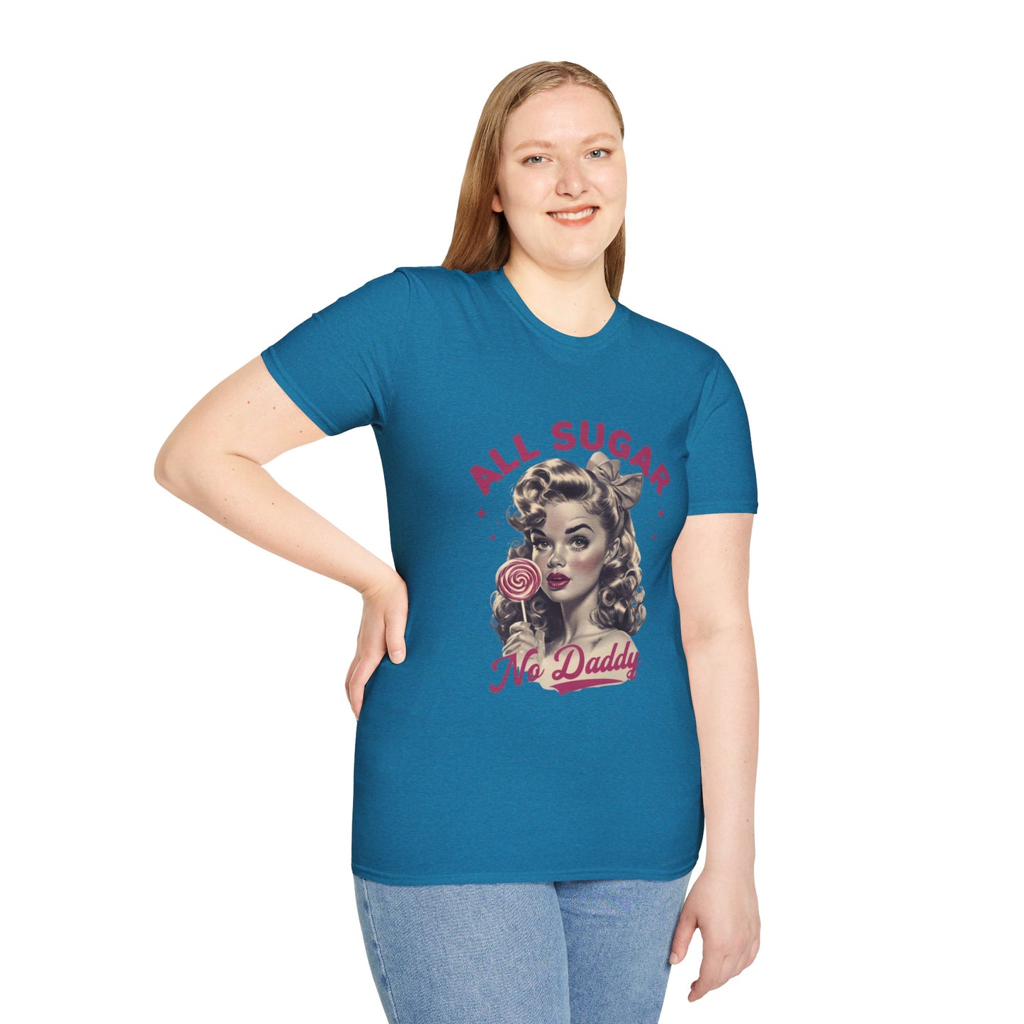 A graphic tee that says 'all sugar no daddy', perfect for those who appreciate a playful and edgy style. This unisex softstyle t-shirt is made from high-quality ring-spun cotton, providing durability and comfort. It is ideal for casual wear and can be a fun addition to your wardrobe. This shirt is suitable for adults and is great for casual outings, parties, or everyday wear.