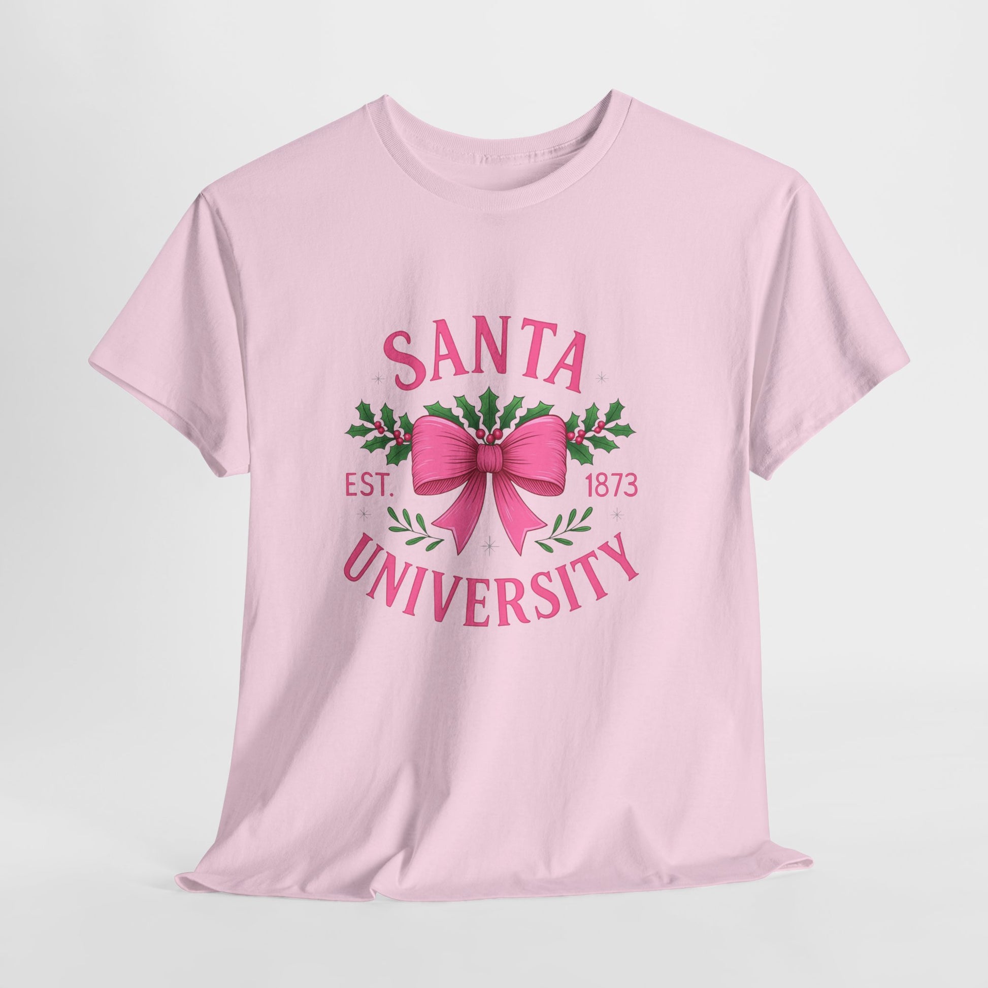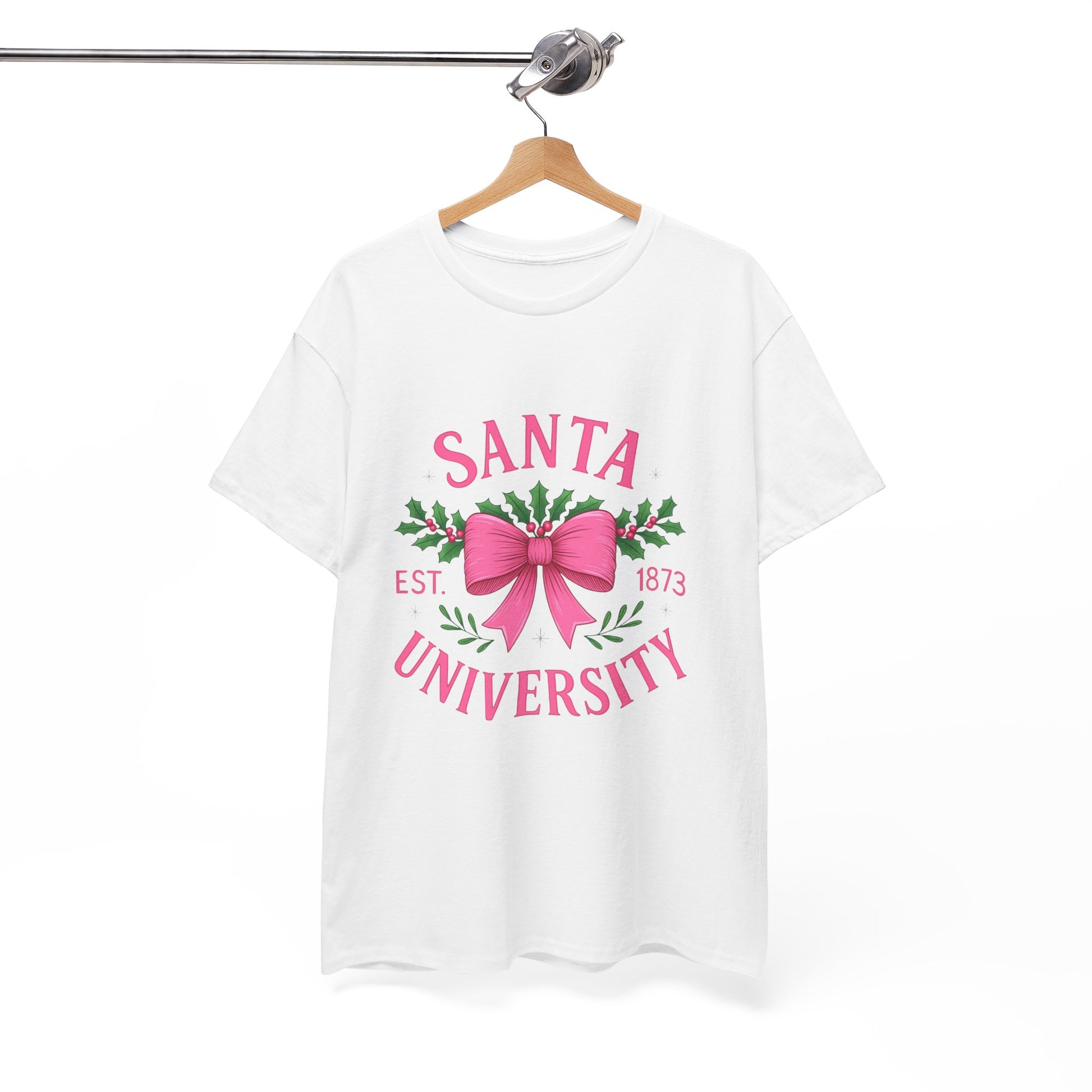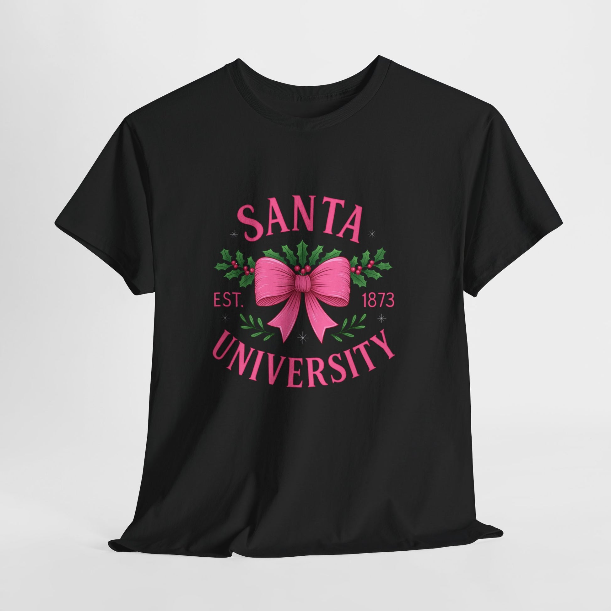 Vintage-inspired tee featuring a vibrant pink bow, holly accents, and the words 'SANTA UNIVERSITY EST 1873'. Perfect for adding a festive touch to your holiday wardrobe. Ideal for adults looking for a unique and whimsical holiday tee.