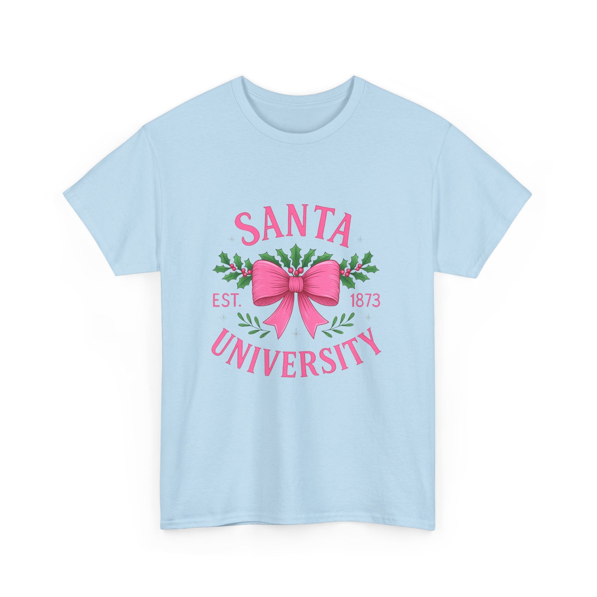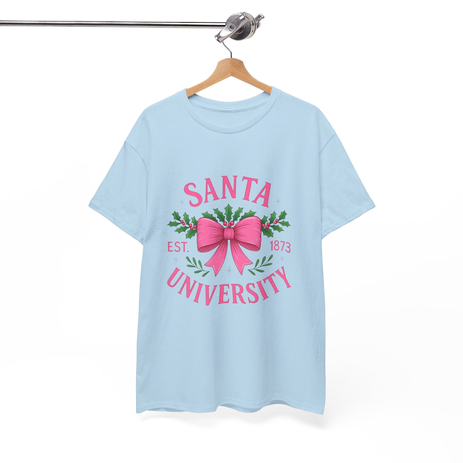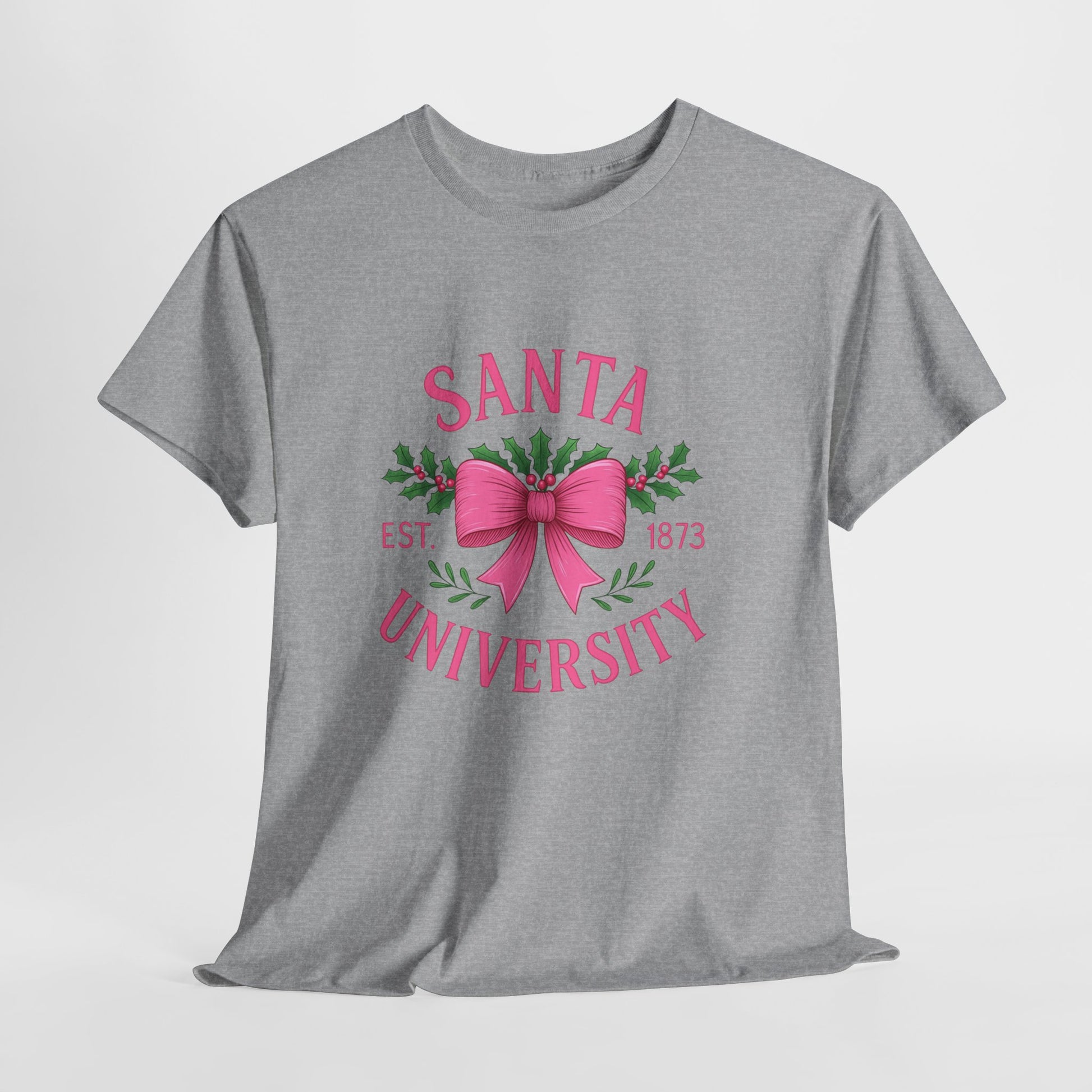 Vintage-inspired tee featuring a vibrant pink bow, holly accents, and the words 'SANTA UNIVERSITY EST 1873'. Perfect for adding a festive touch to your holiday wardrobe. Ideal for adults looking for a unique and whimsical holiday tee.