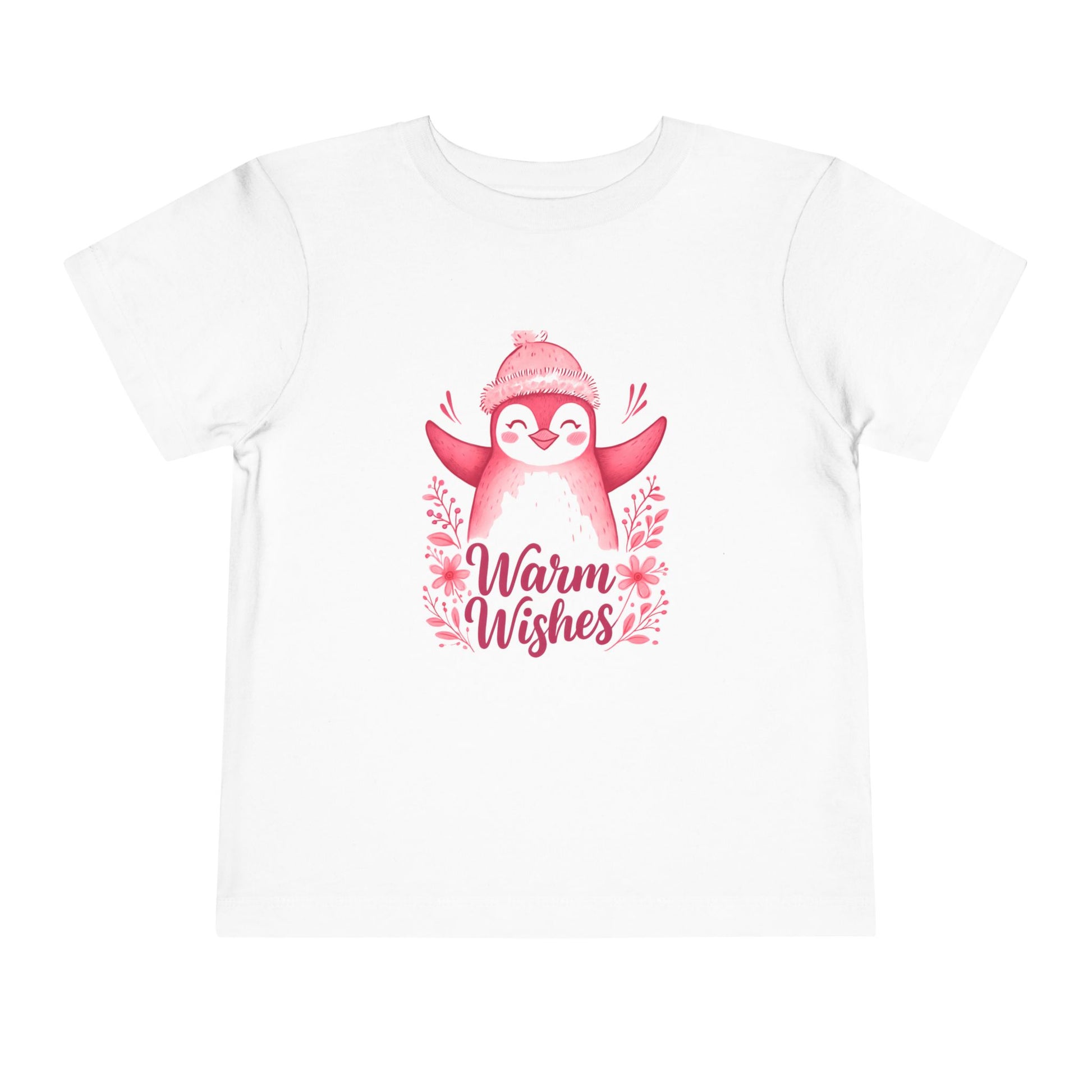 Spread holiday cheer with this adorable toddler Christmas tee! Featuring a charming watercolor penguin offering 'Warm Wishes' and surrounded by festive floral accents. Crafted with soft, comfortable fabric perfect for holiday adventures.